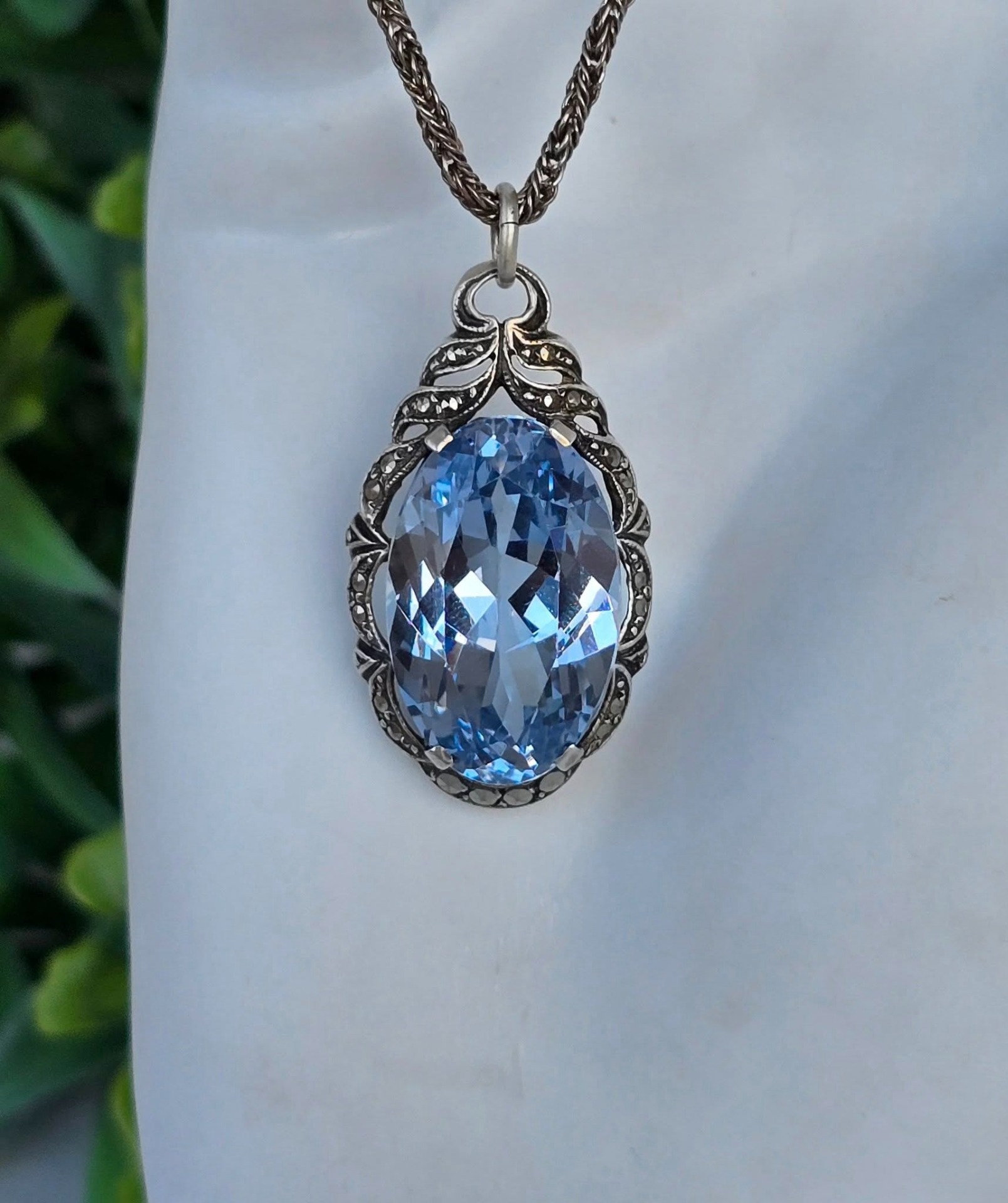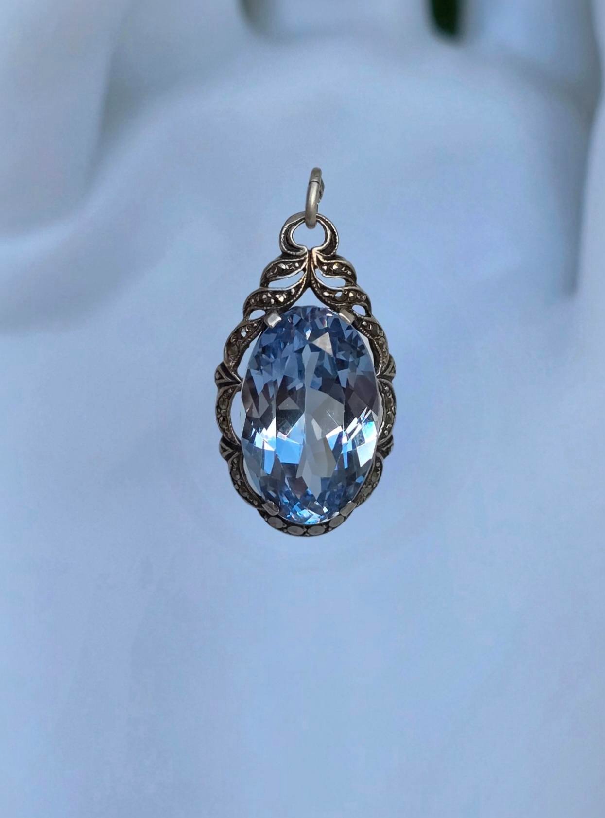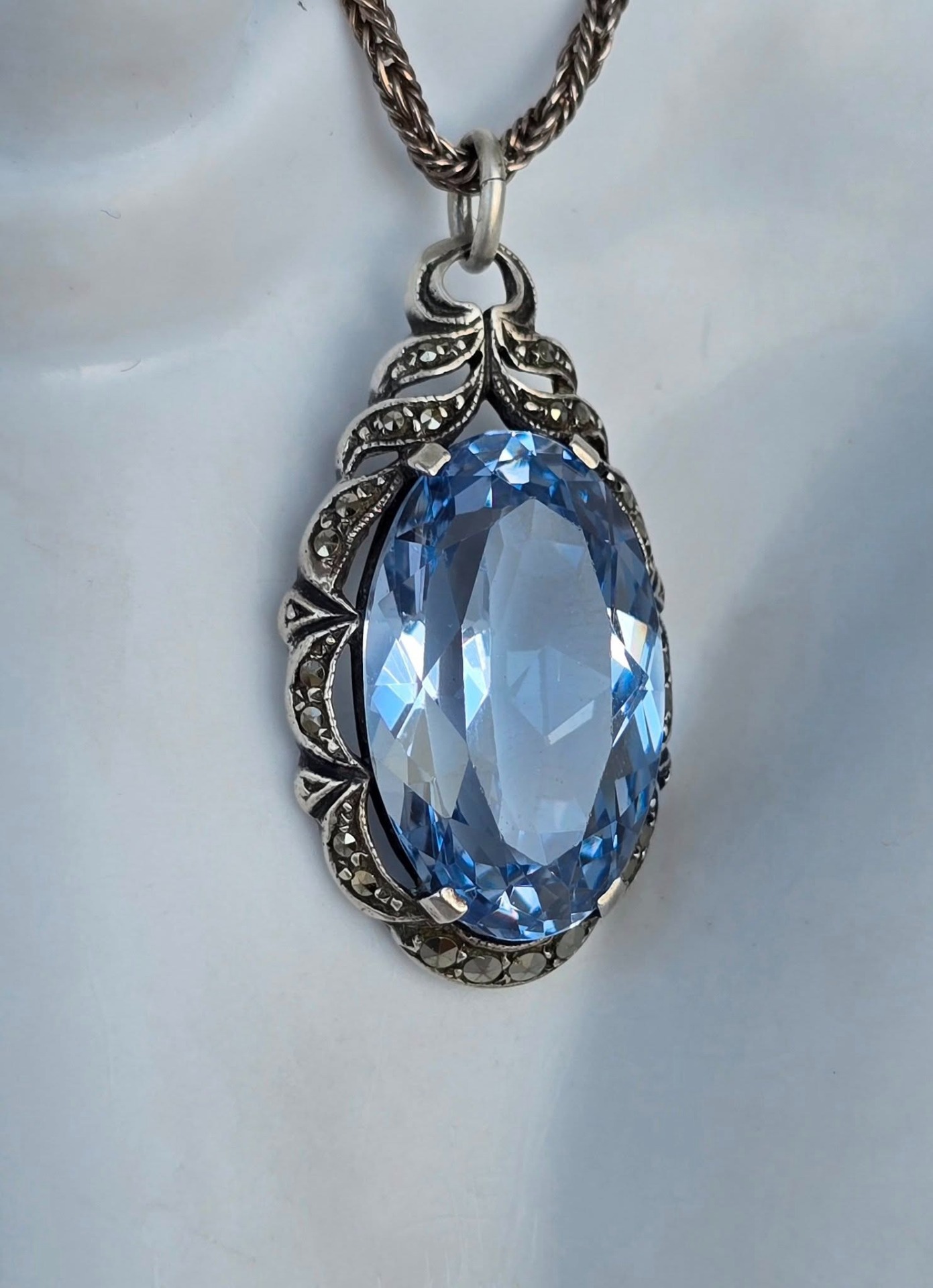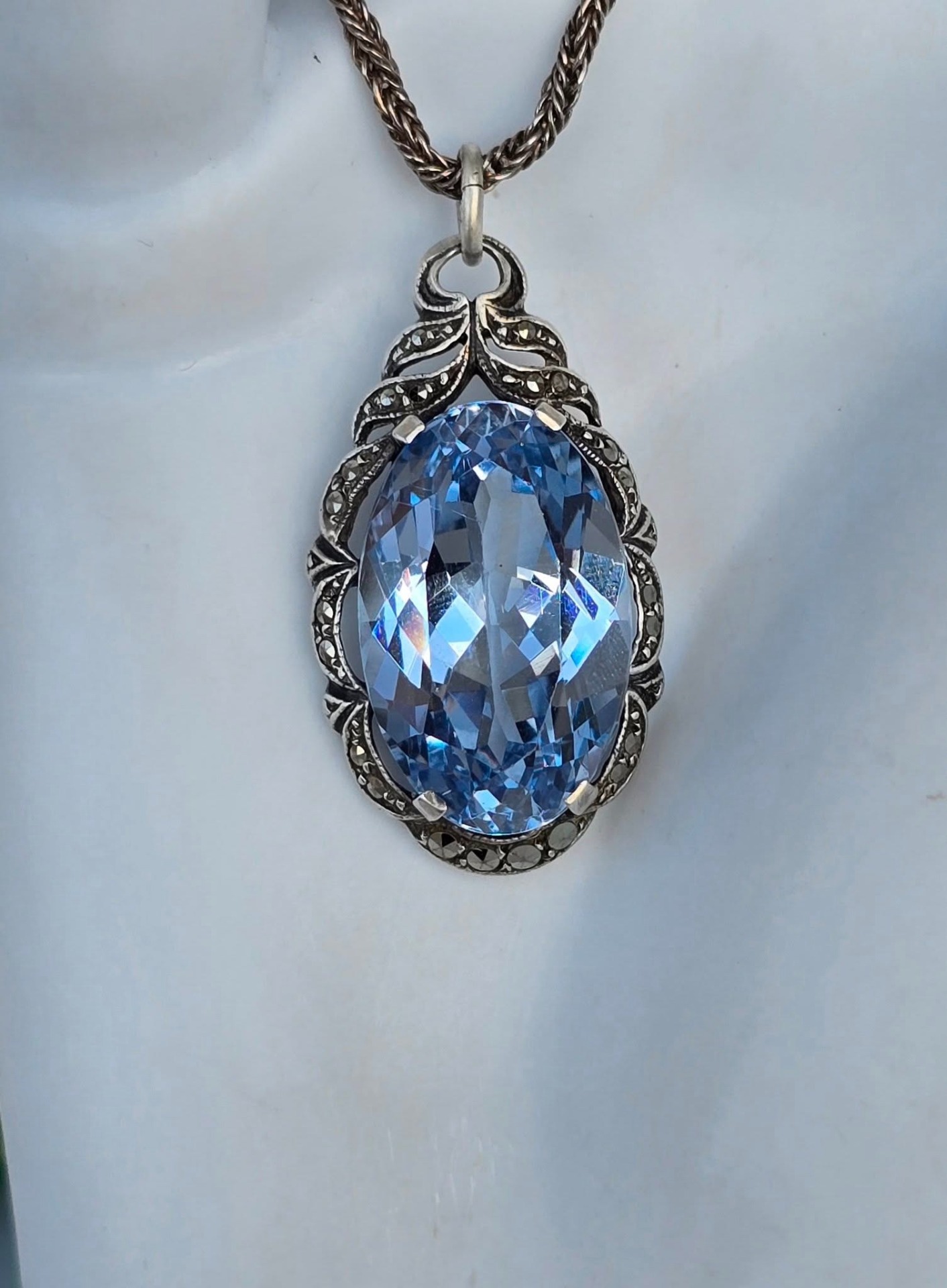 Pandantiv Art Deco din argint, cu un superb topaz natural și marcasite (anii 1930-1940, Germania).