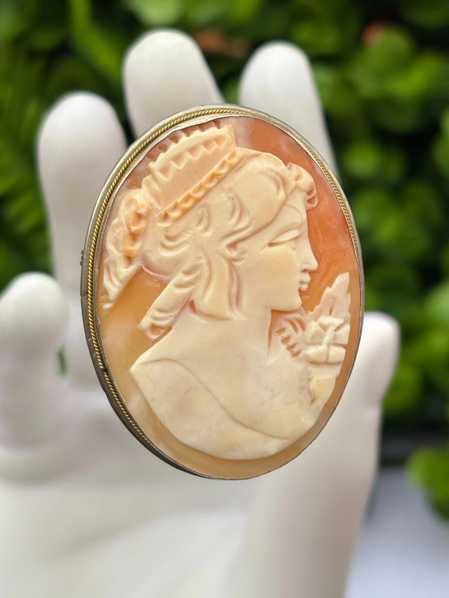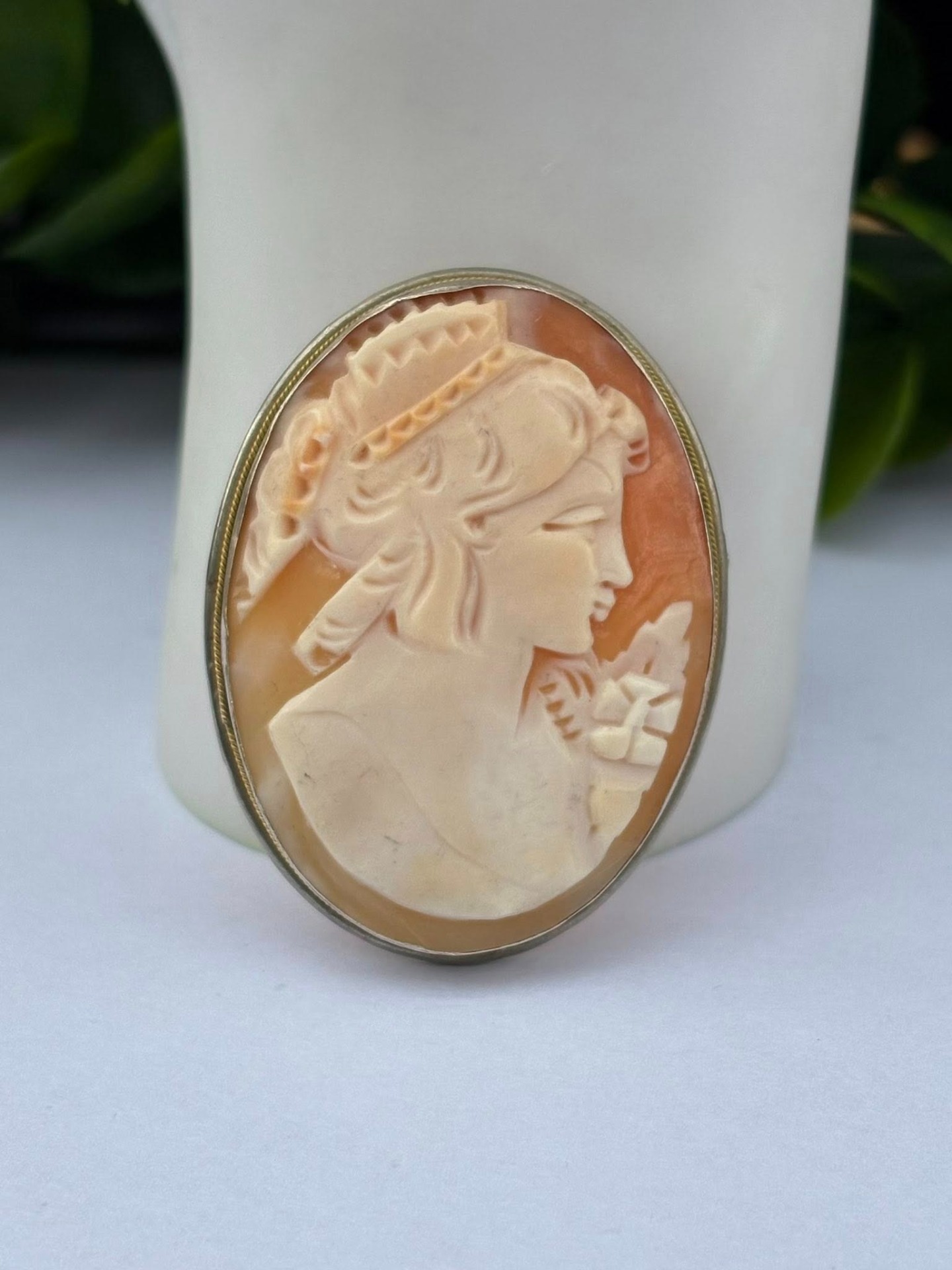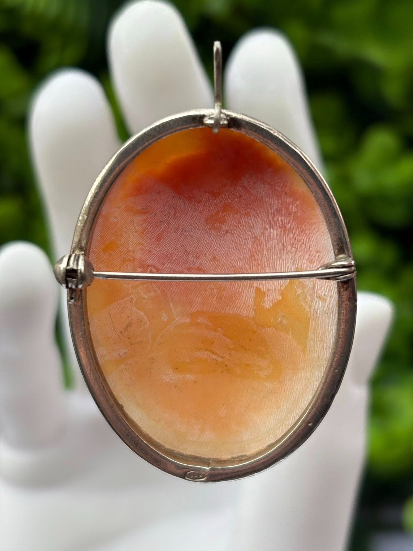 Pandantiv-broșă vechi, camee în scoică naturală în montură din argint aurit.