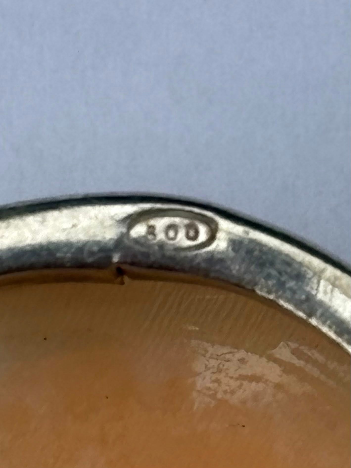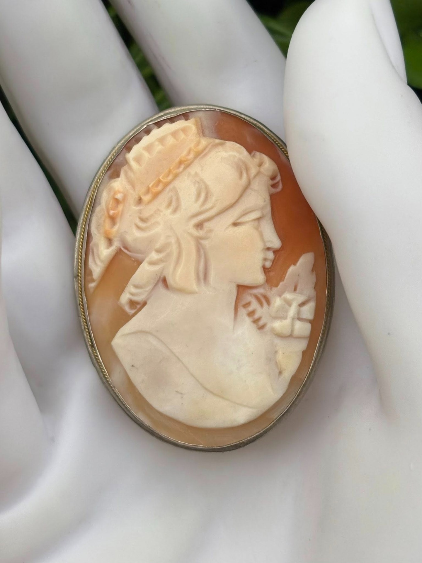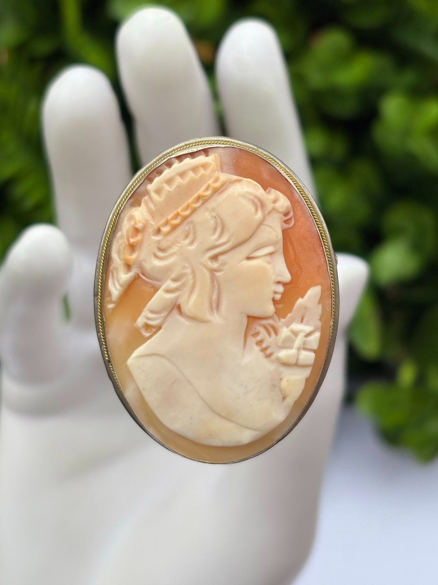 Pandantiv-broșă vechi, camee în scoică naturală în montură din argint aurit.