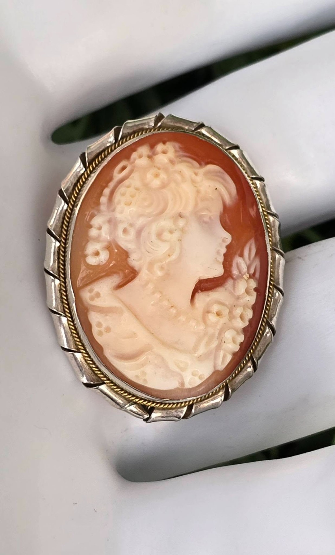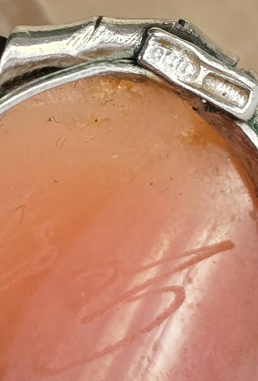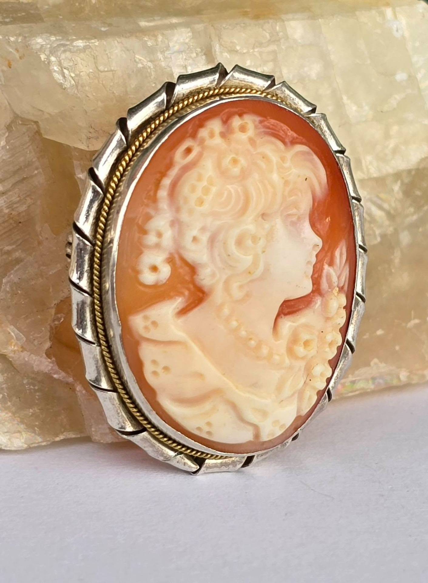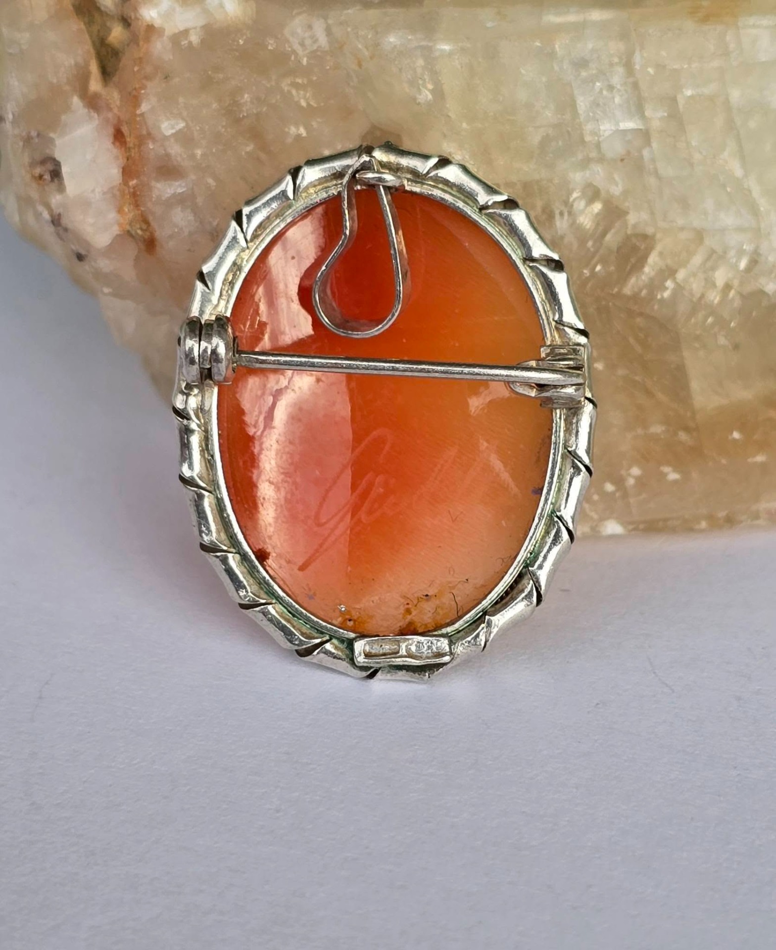 Pandantiv-broșă vechi, camee în scoică naturală în montură din argint (jum.sec.XX, Napoli, Italia).