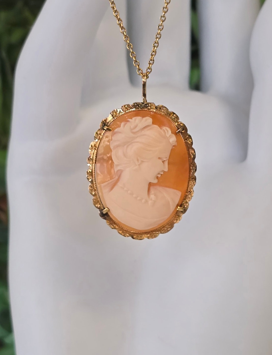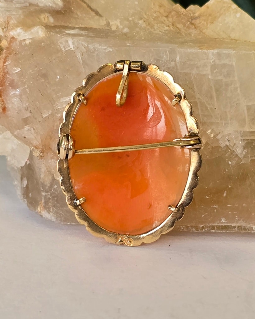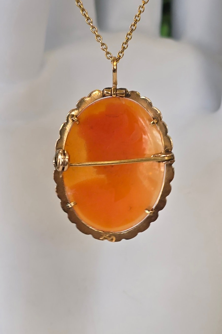 Pandantiv-broșă vechi impresionant, din aur de 18K, cu camee naturală, sculptură în scoică naturală.