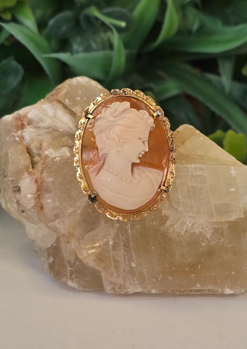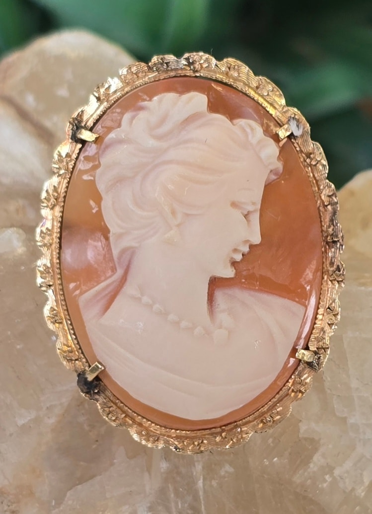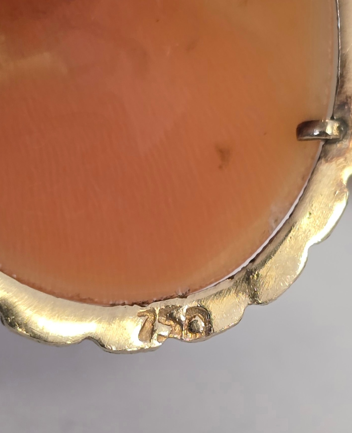 Pandantiv-broșă vechi impresionant, din aur de 18K, cu camee naturală, sculptură în scoică naturală.