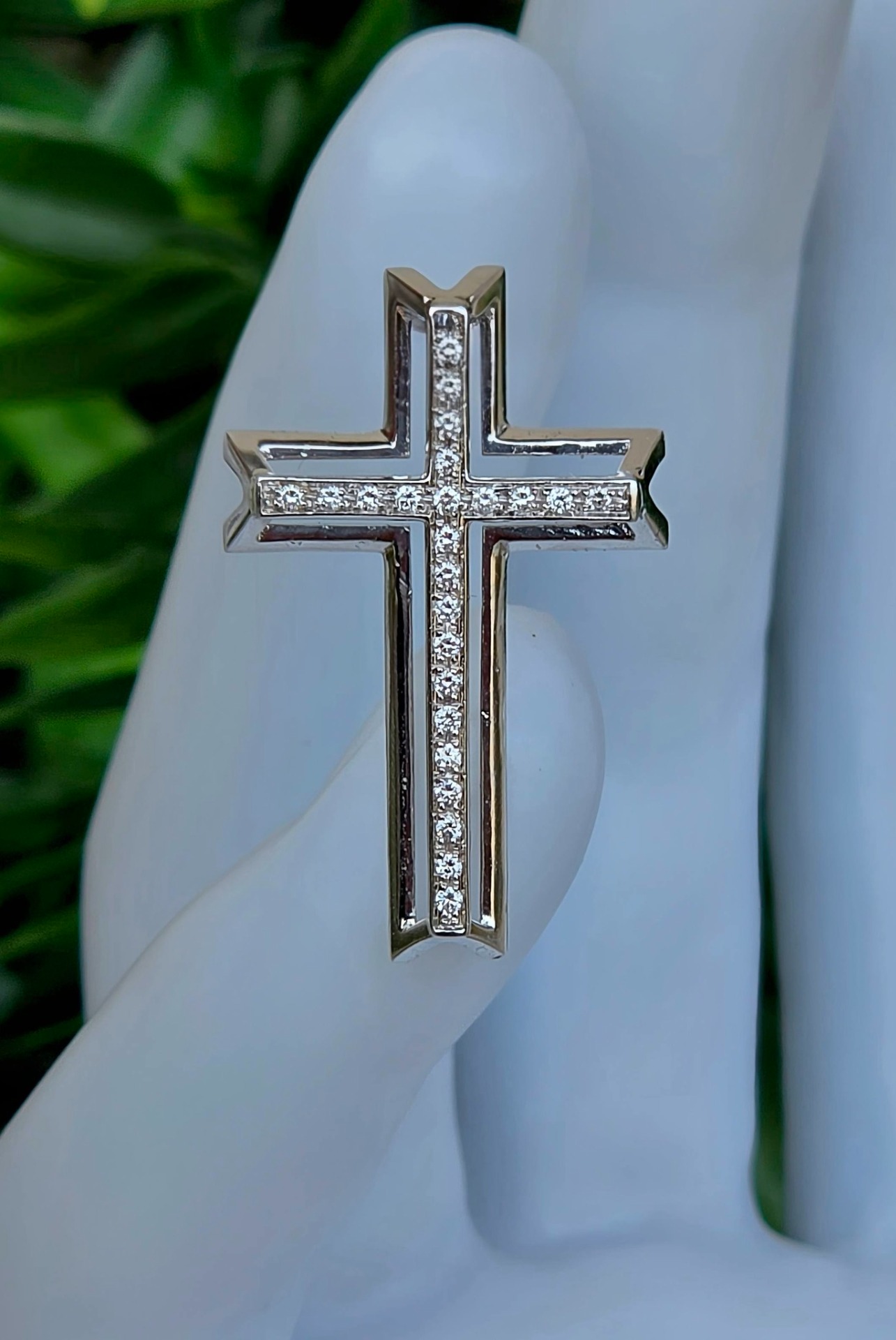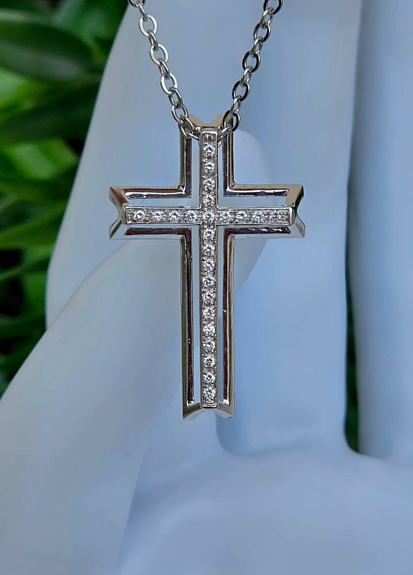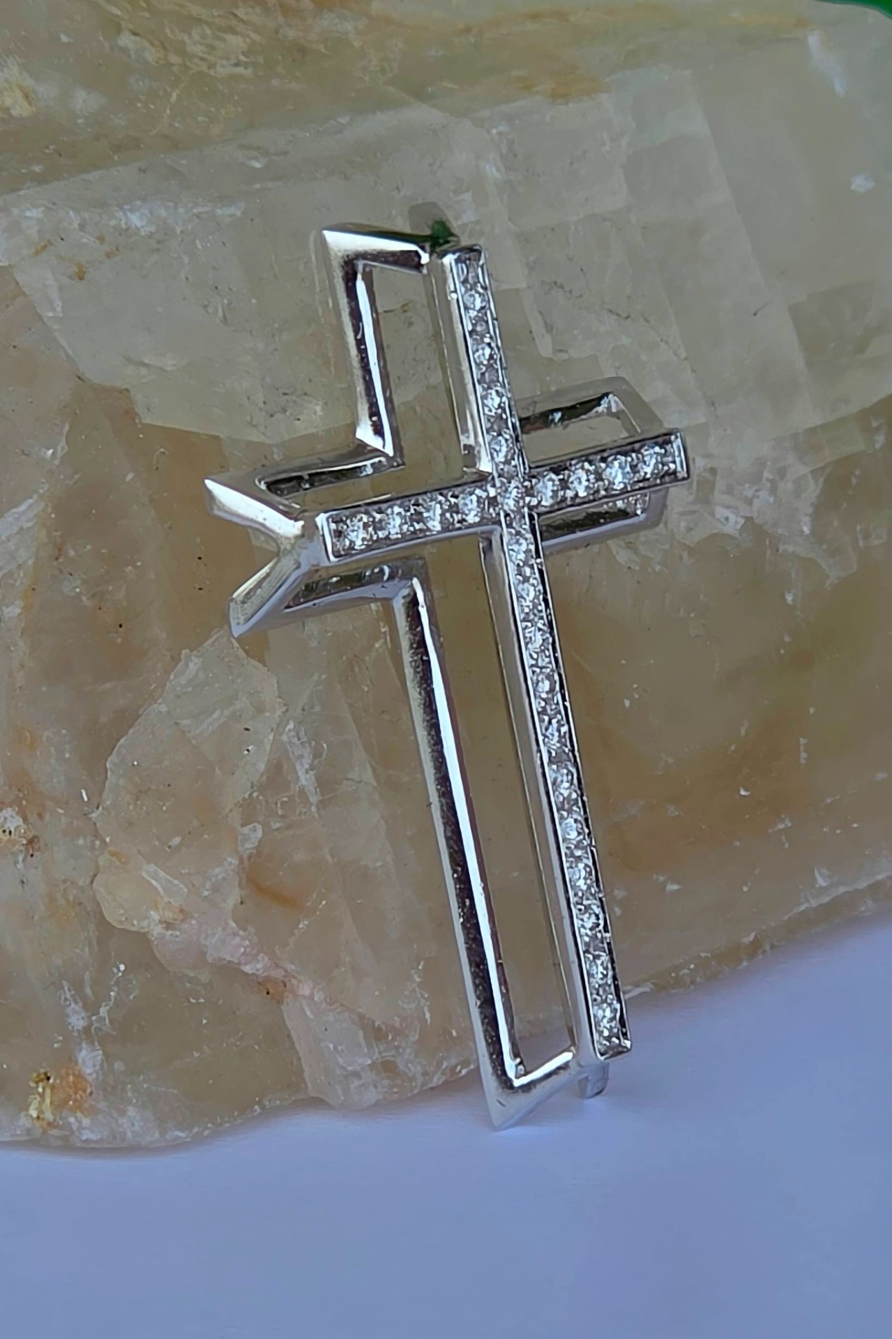 Pandantiv-cruce superb, din aur alb de 18K, cu 24 diamante naturale de calitate excepțională.