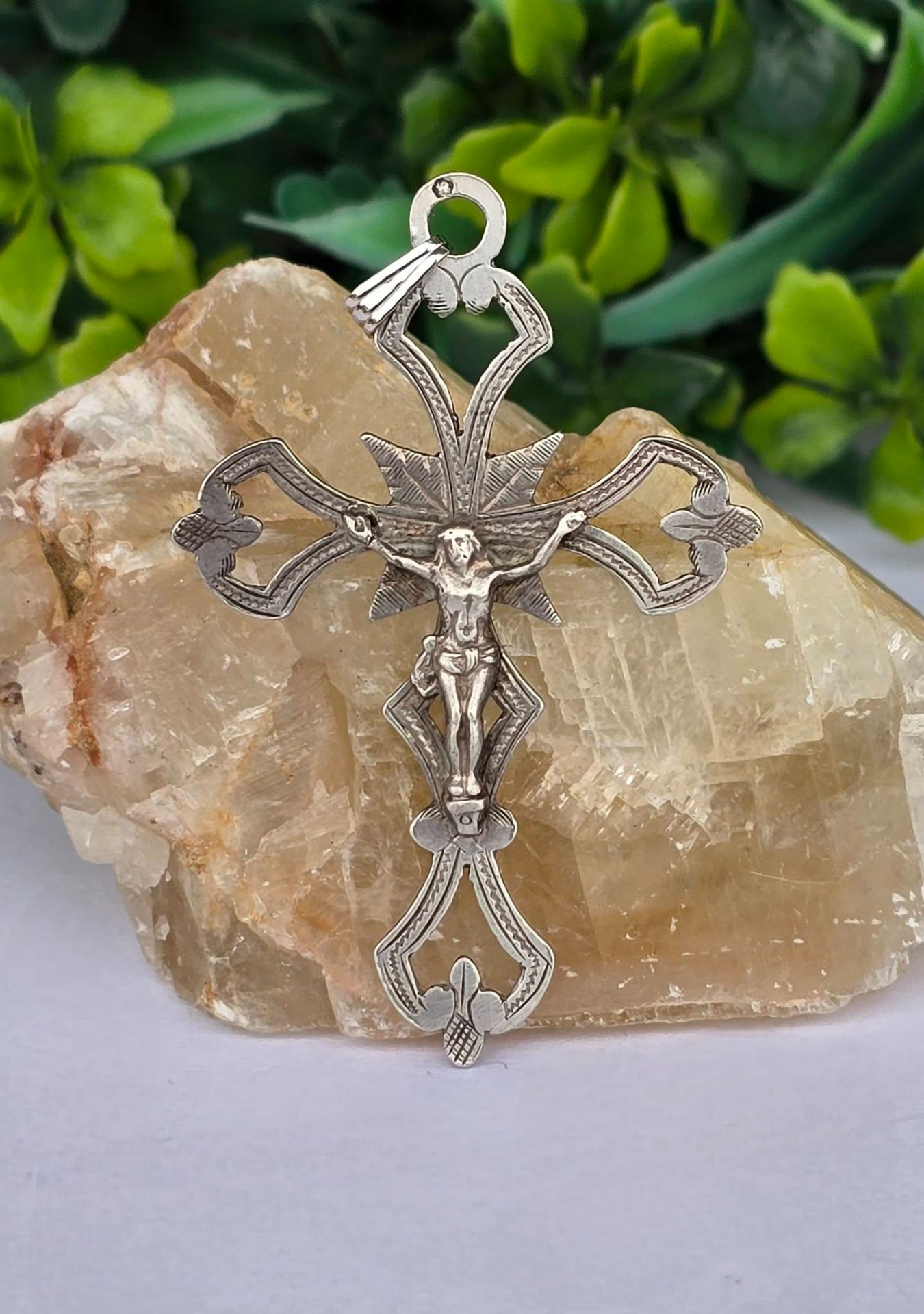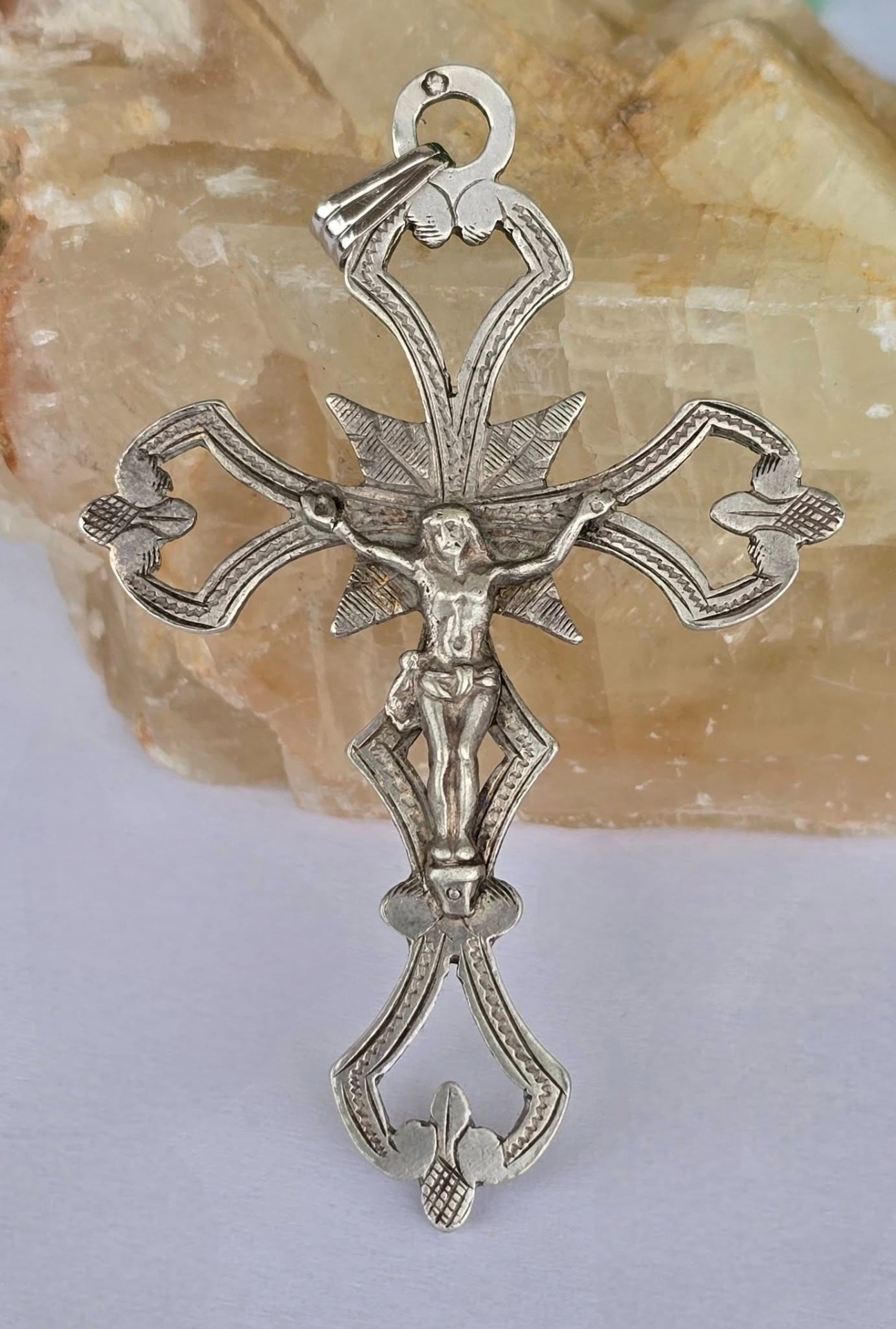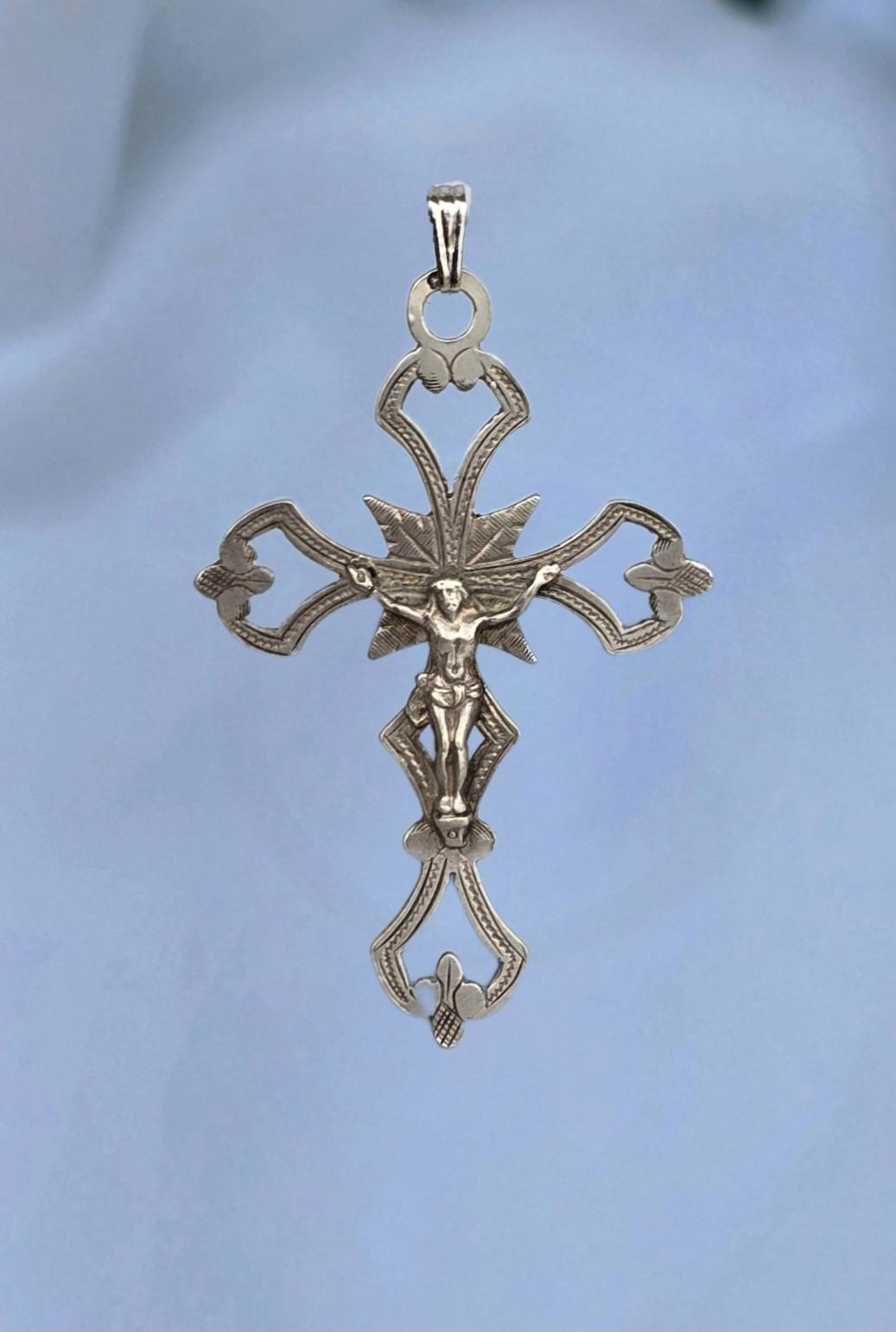 Pandantiv-cruce vechi din argint, cu "Corpus Christi", manufactură de atelier francez cu influențe Art Deco (anii 1930-1940, Franța).