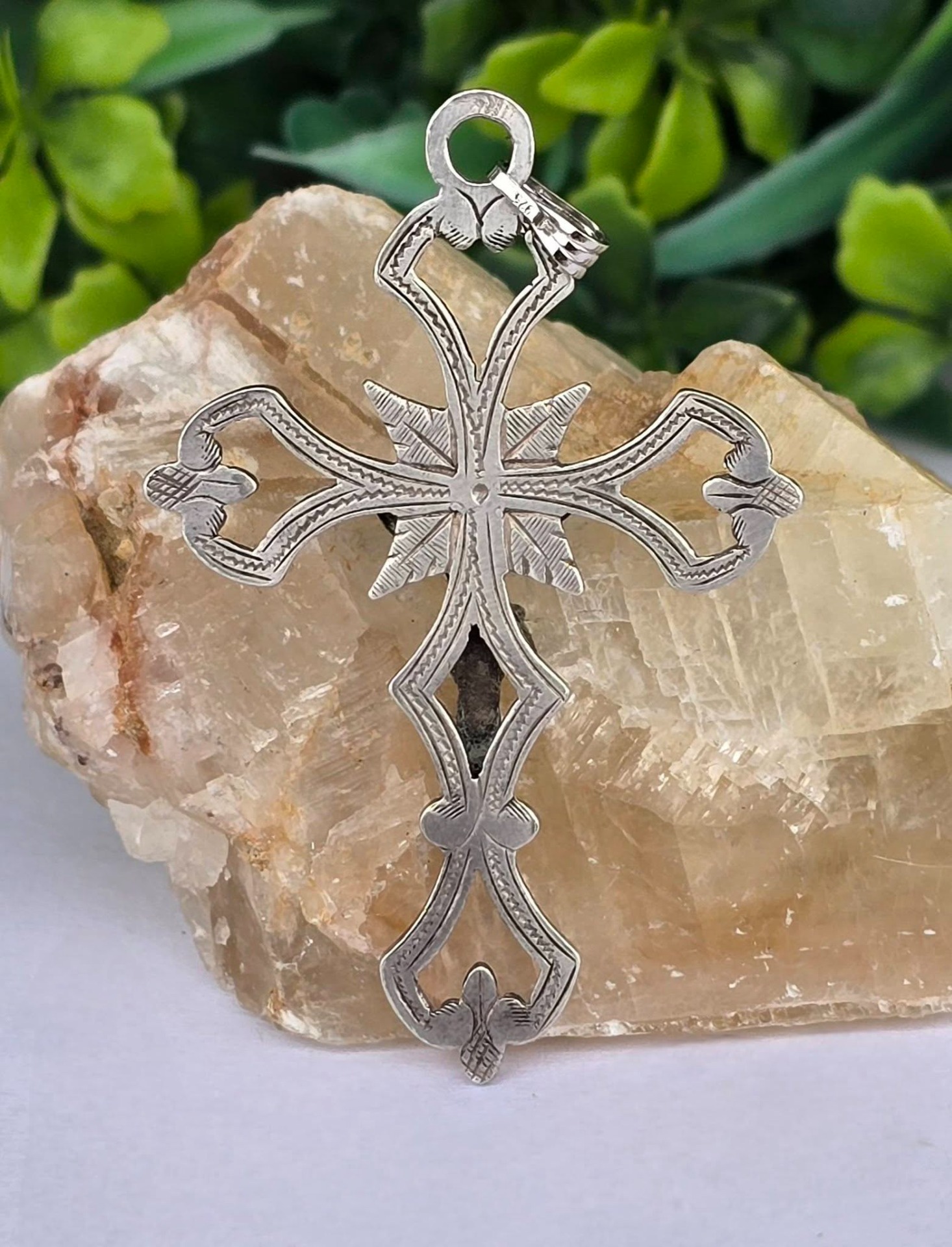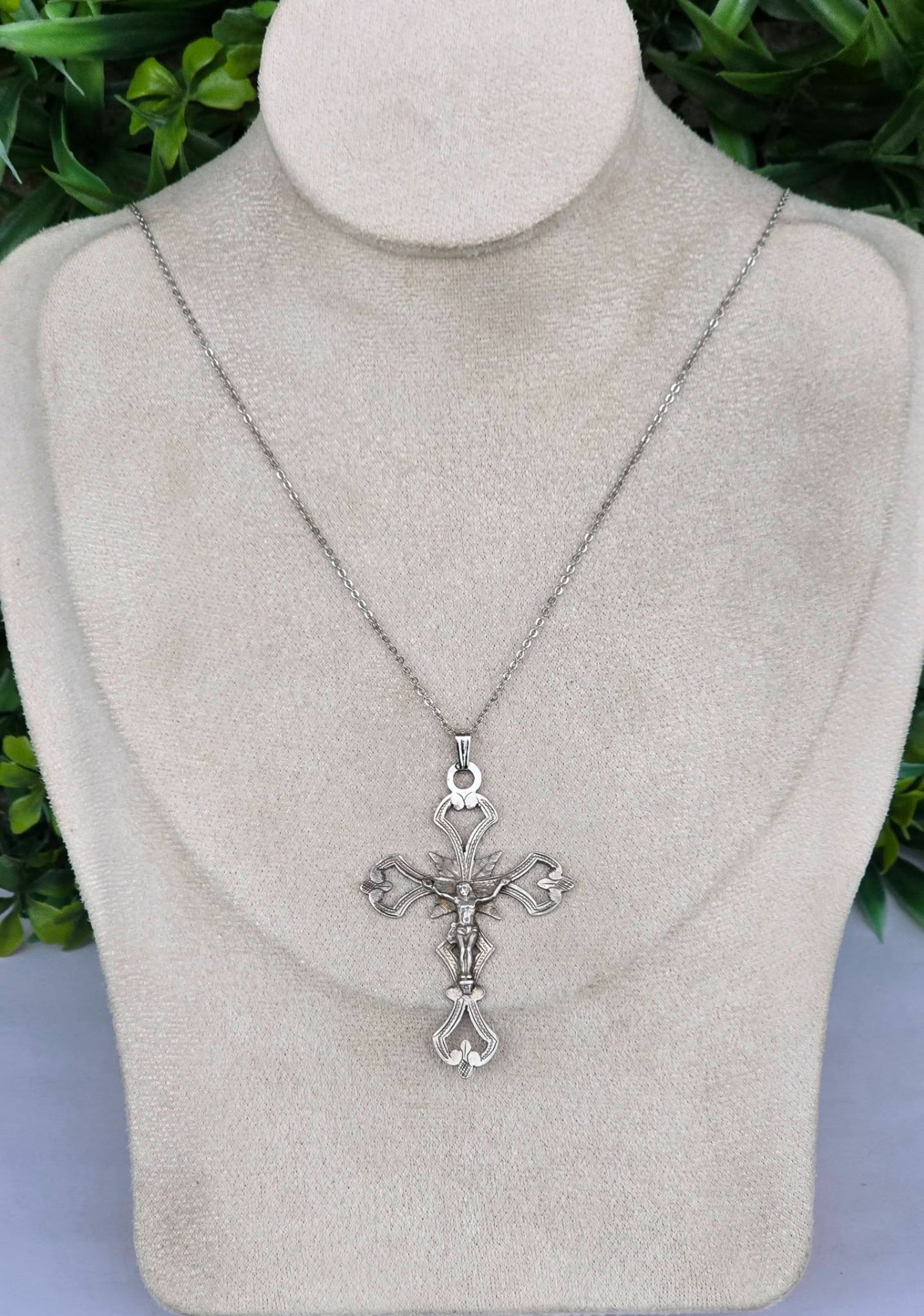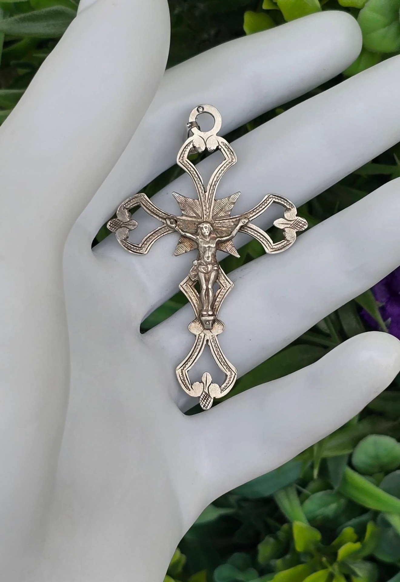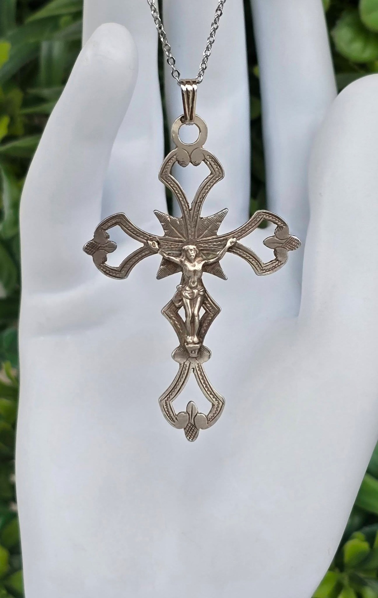 Pandantiv-cruce vechi din argint, cu "Corpus Christi", manufactură de atelier francez cu influențe Art Deco (anii 1930-1940, Franța).