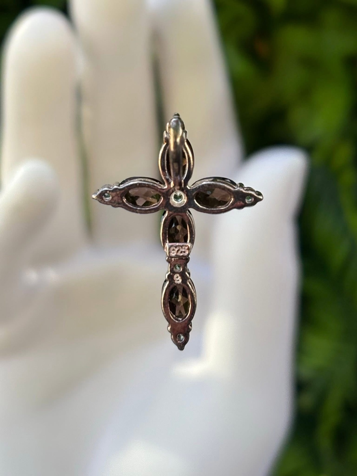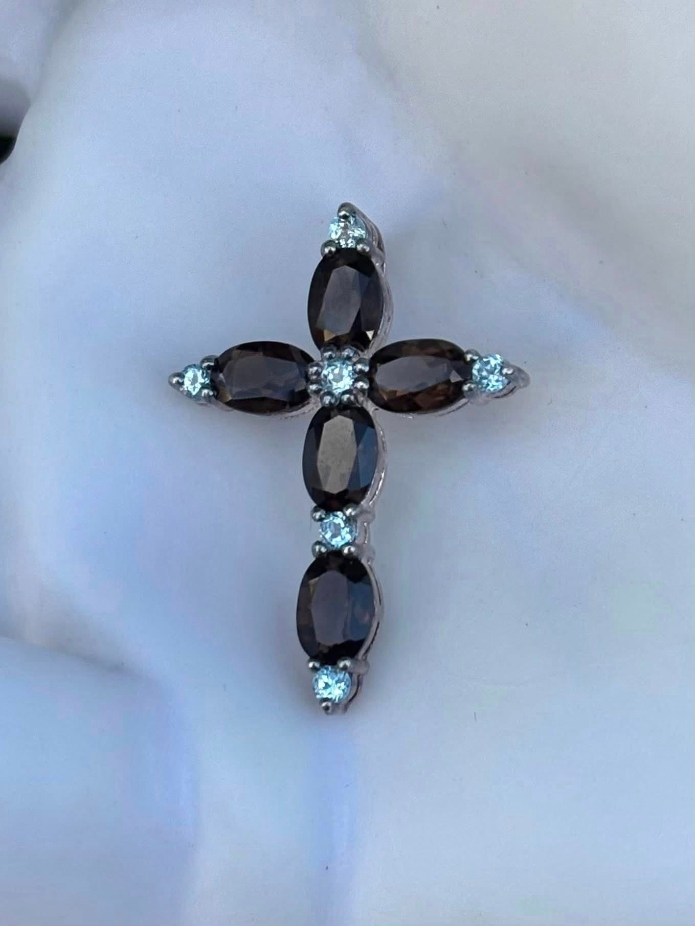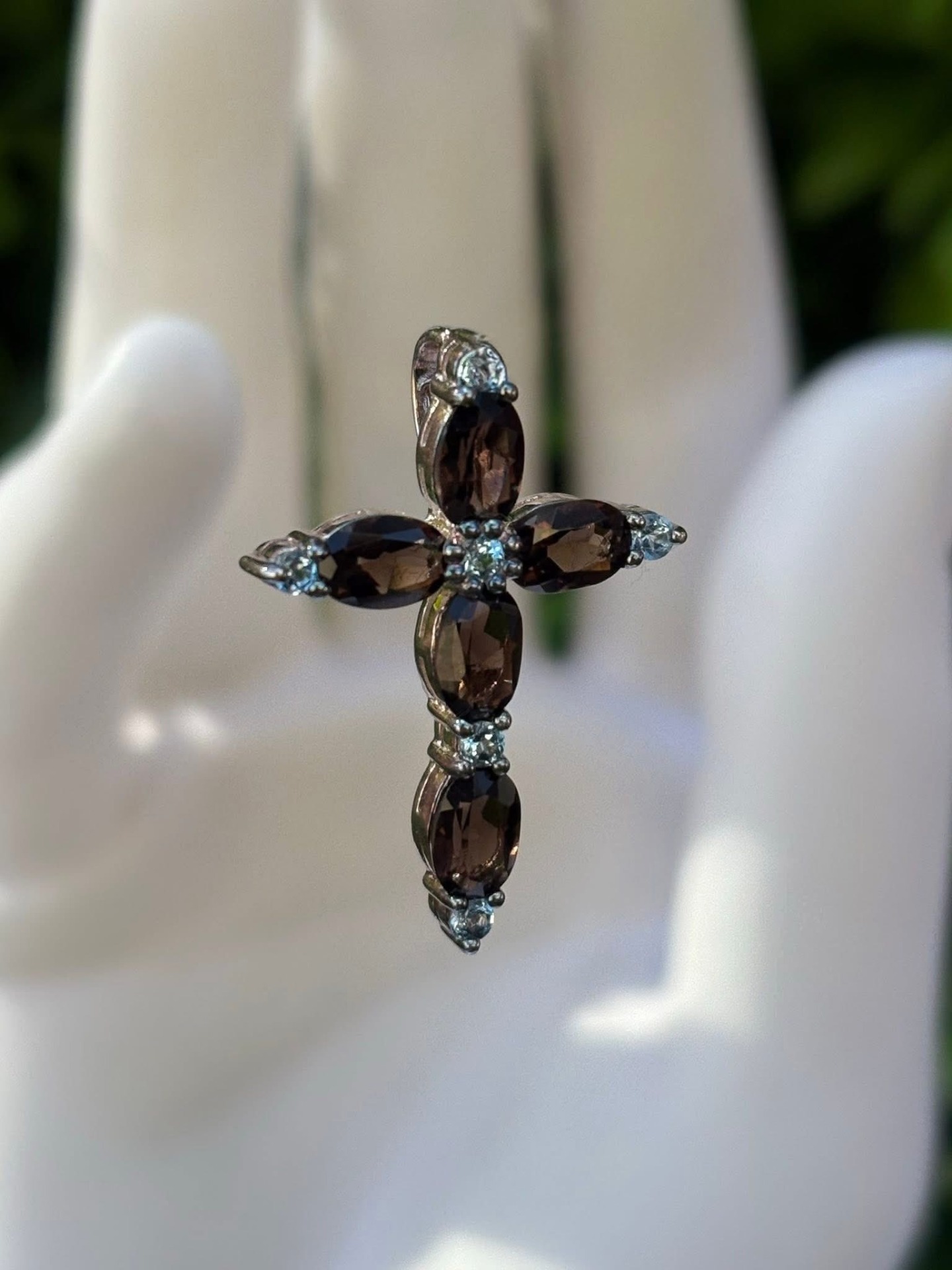 Pandantiv-cruce vechi, din argint, cu topaze și cuarț fumuriu naturale.