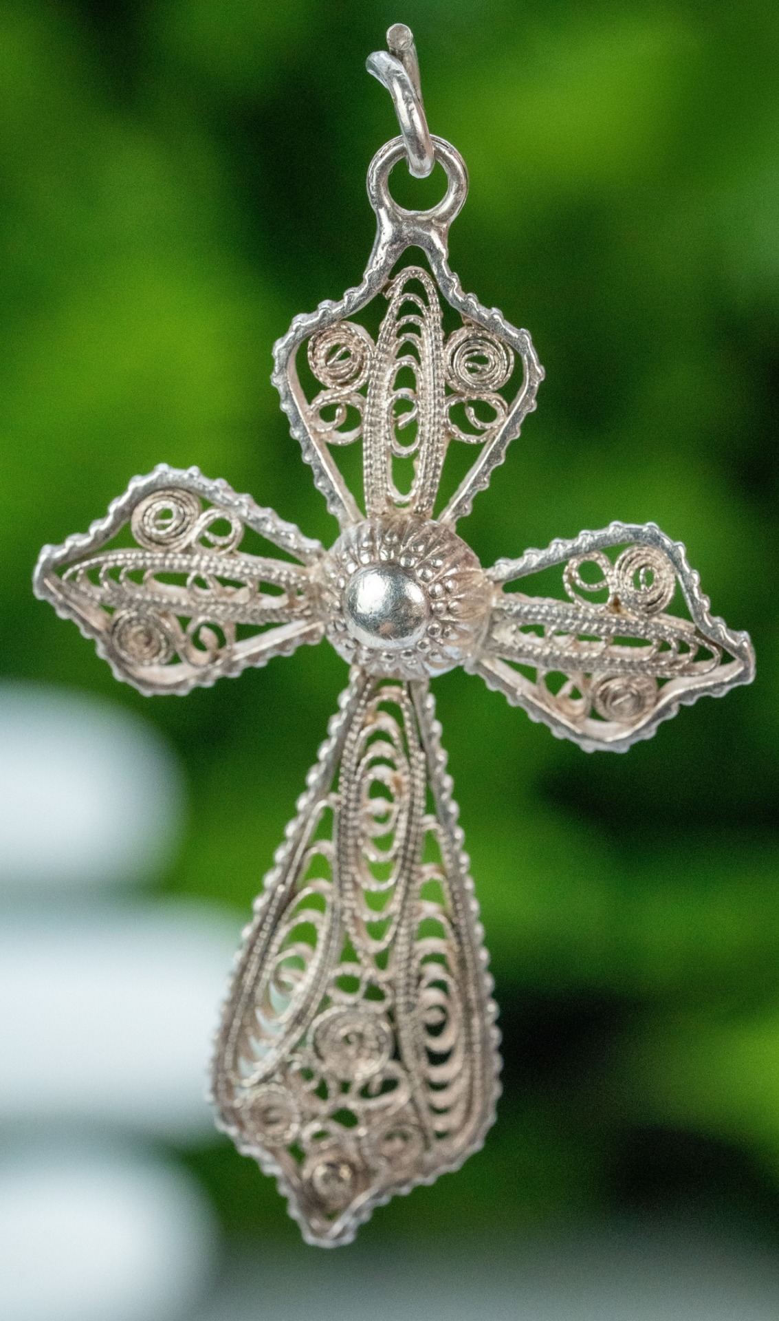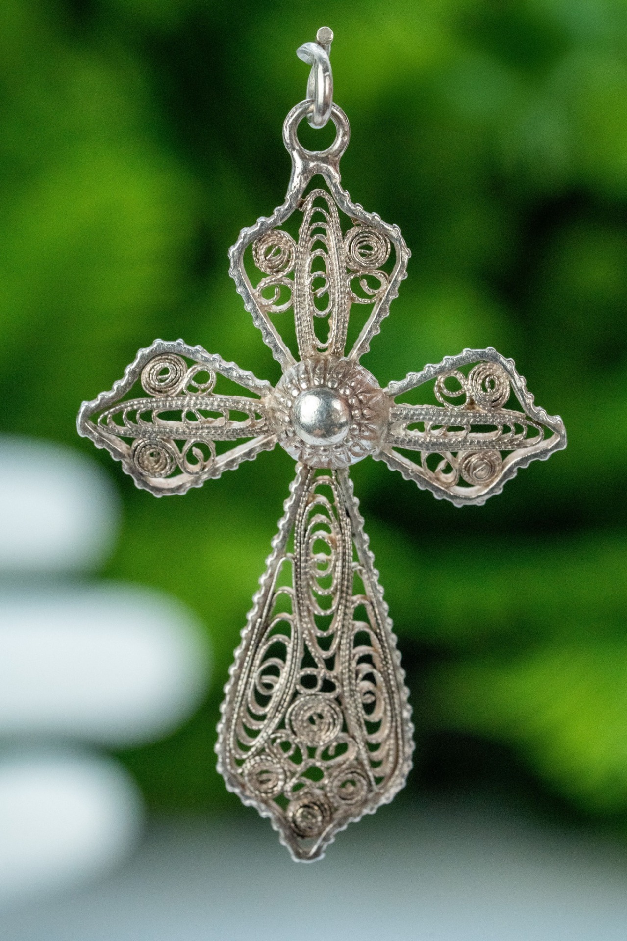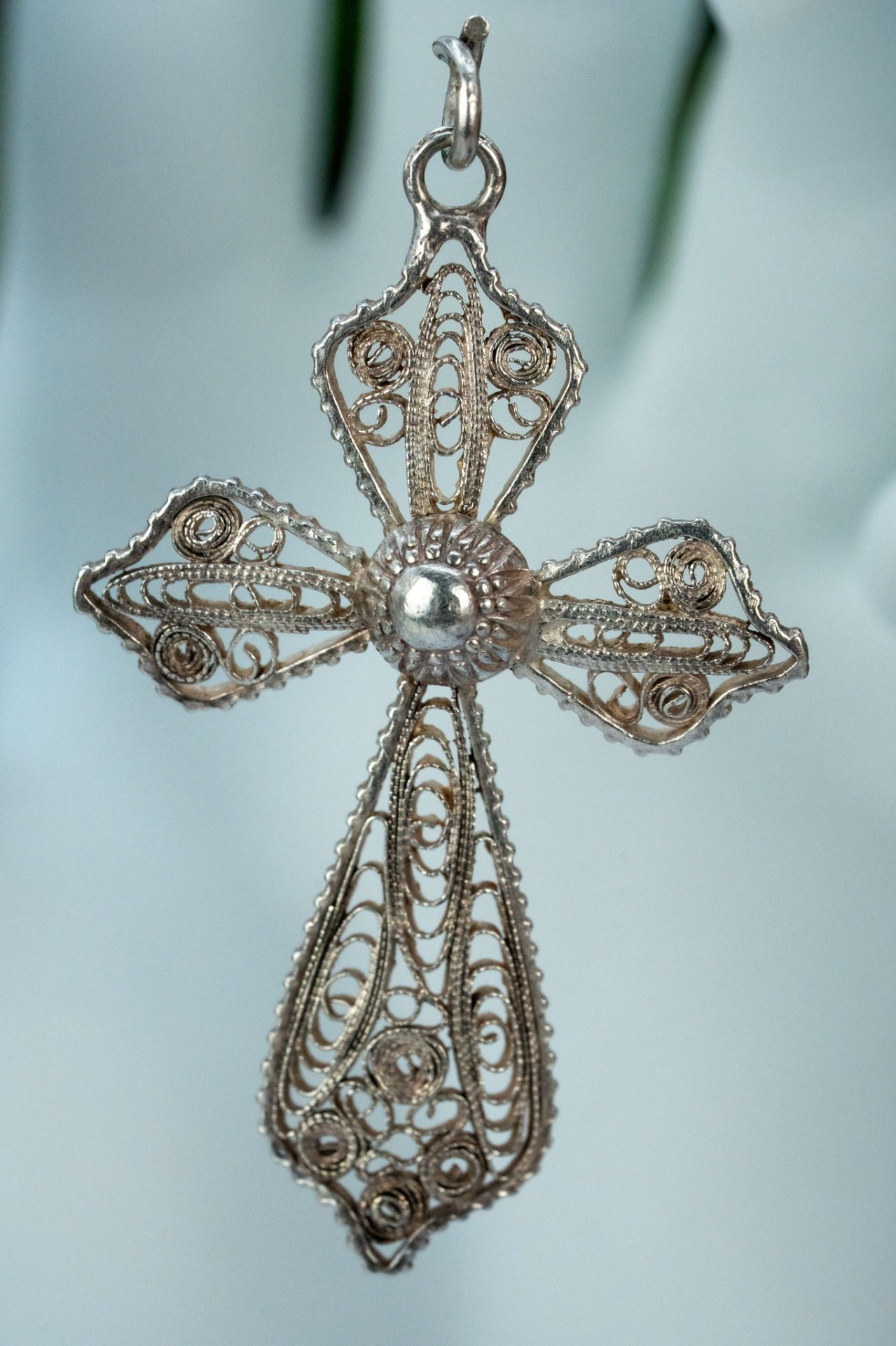 Pandantiv-cruce vechi, din argint, manufactură deosebită in filigran.