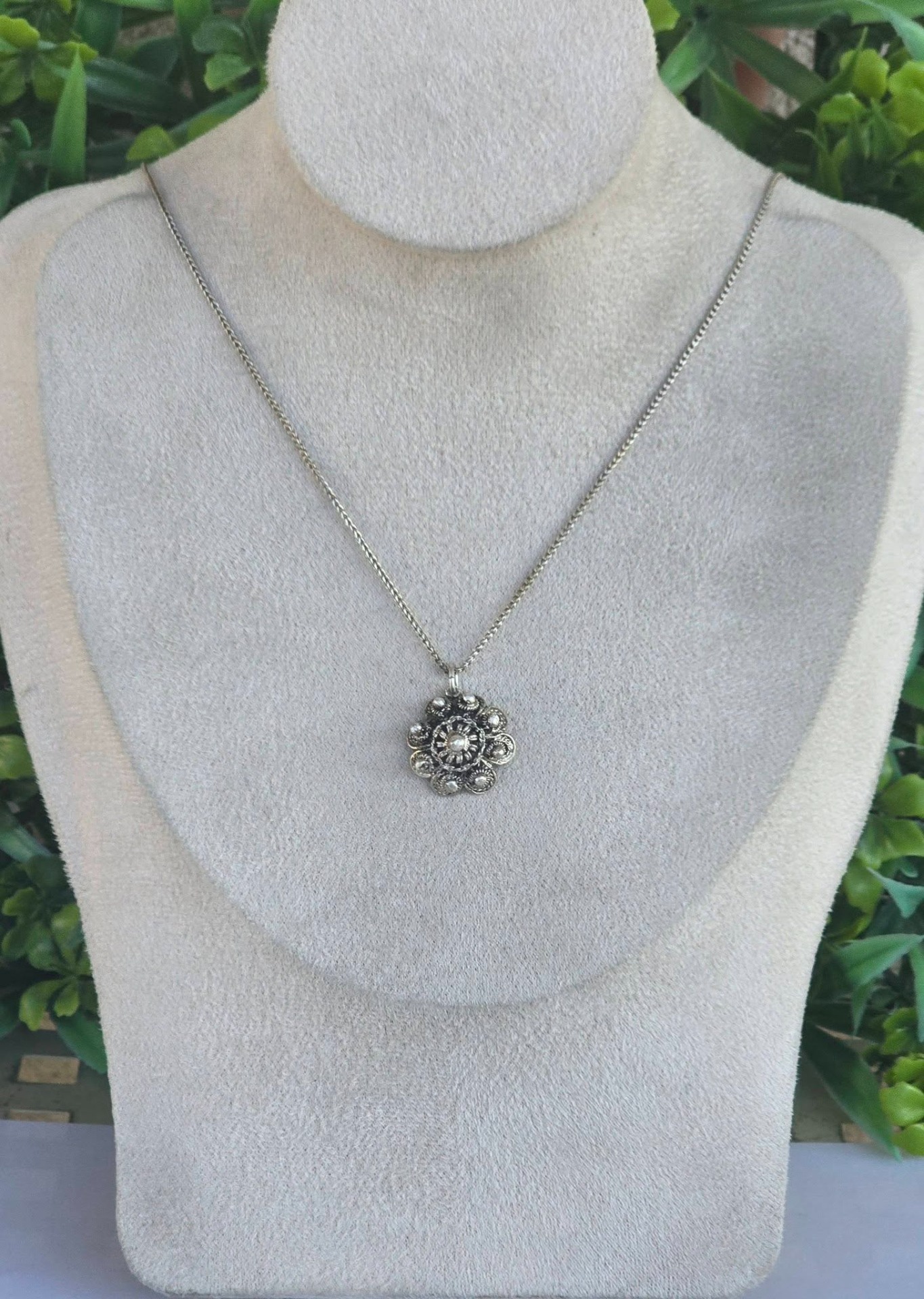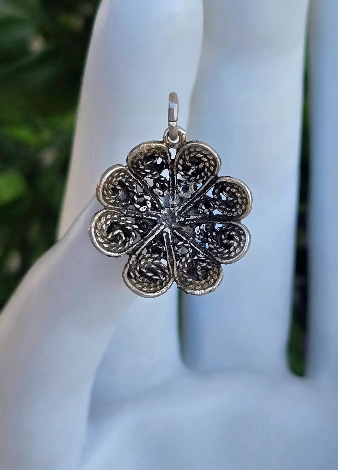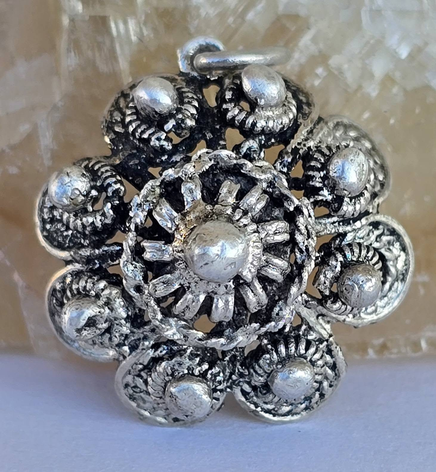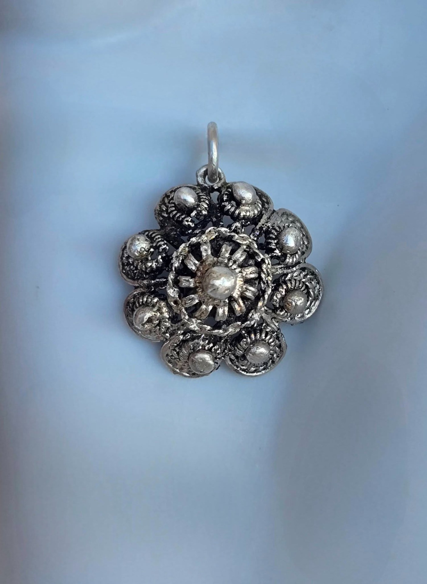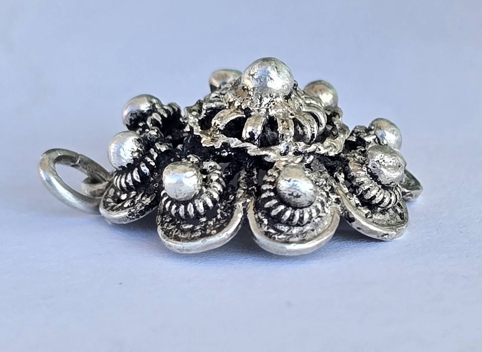 Pandantiv vechi, delicat, din argint, frumos lucrat manual în tehnica filigranului și a granulației.