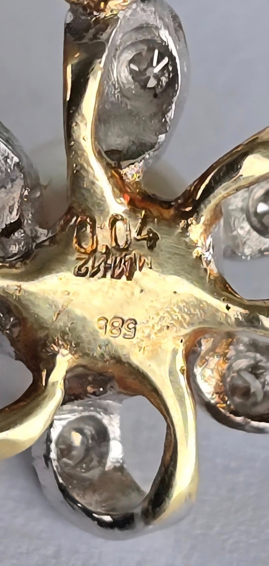 Prezintă marcaj 585 pentru puritate aur de 14K, marcaj "0.04" pentru caratajul diamantelor și marcaj de meșter.