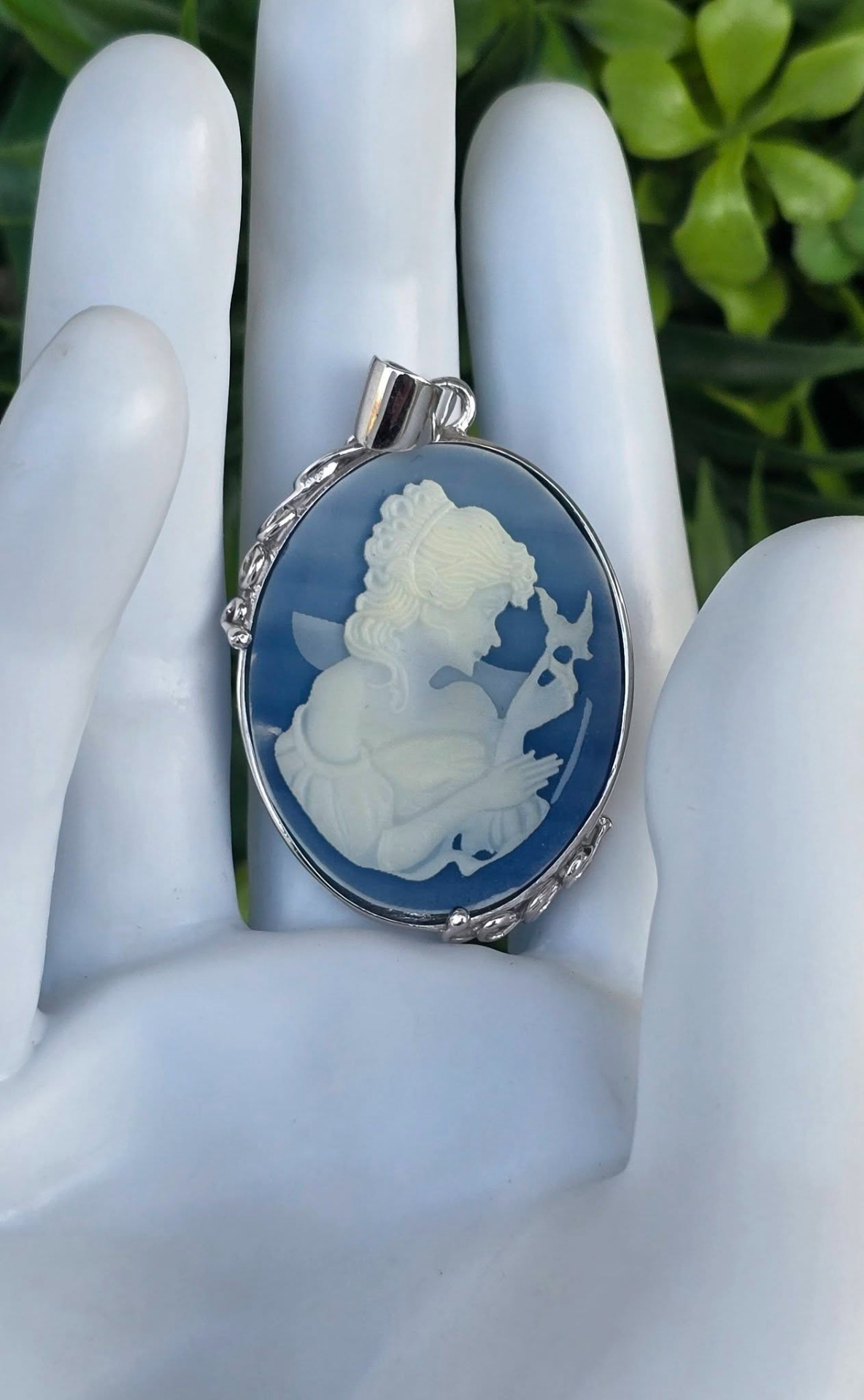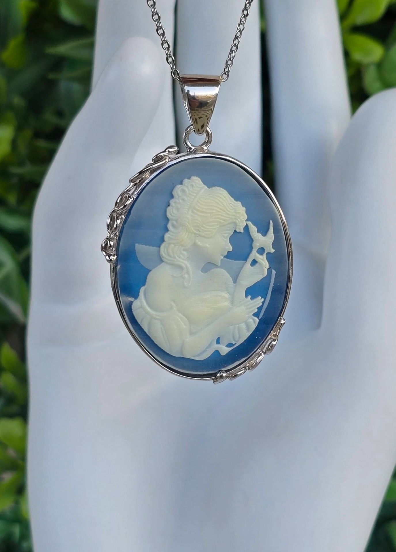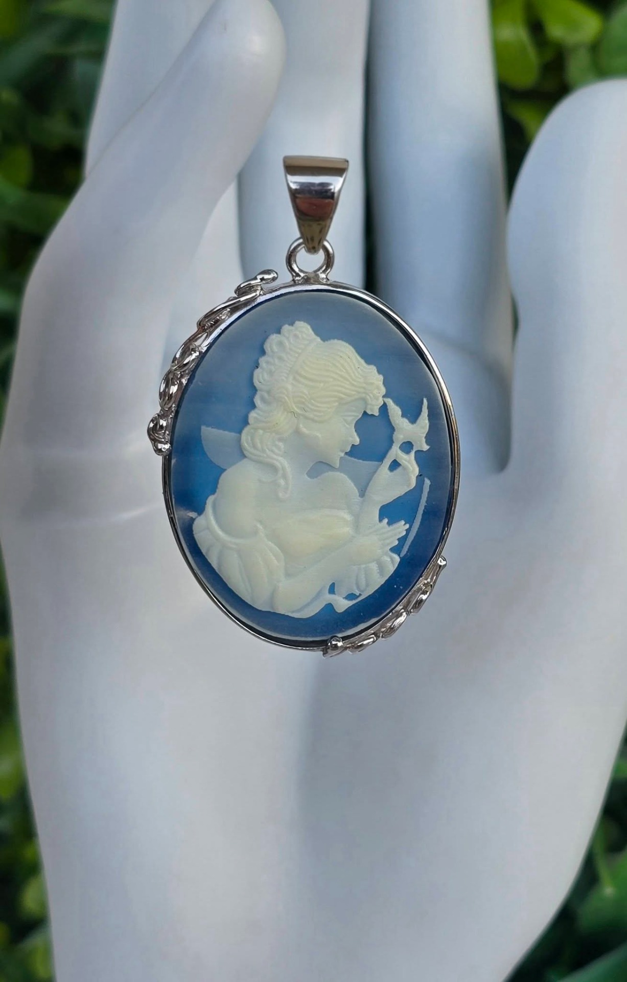 Pandantiv vechi din argint, cu camee, sculptură pe calcedonie albastră naturală.