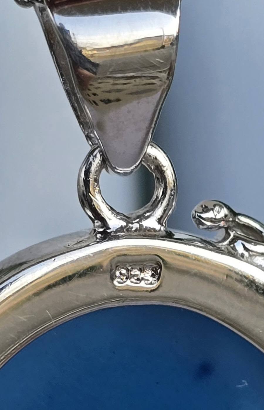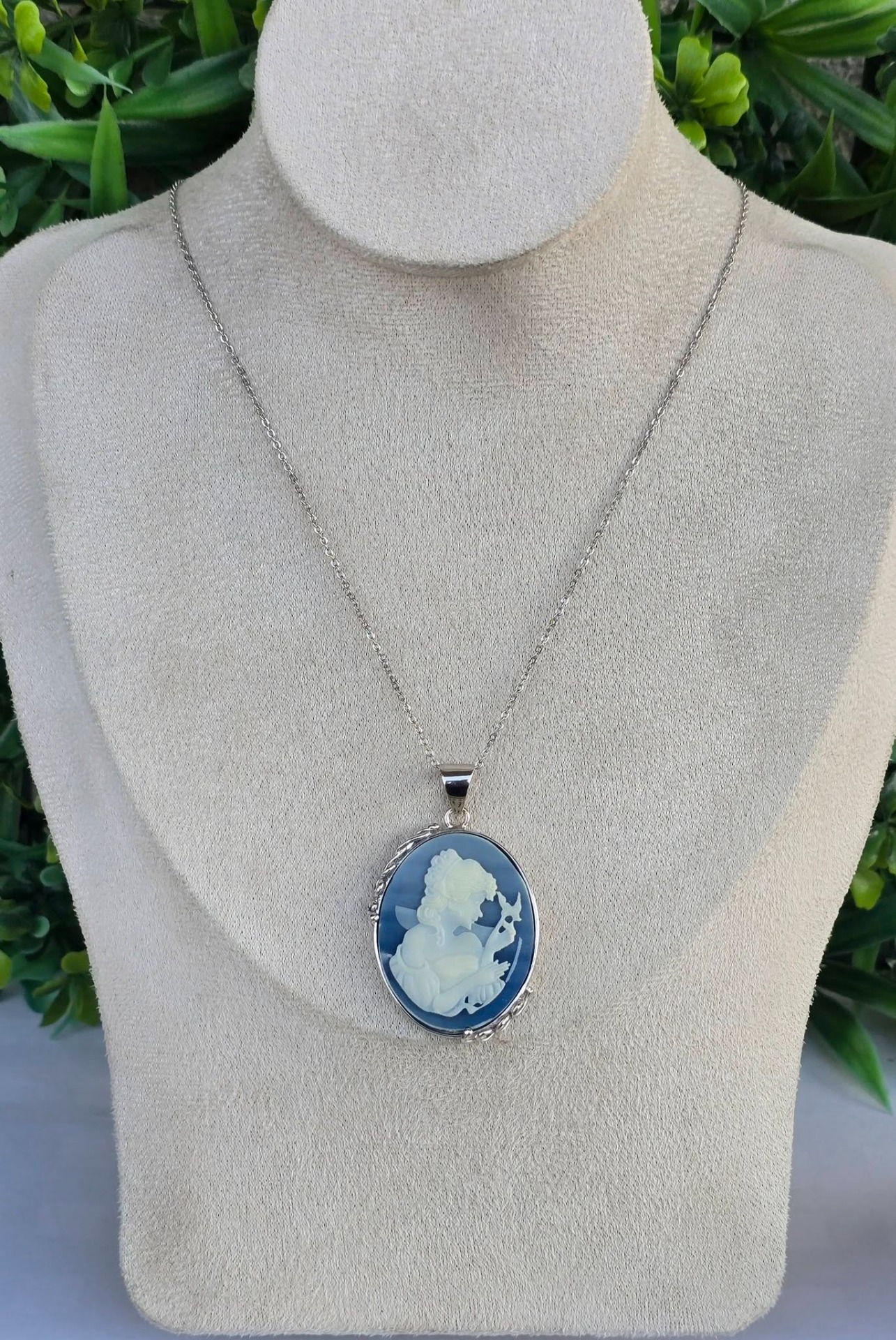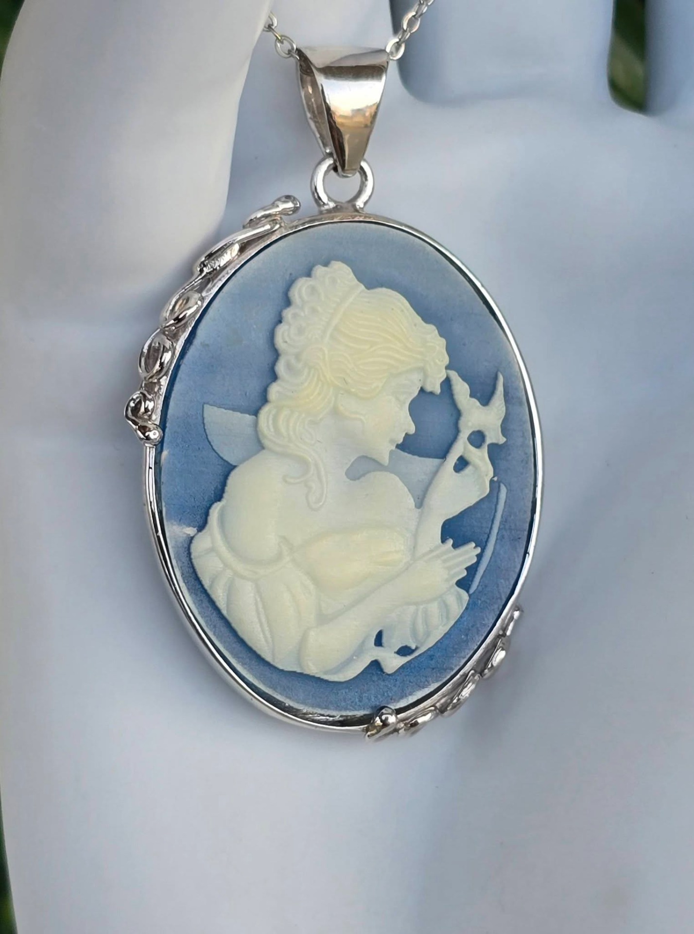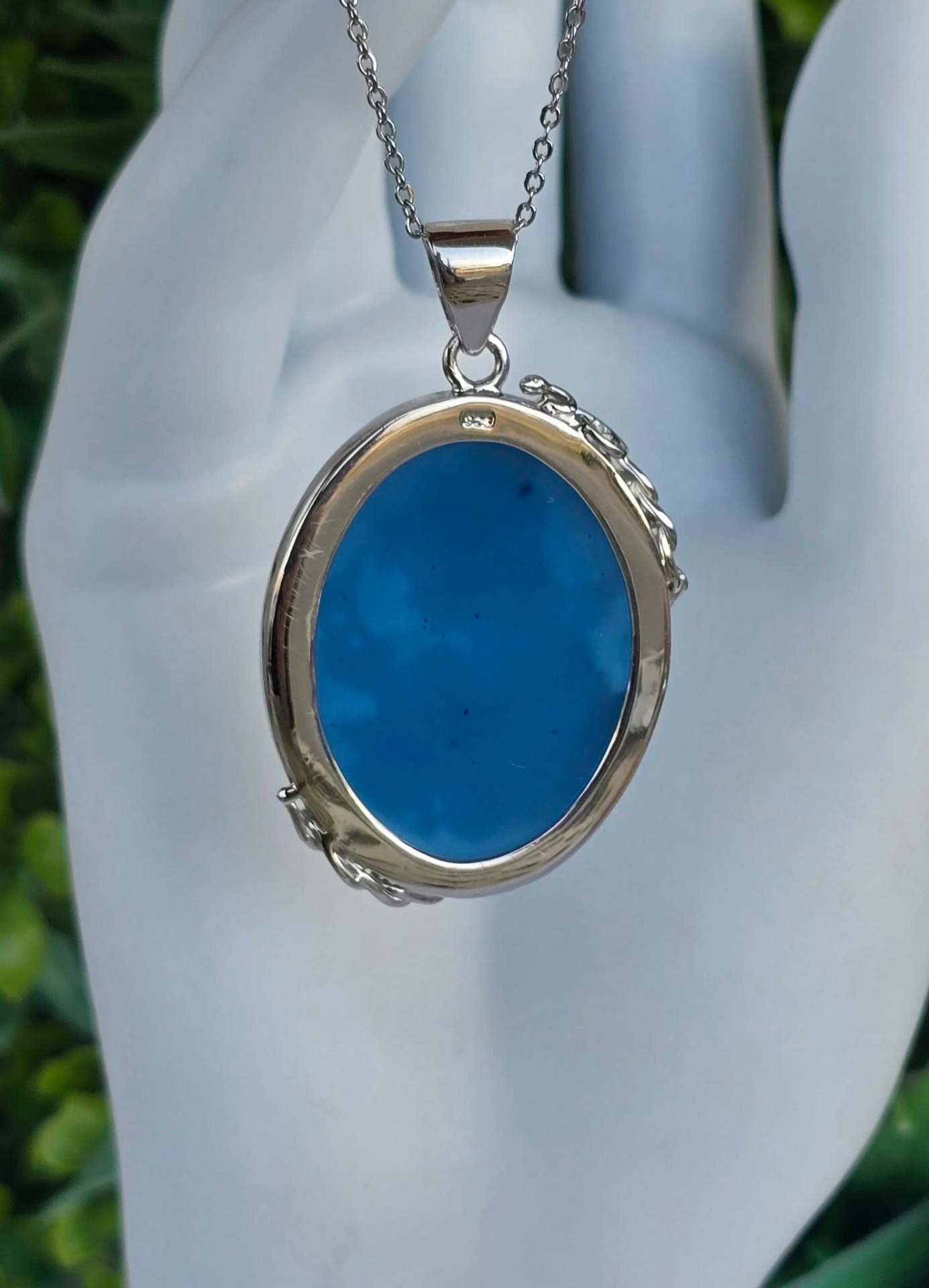 Pandantiv vechi din argint, cu camee, sculptură pe calcedonie albastră naturală.