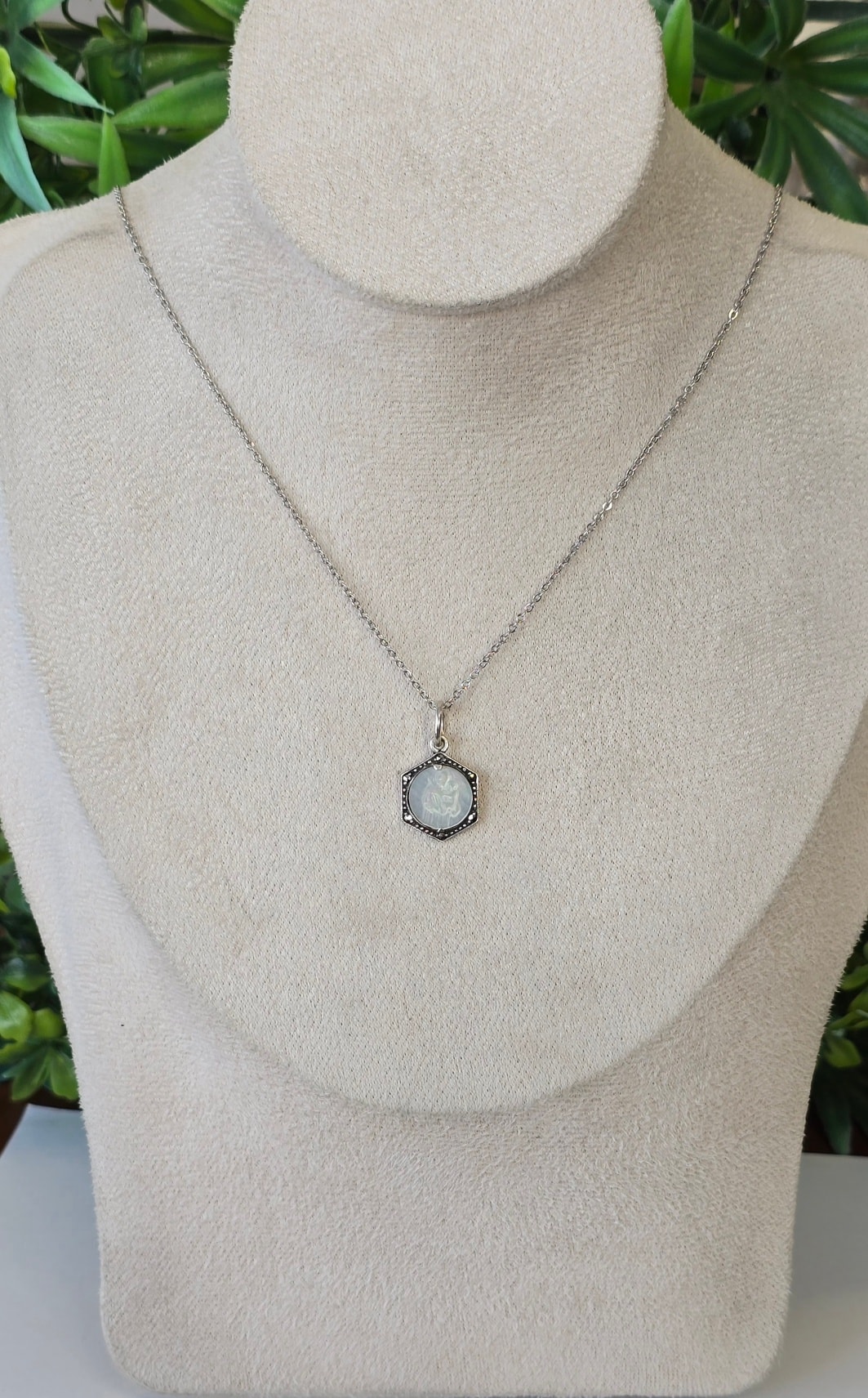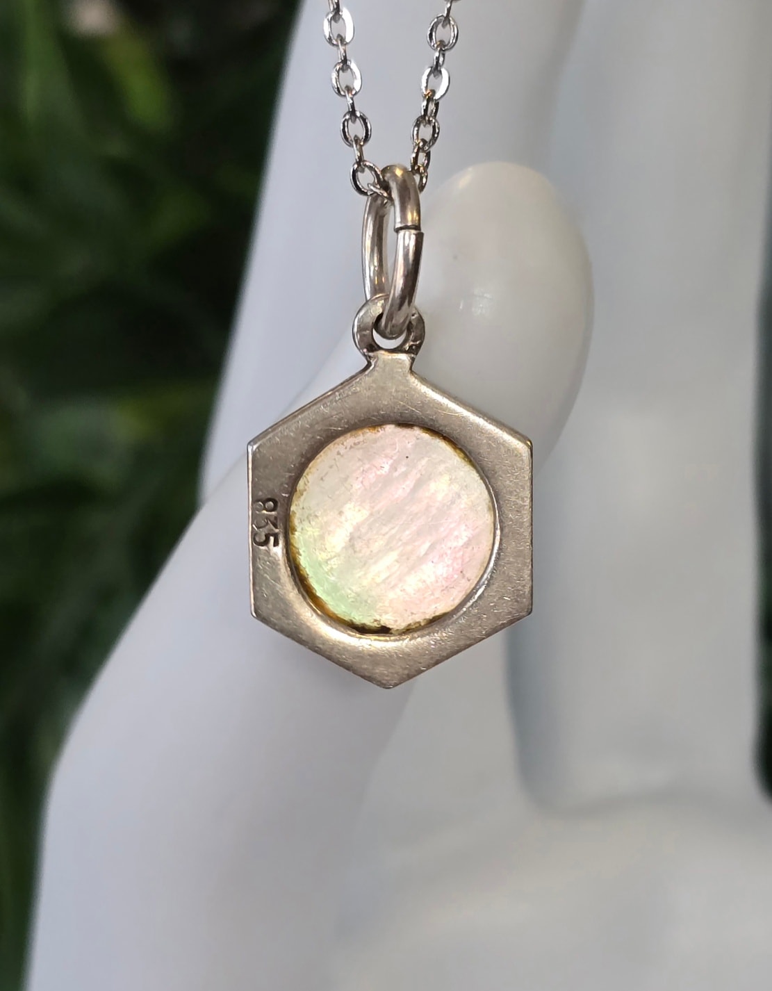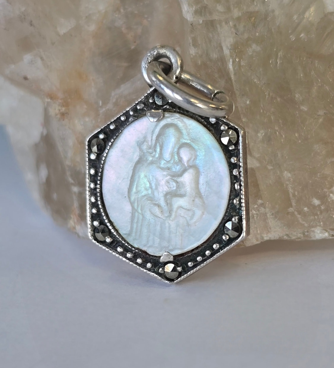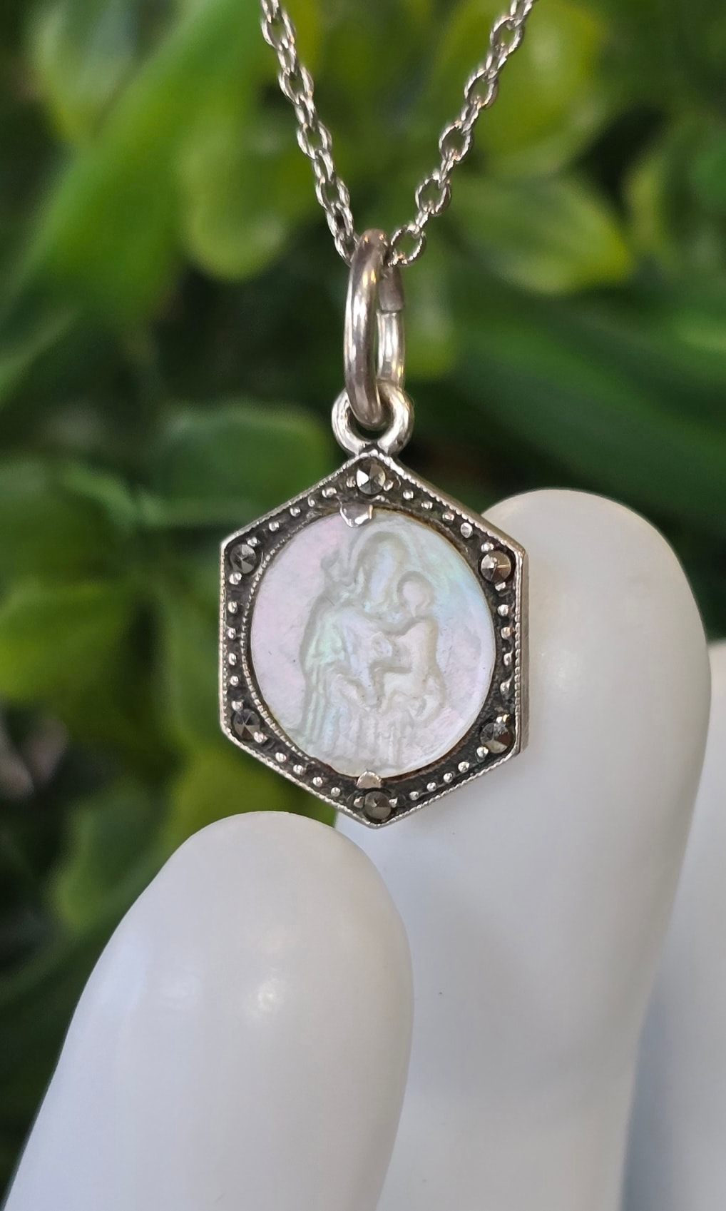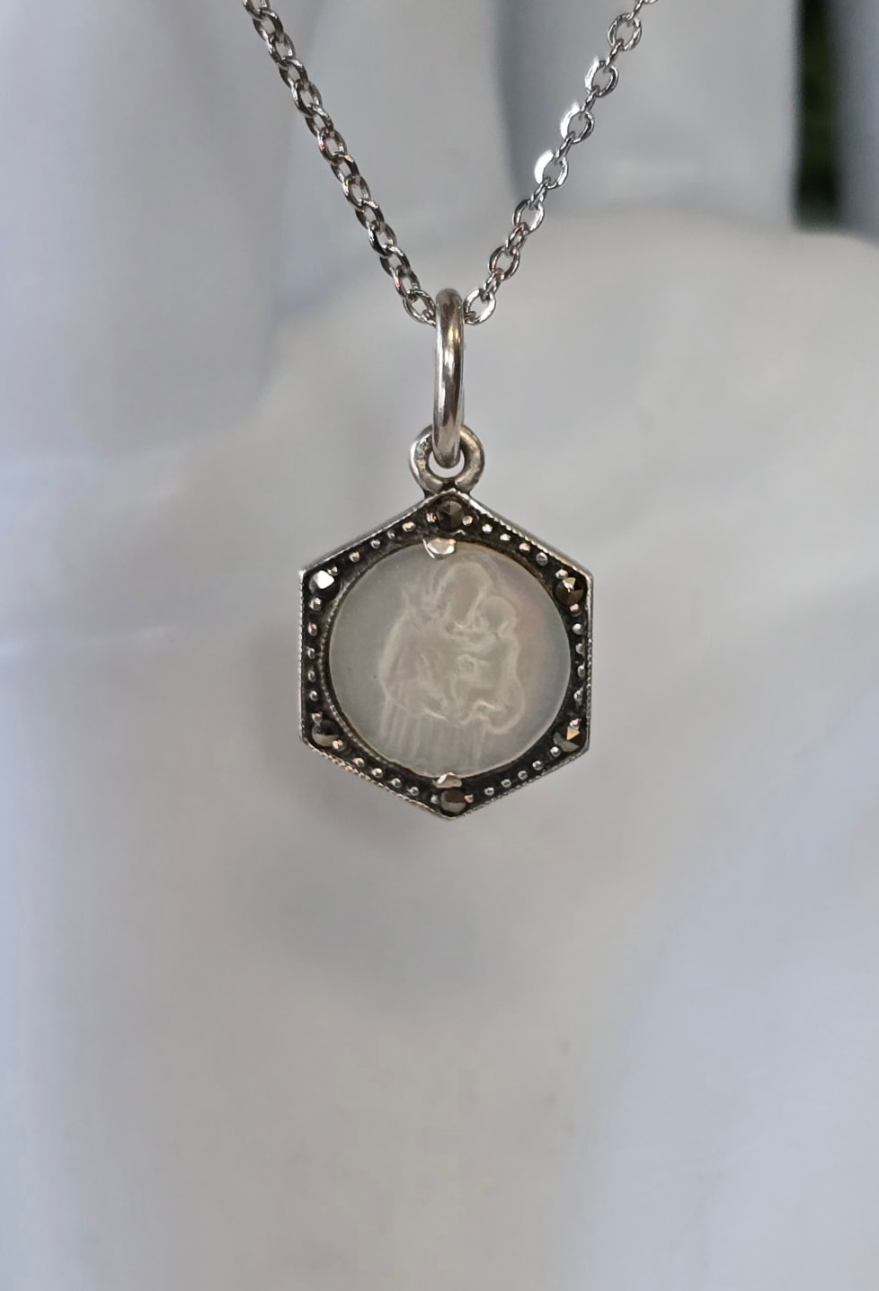 Pandantiv vechi din argint, cu sidef natural sculptat și marcasite.