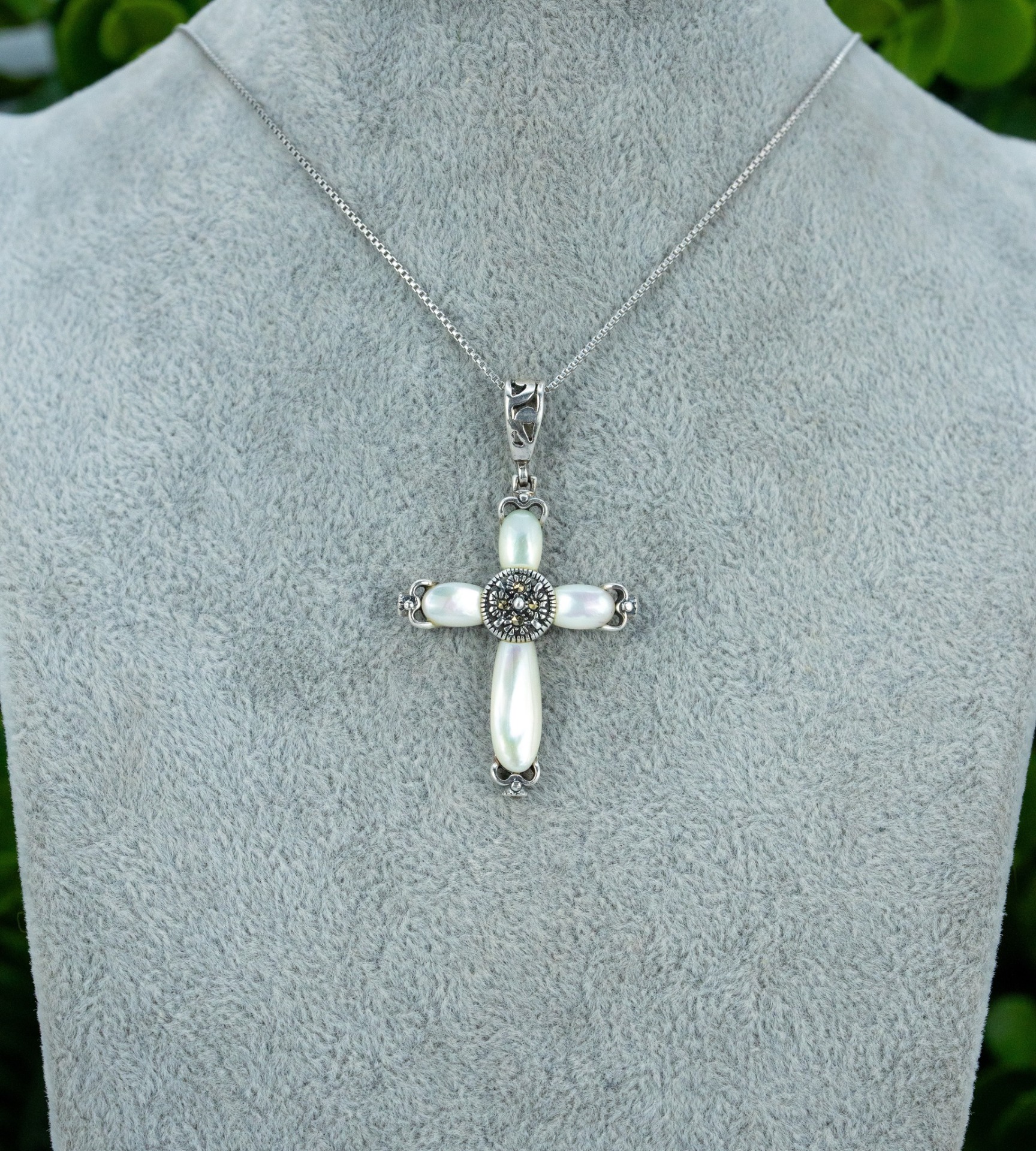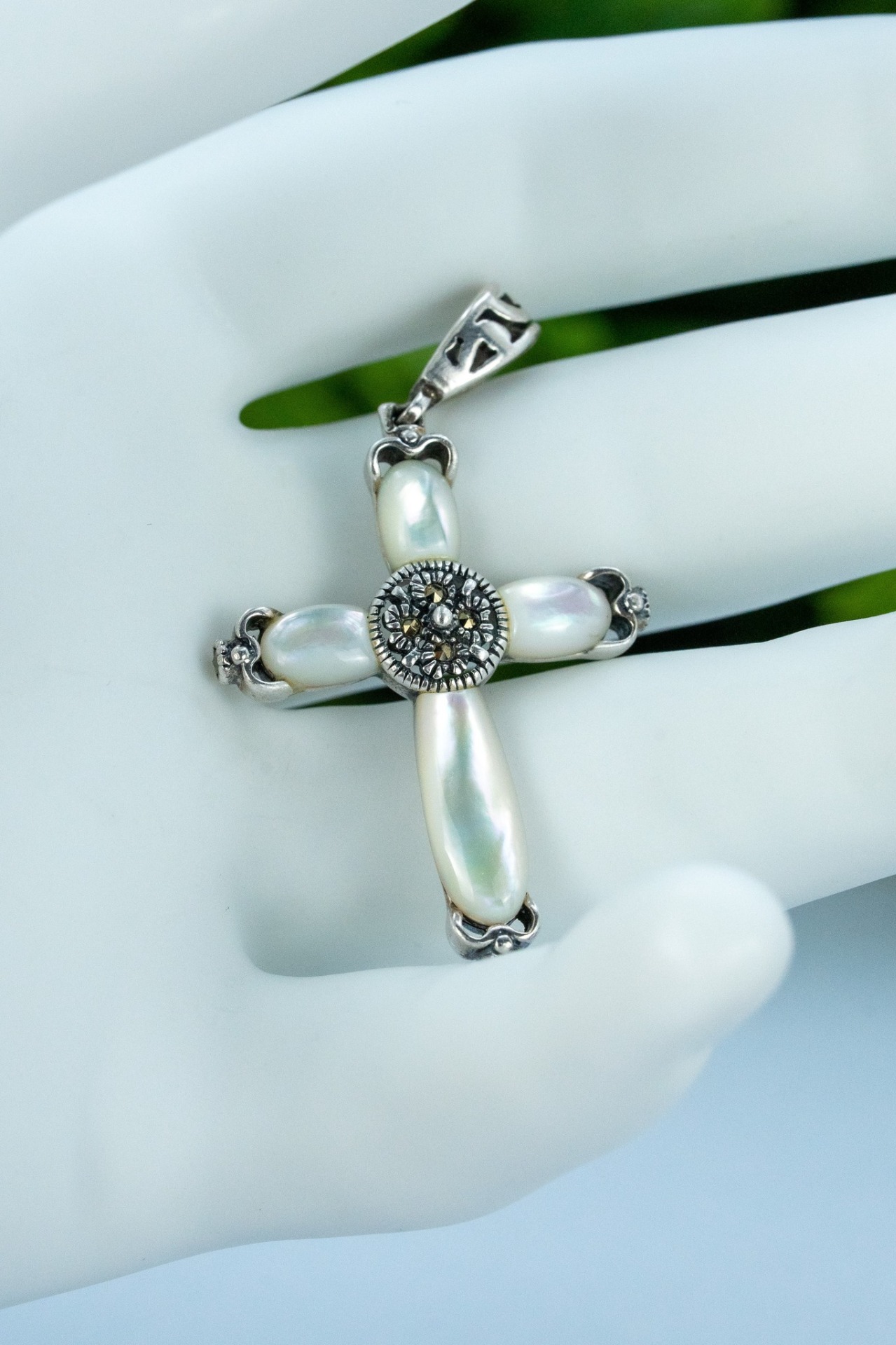 Pandantiv vechi din argint, cu sidef natural și marcasite.