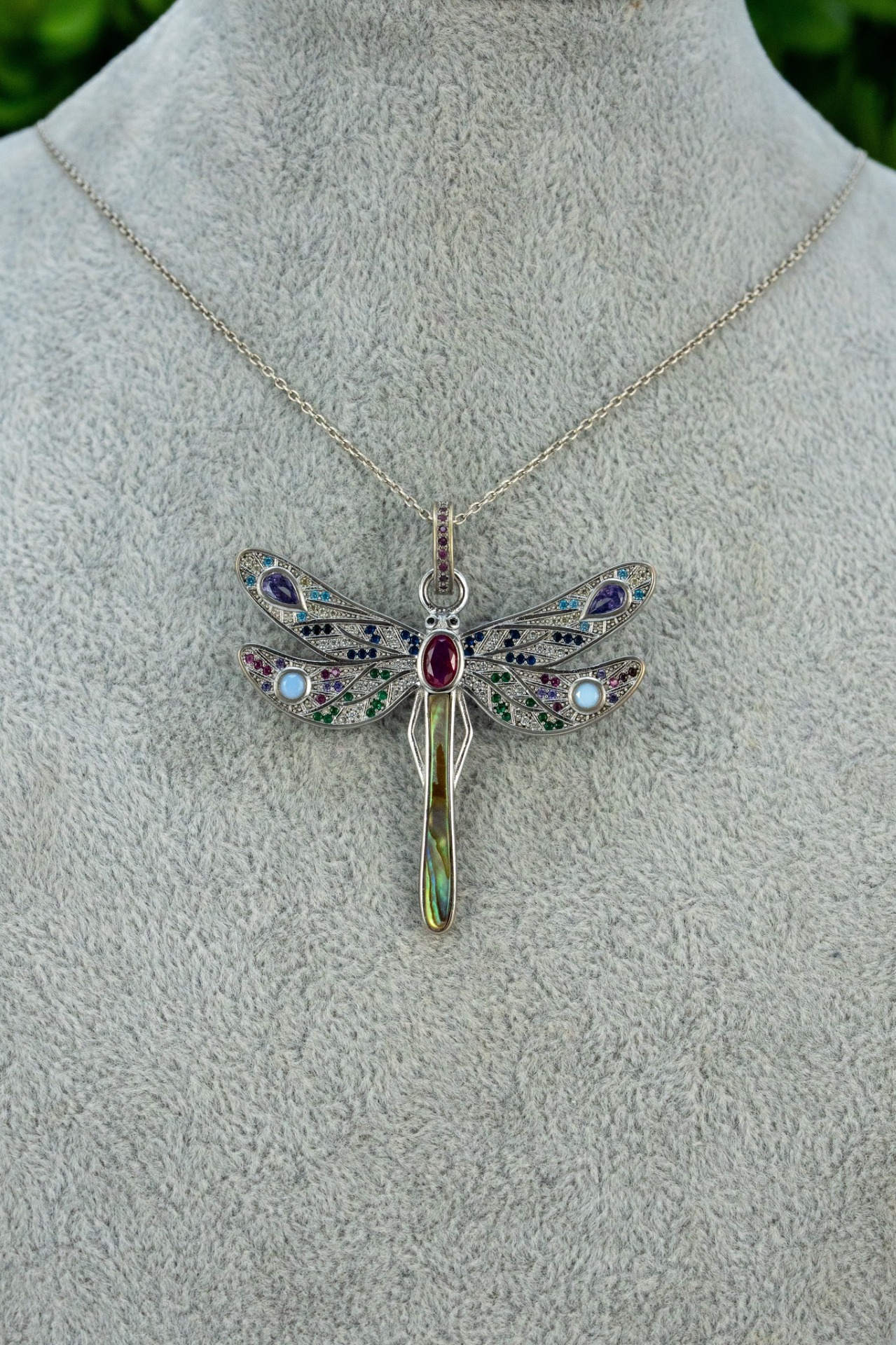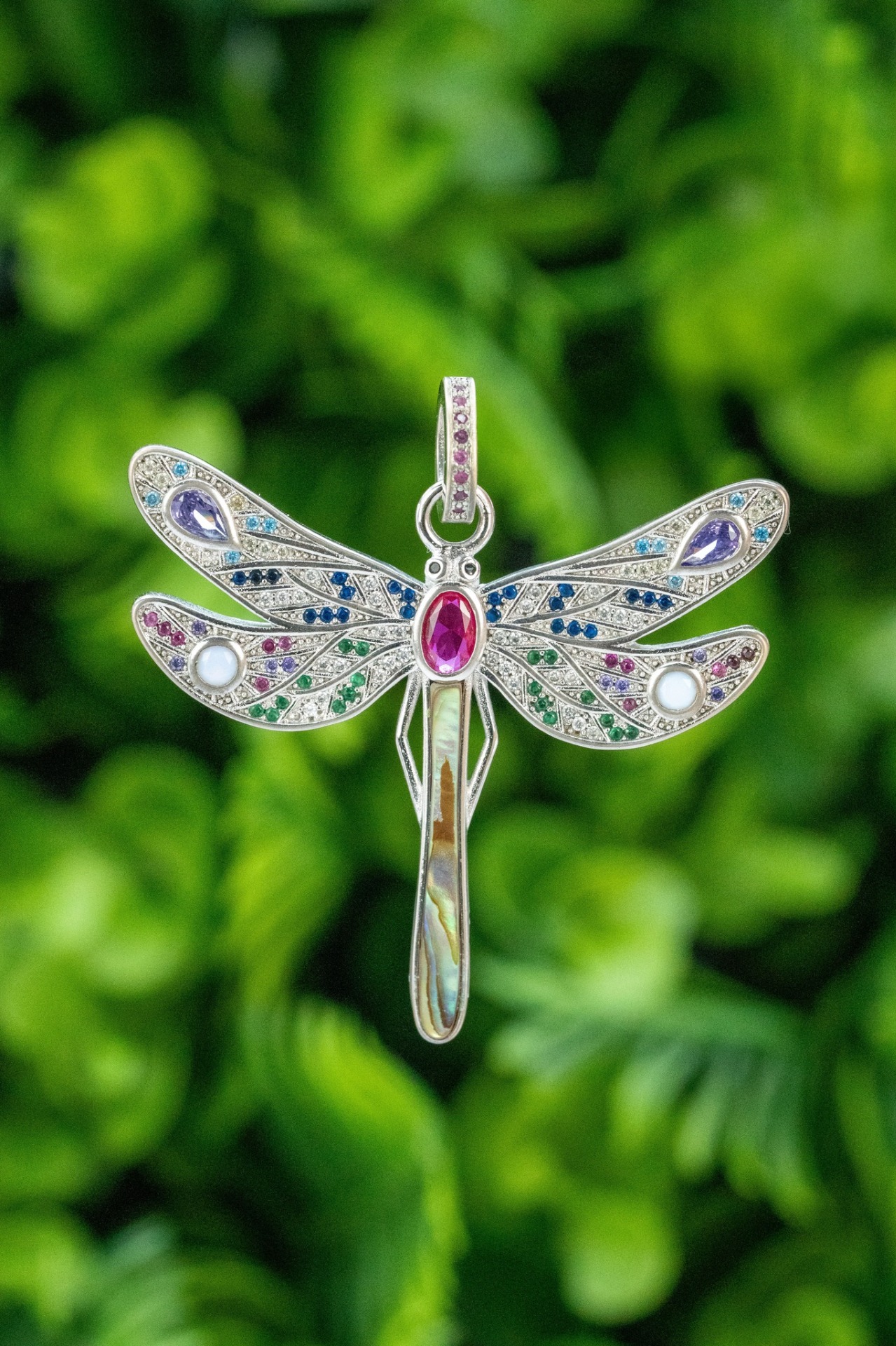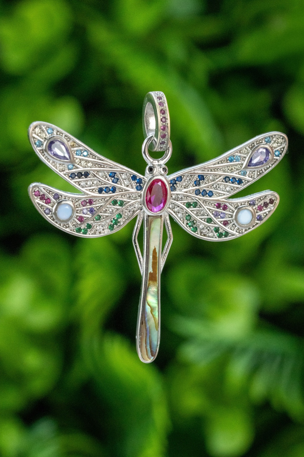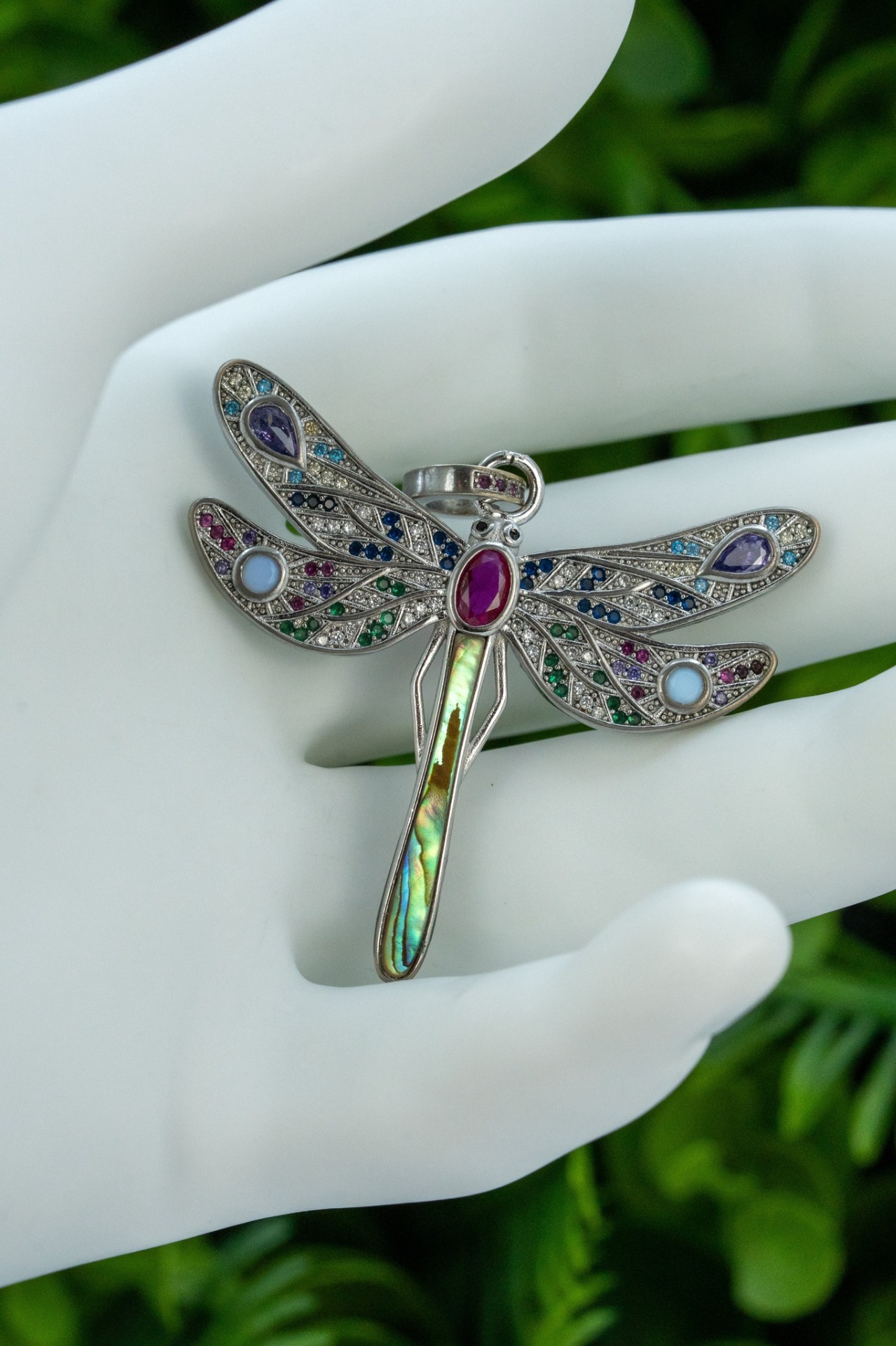 Pandantiv vechi din argint, frumos stilizat in forma unui fluturaș, cu rubin natural și pietre cubic zirconia.