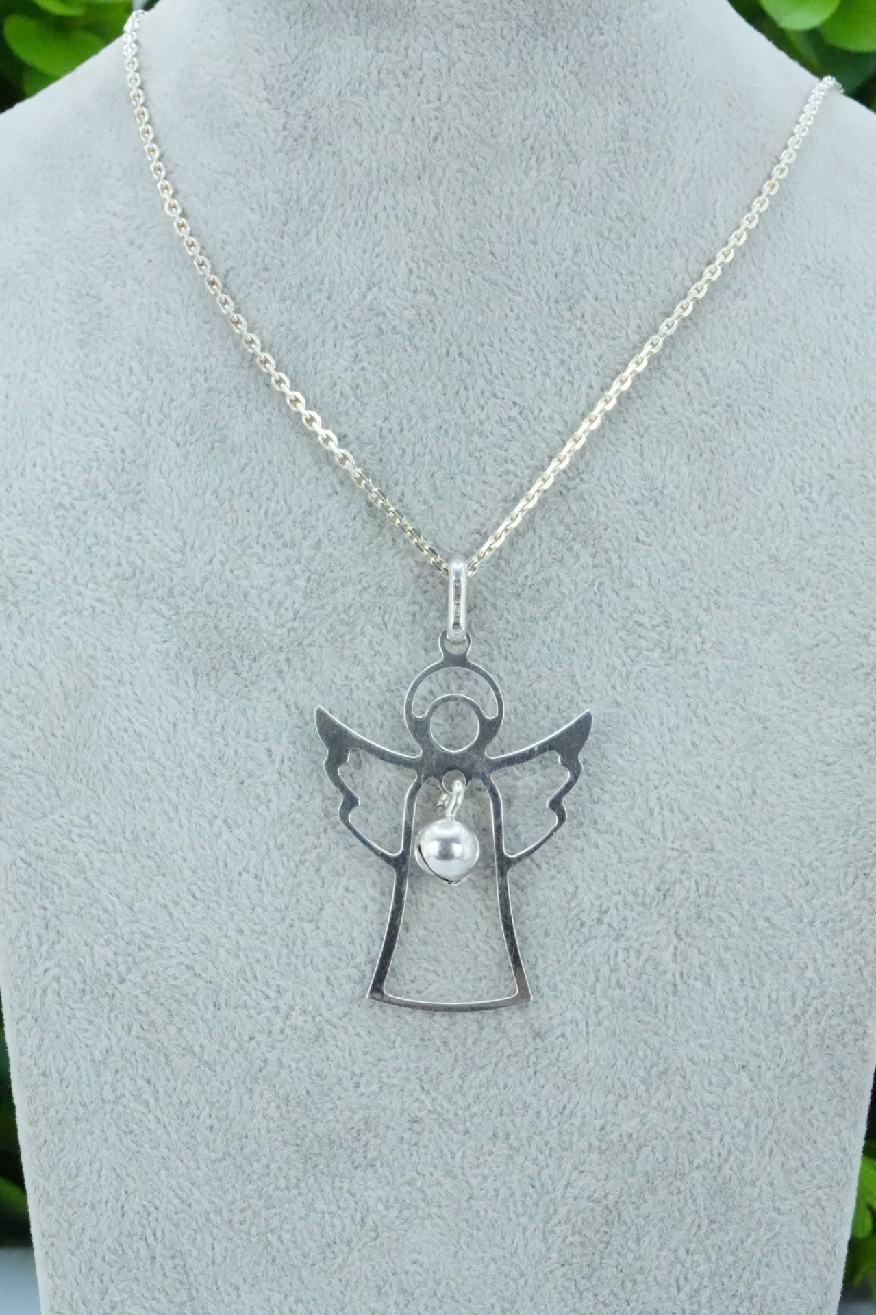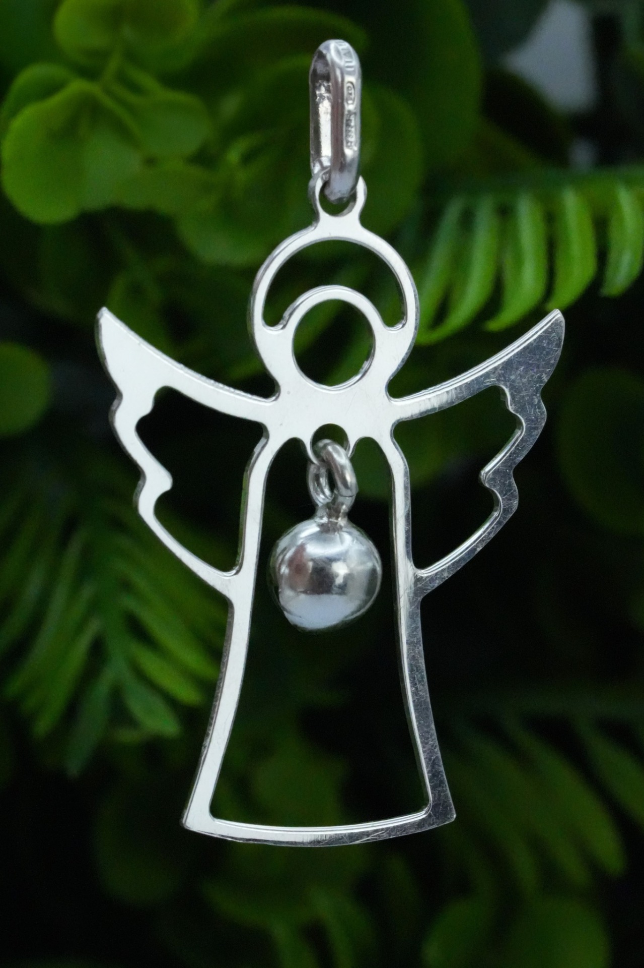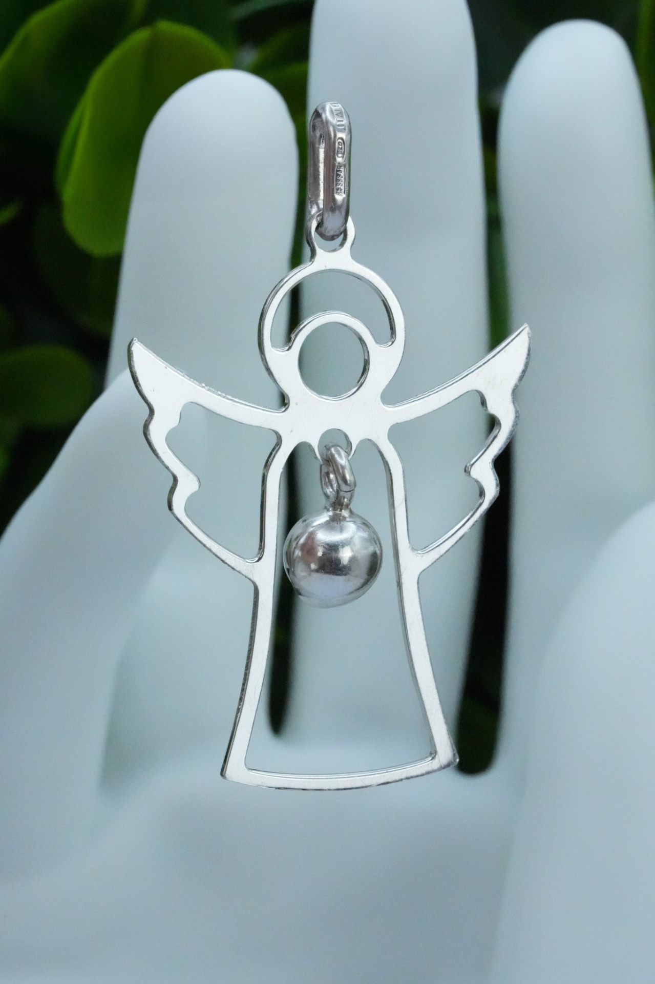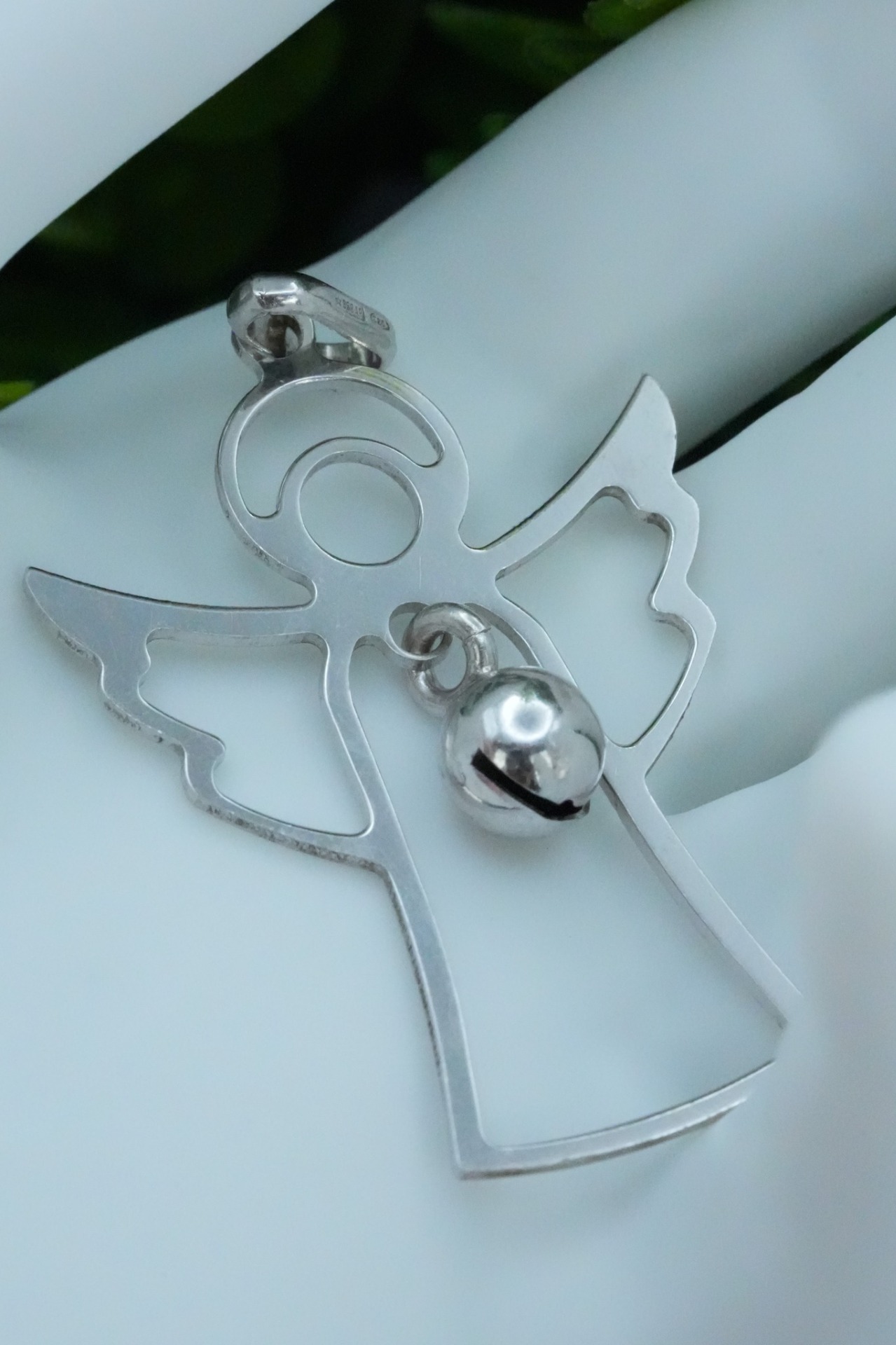 Pandantiv vechi din argint, sub forma unui îngeraș, cu clopoțel.