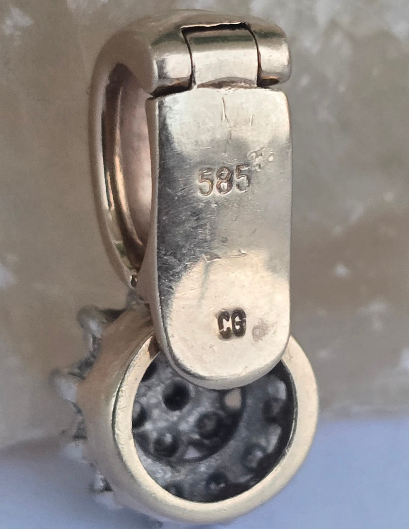 Prezintă marcaj 585 pentru puritate aur de 14K.
