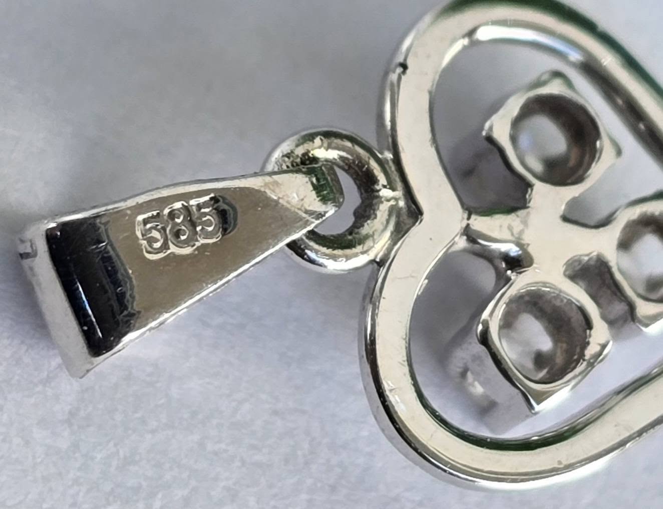 Prezintă marcaj 585 pentru puritate aur de 14K.
