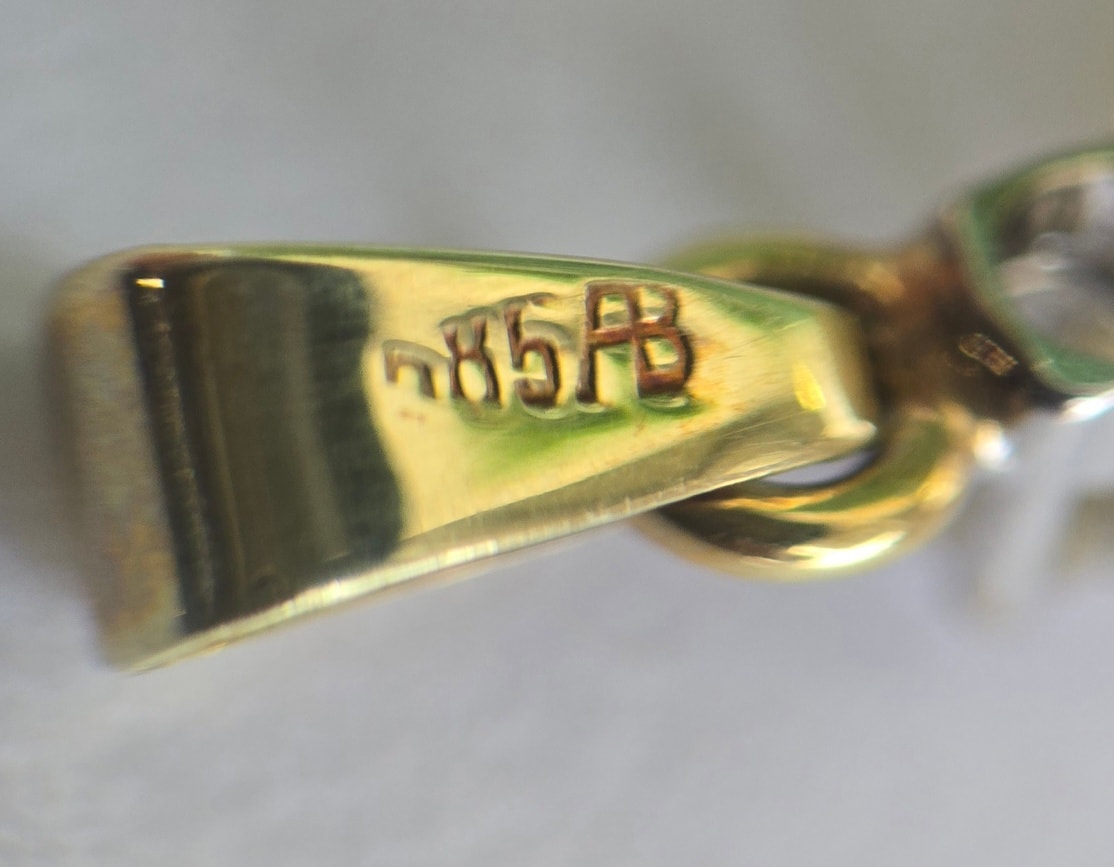 Prezintă marcaj 585 pentru puritate aur de 14K și marcaj de meșter.