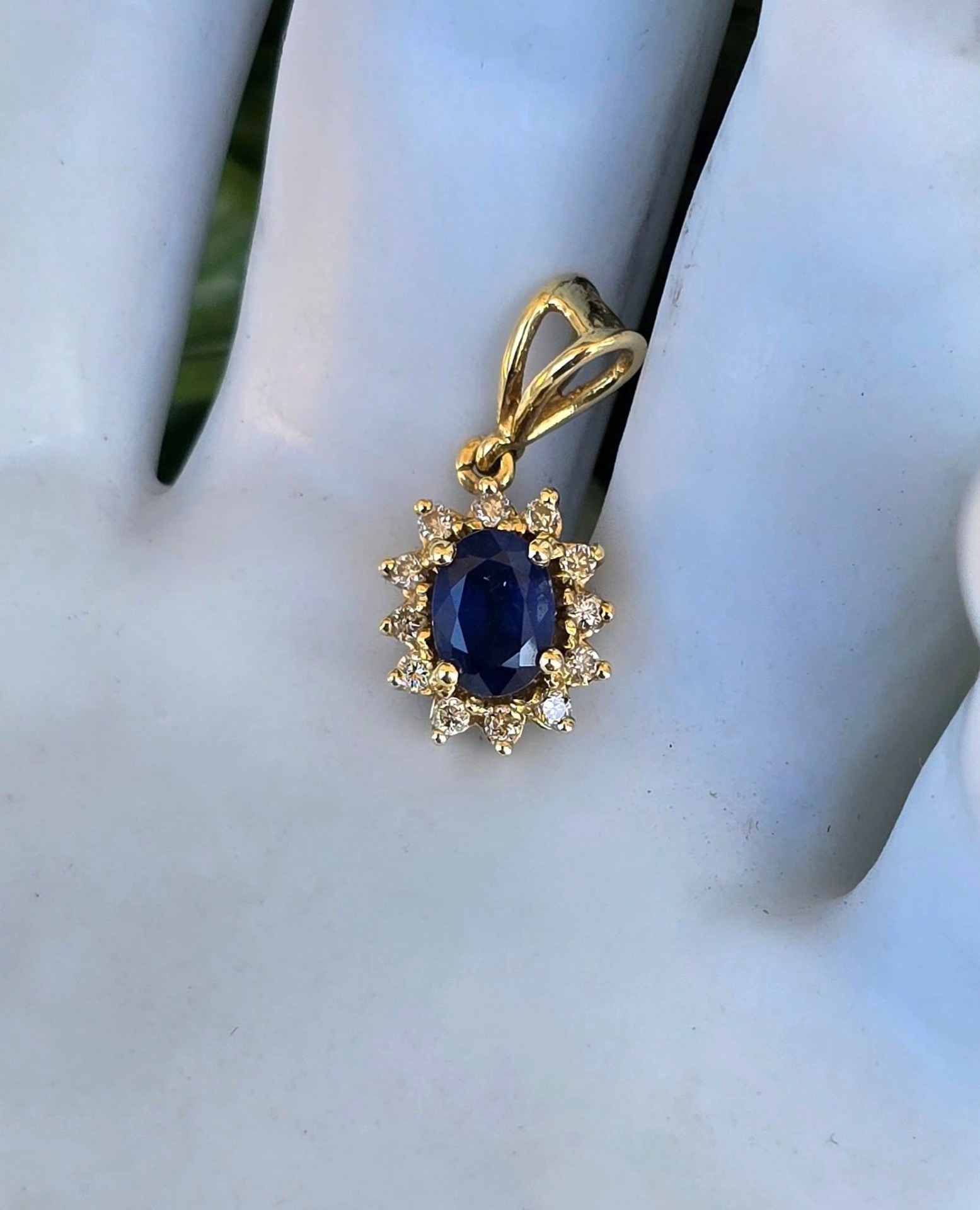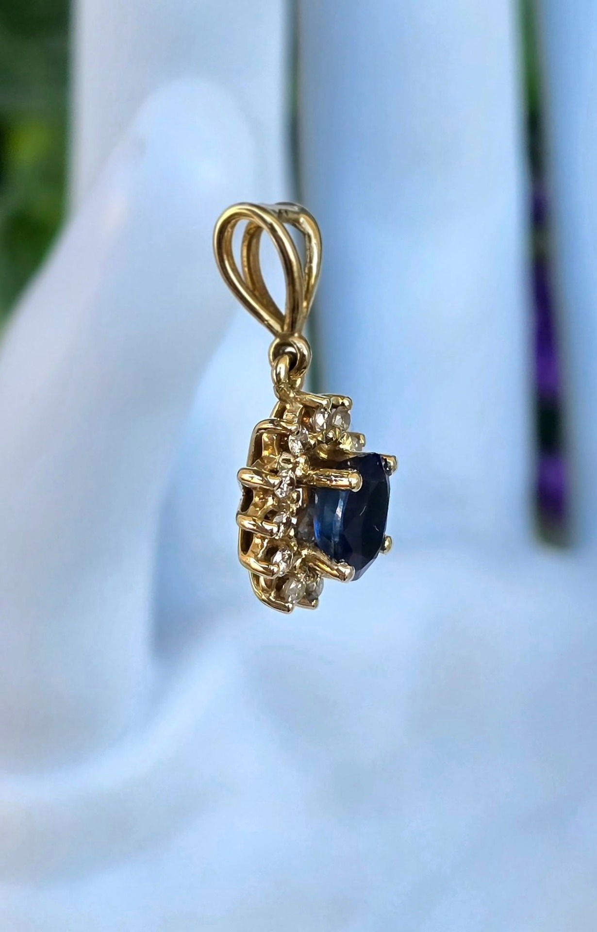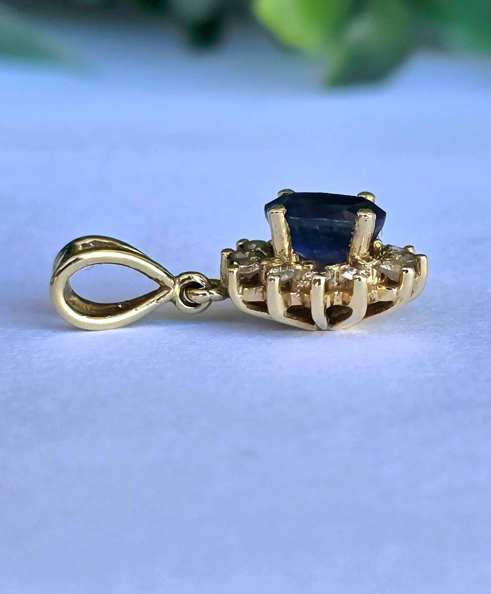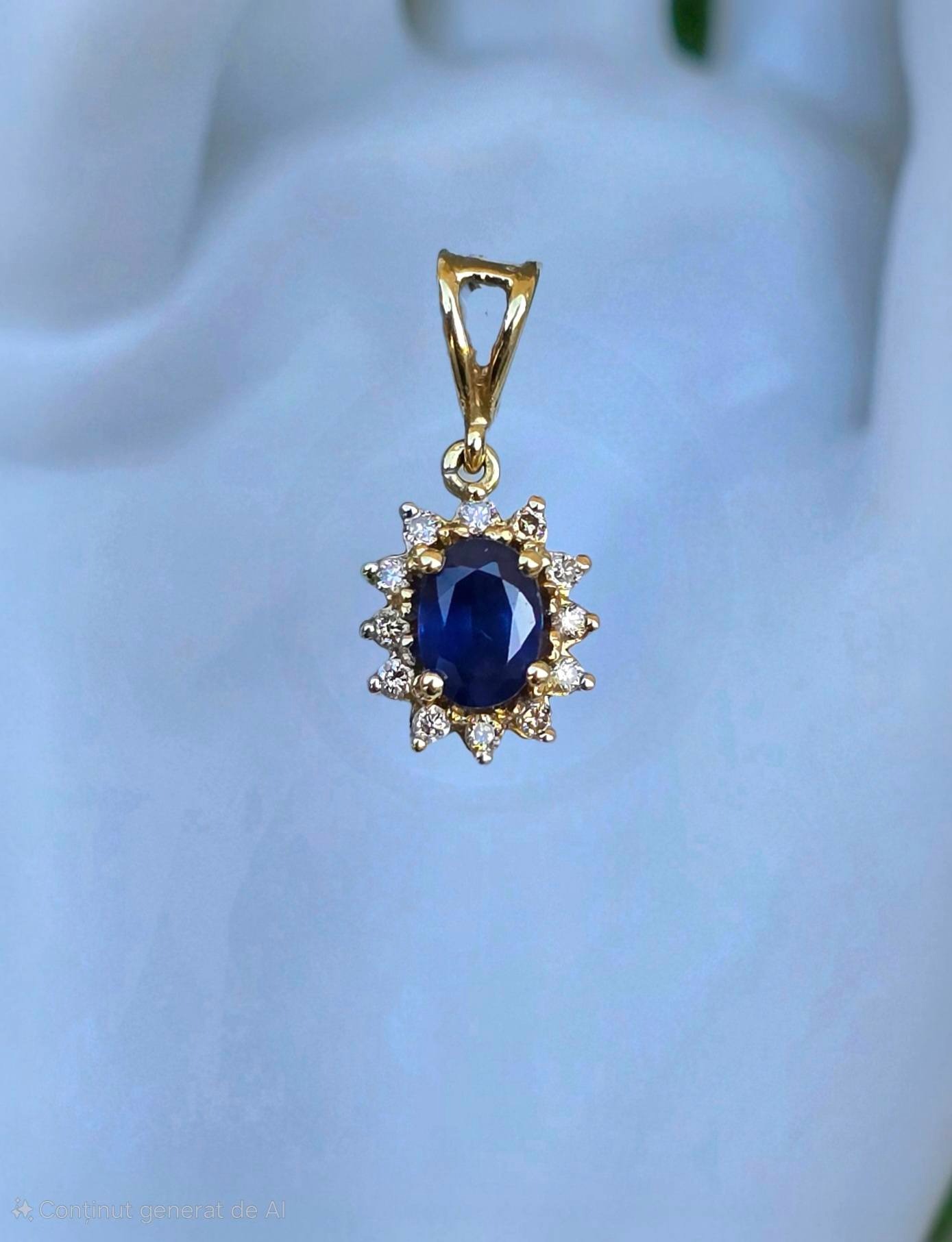 Pandantiv vechi din aur de 14K, cu un superb safir și 12 diamante naturale.