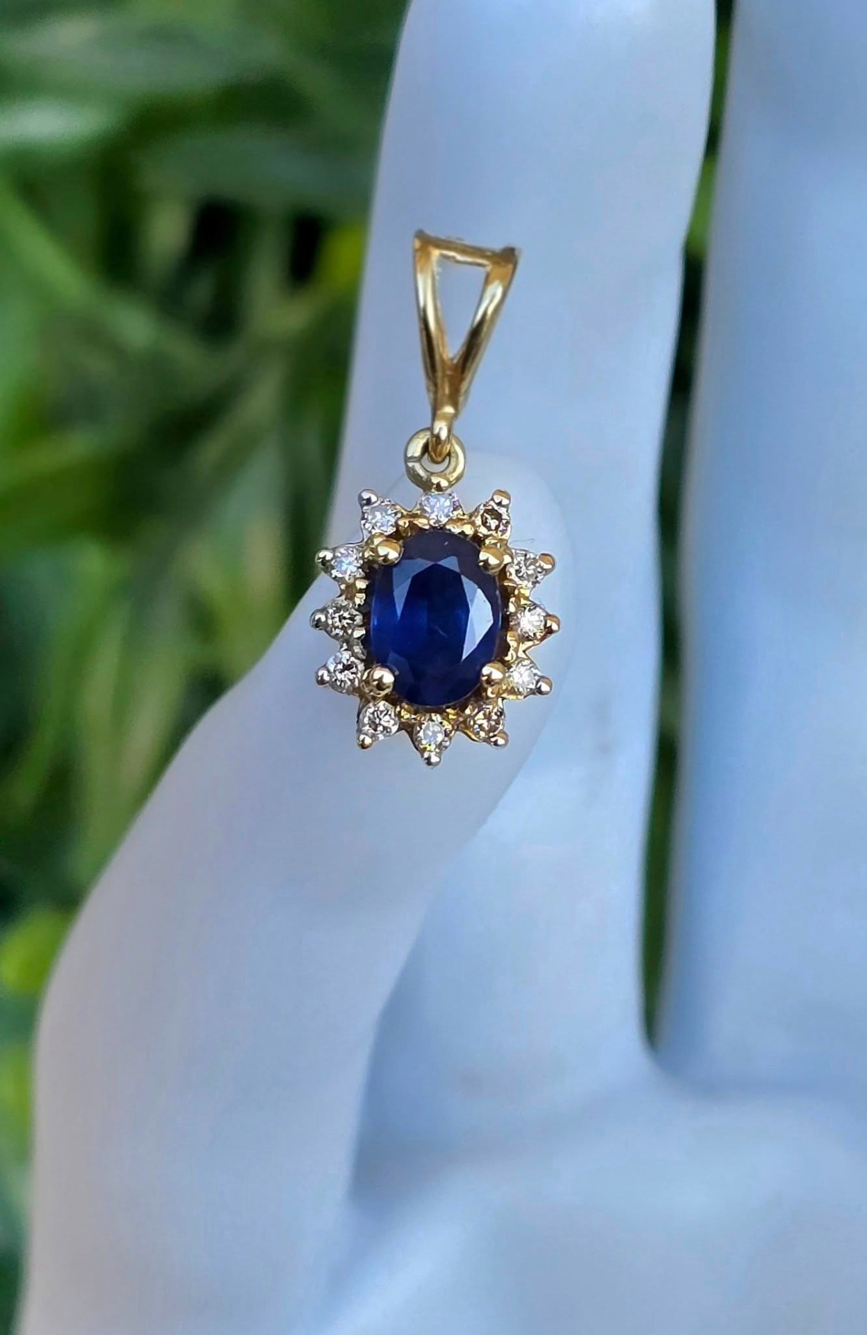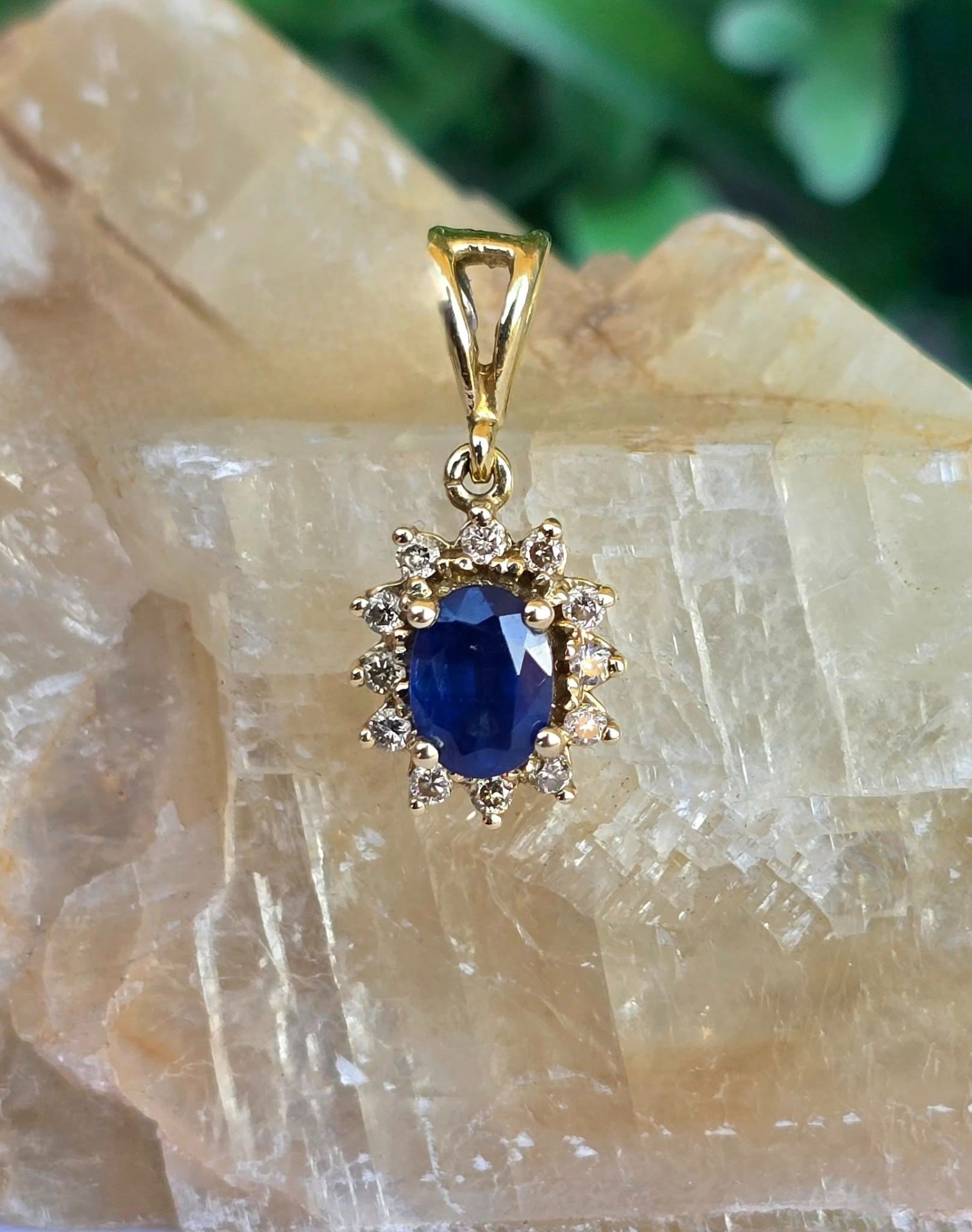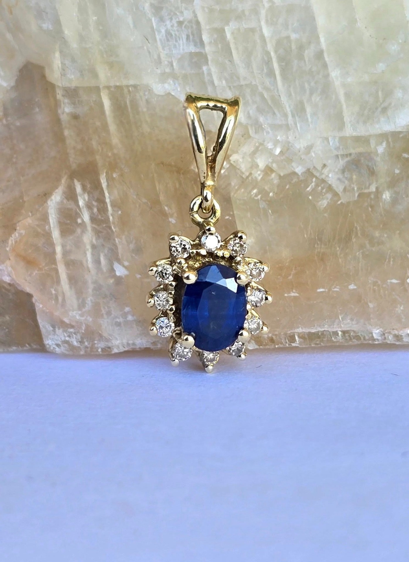Pandantiv vechi din aur de 14K, cu un superb safir și 12 diamante naturale.