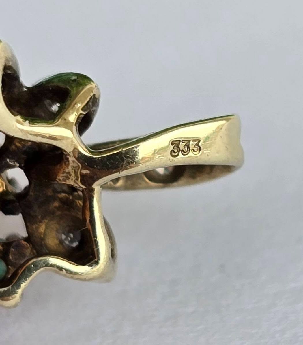 Prezintă marcaj 333 pentru puritate aur de 8K și marcaj "0.04" pentru caratajul diamantelor.