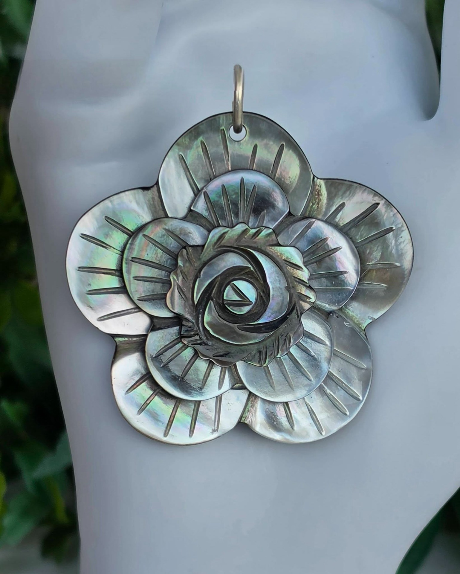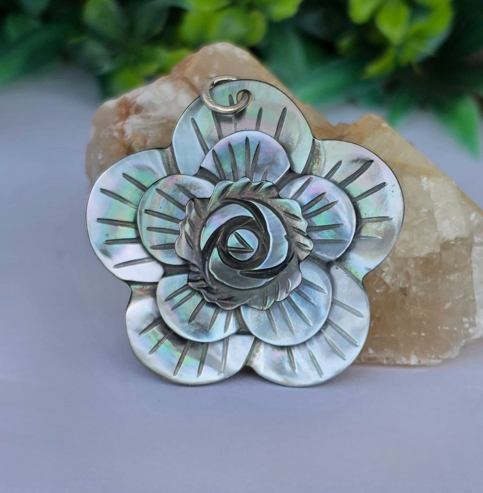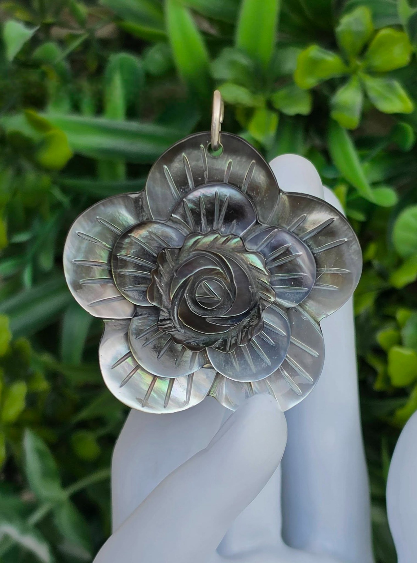 Pandantiv vechi din sidef natural sculptat în formă de floare, cu anou din argint.