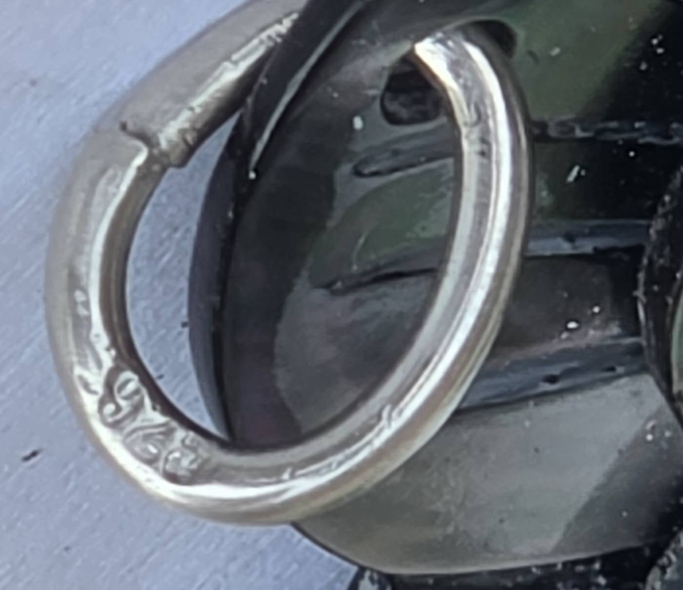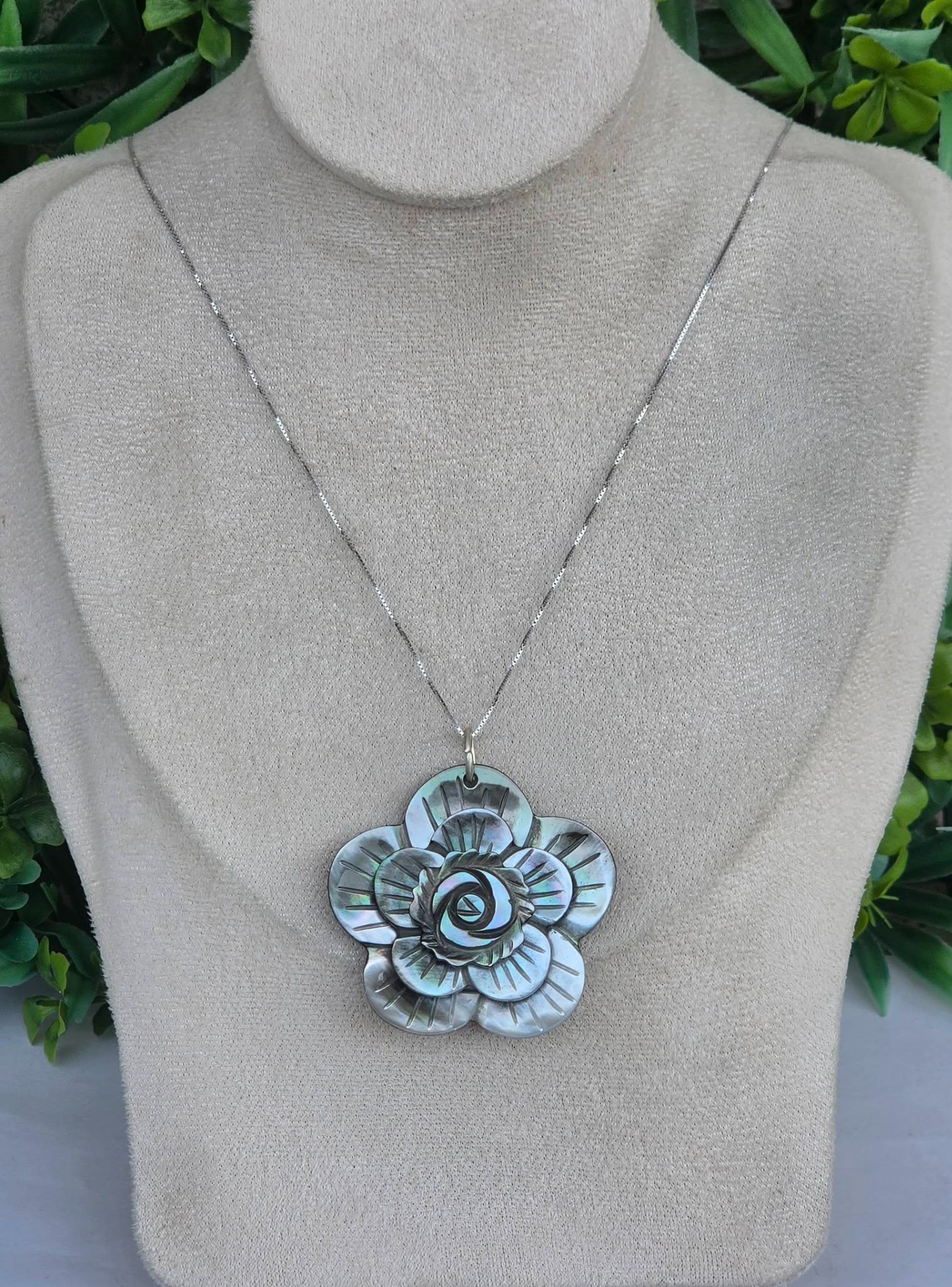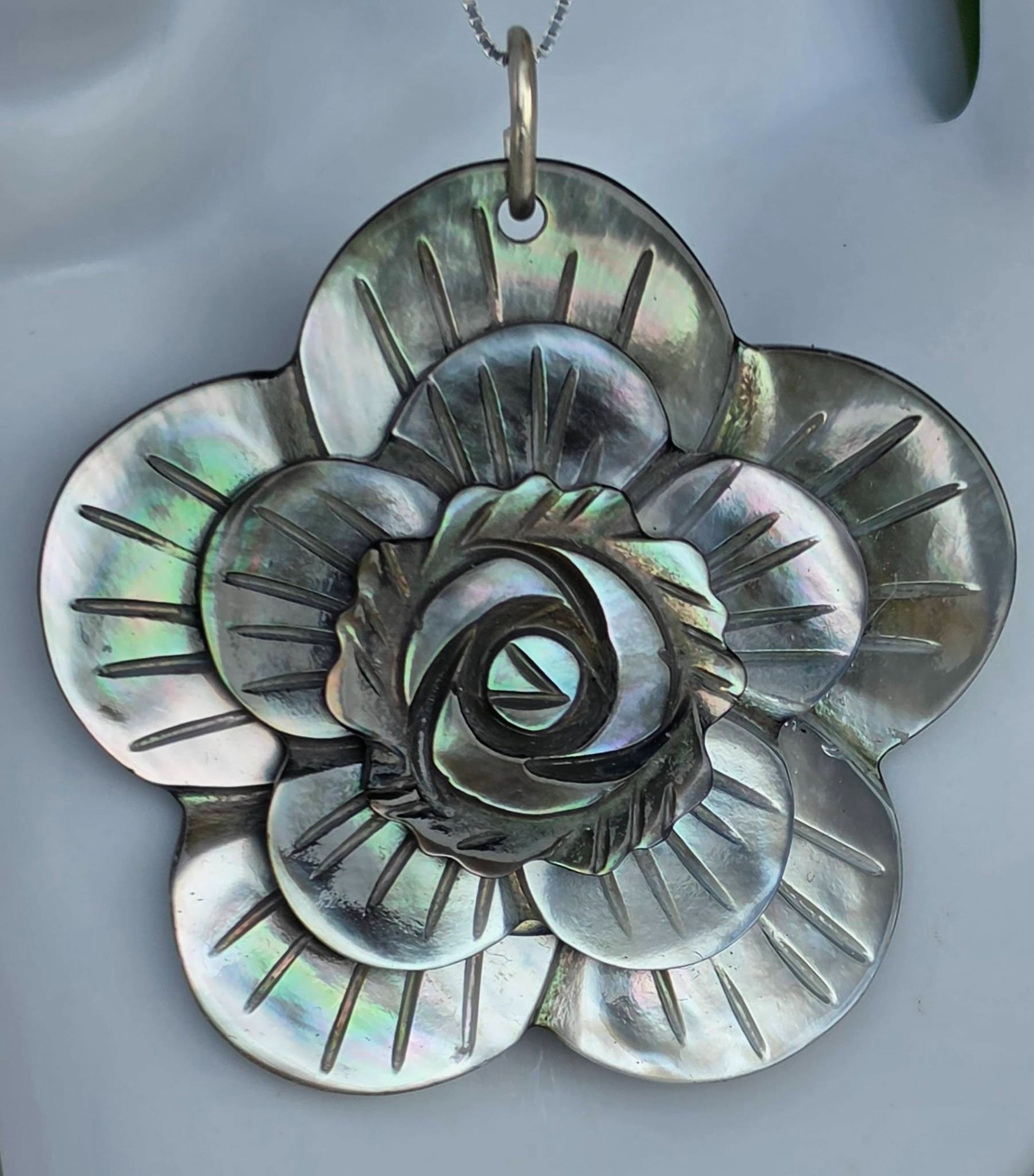 Pandantiv vechi din sidef natural sculptat în formă de floare, cu anou din argint.