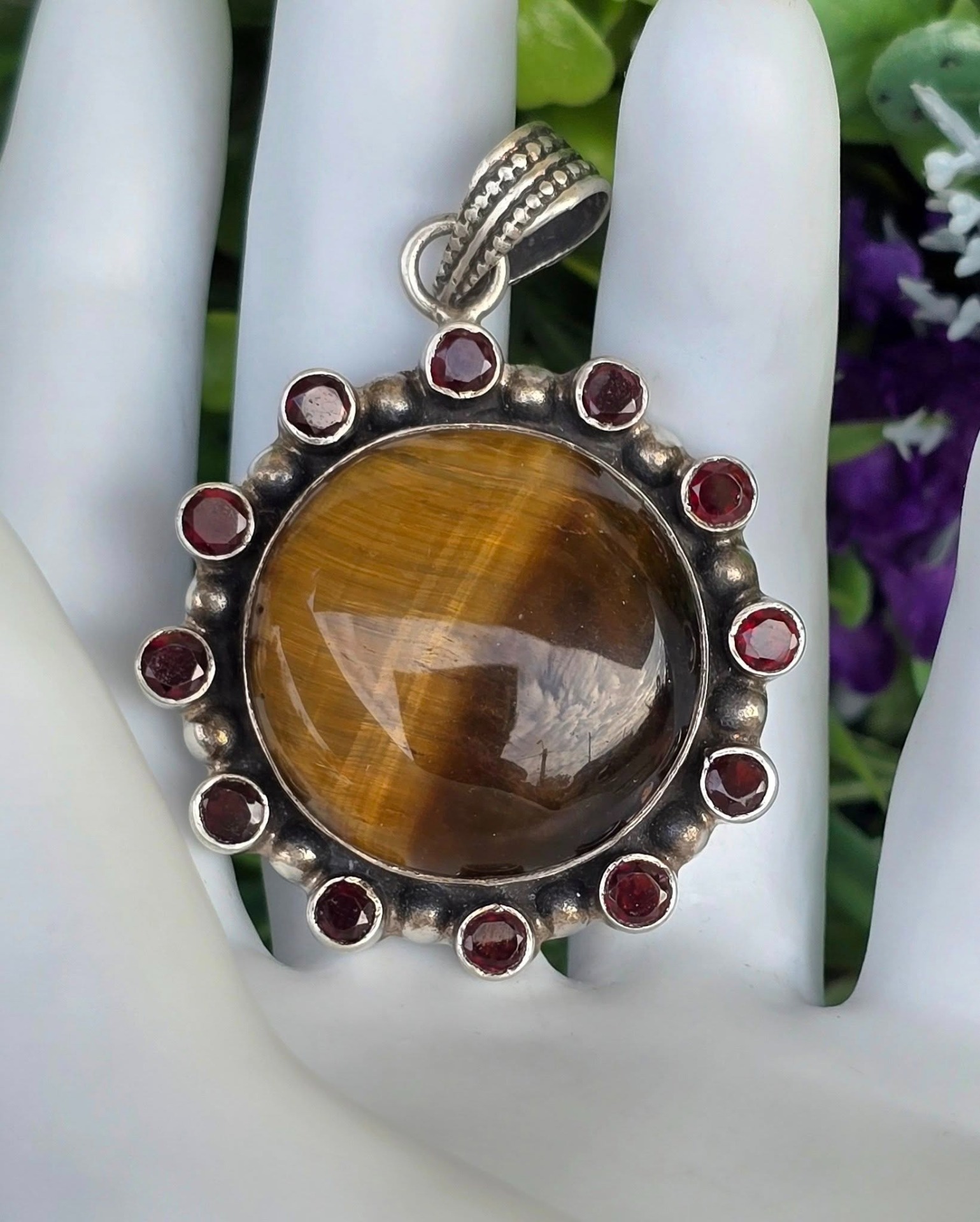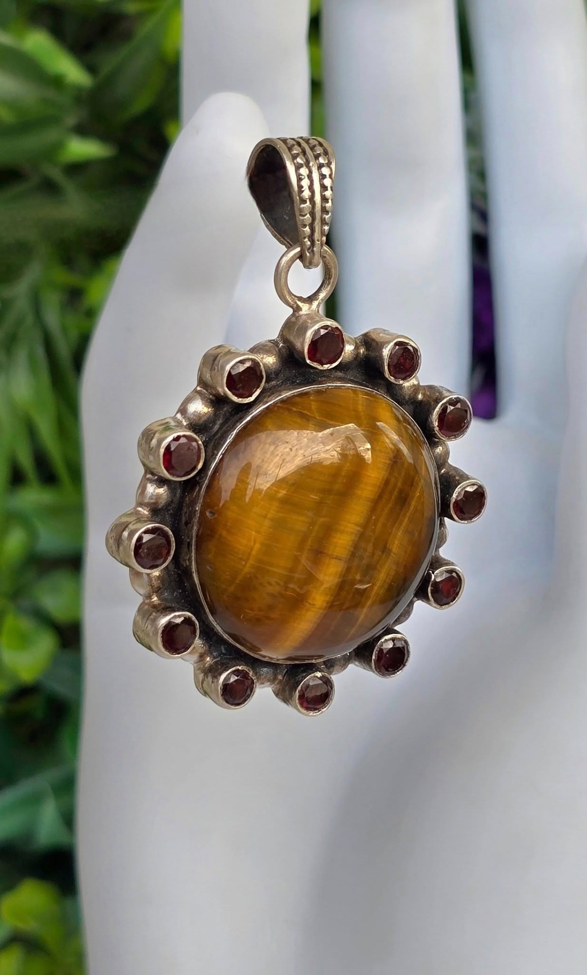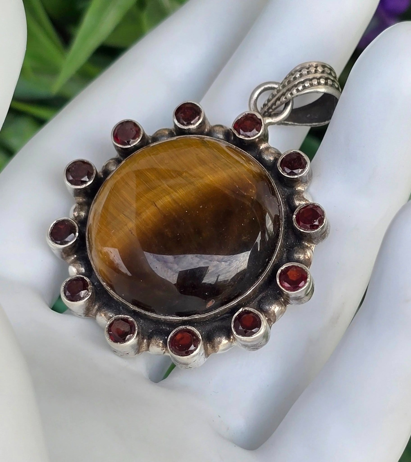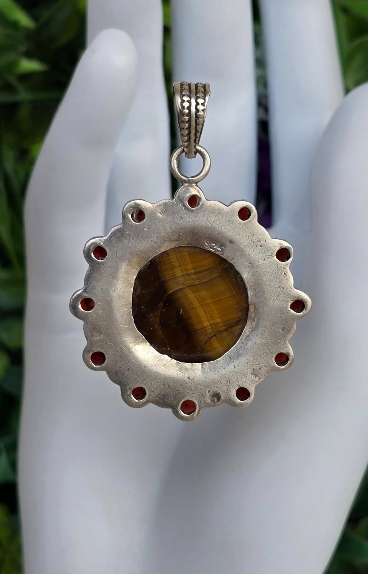Pandantiv vechi grandios, din argint, cu ochi de tigru ("tiger's eye") și granate naturale.