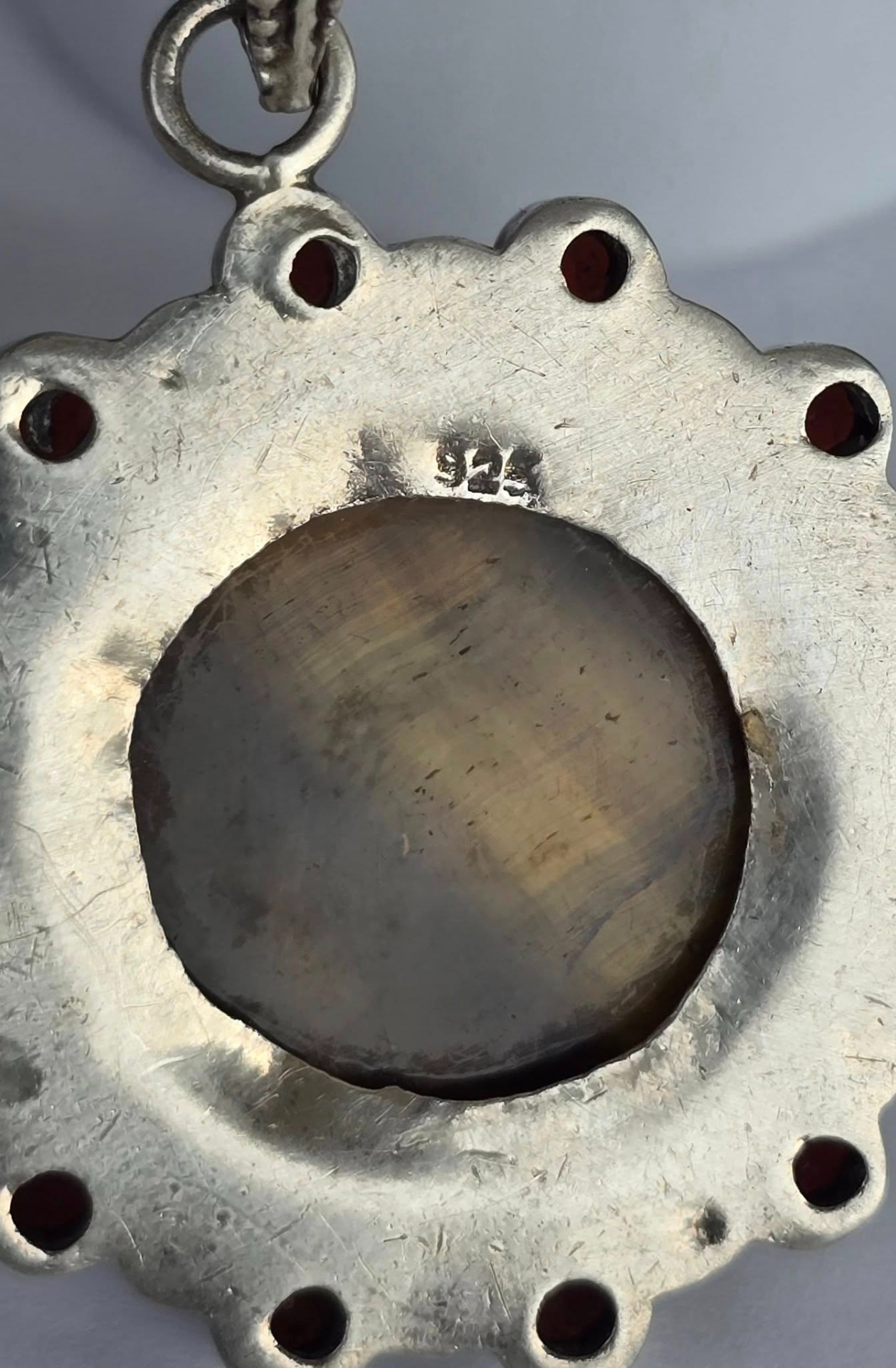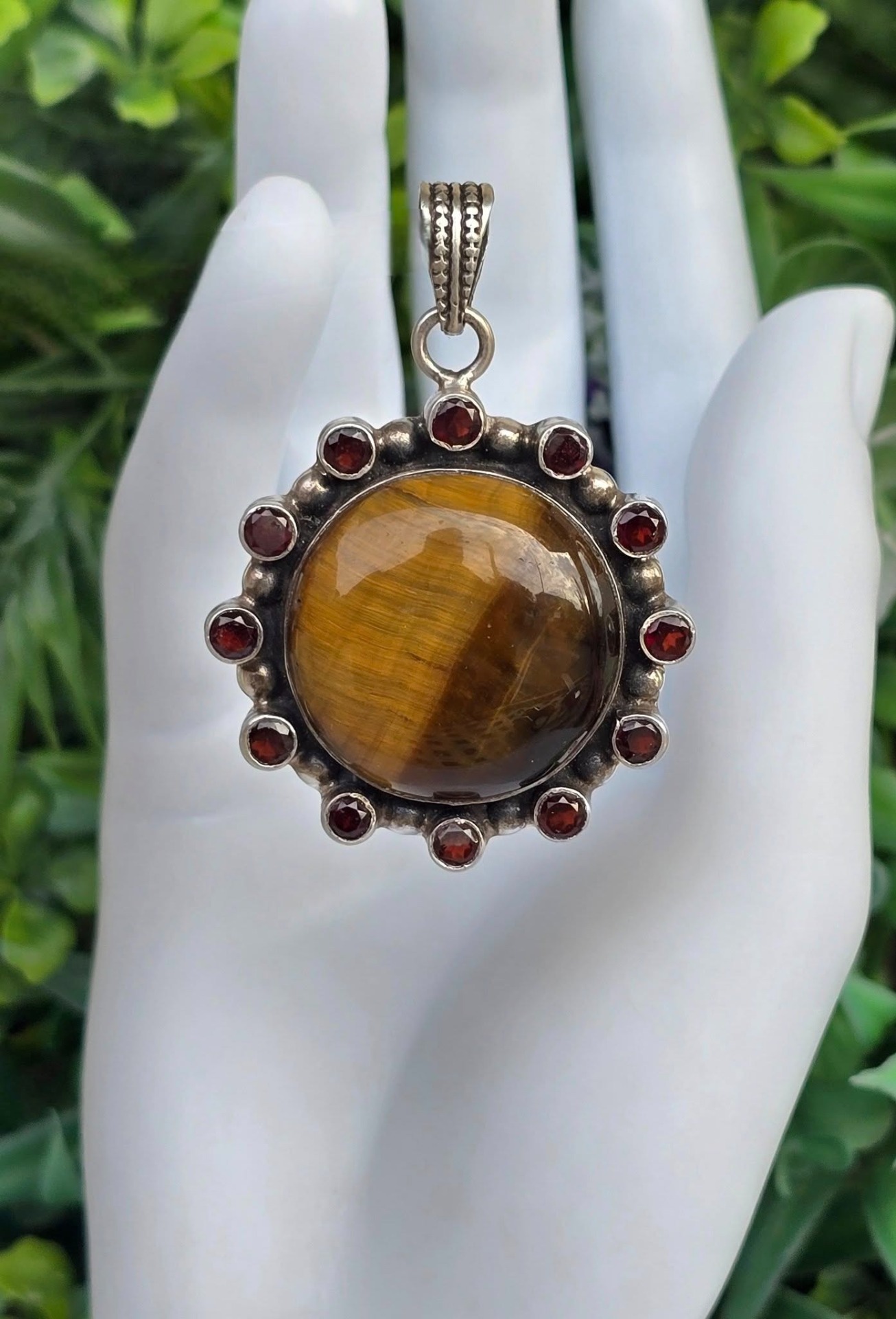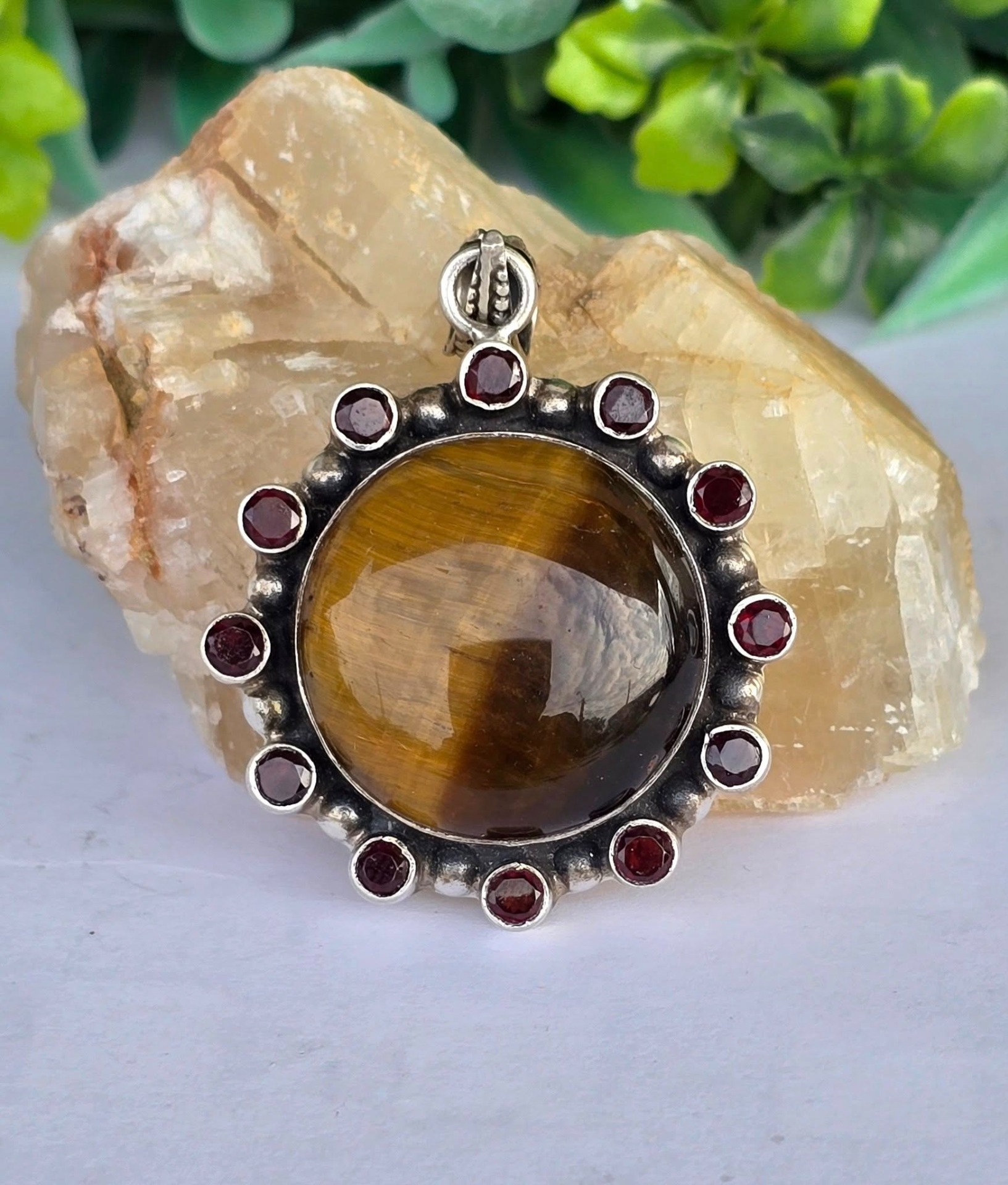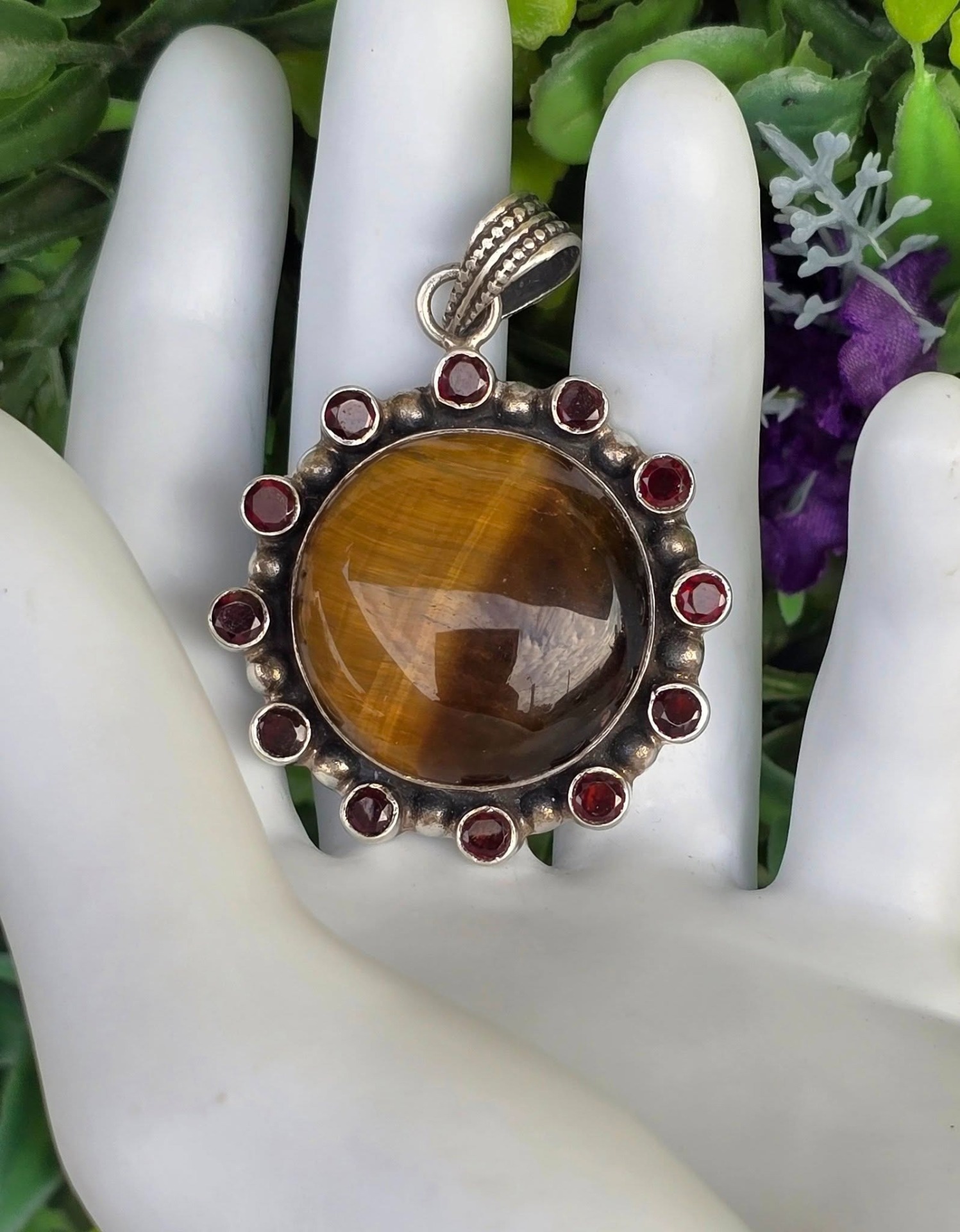 Pandantiv vechi grandios, din argint, cu ochi de tigru ("tiger's eye") și granate naturale.