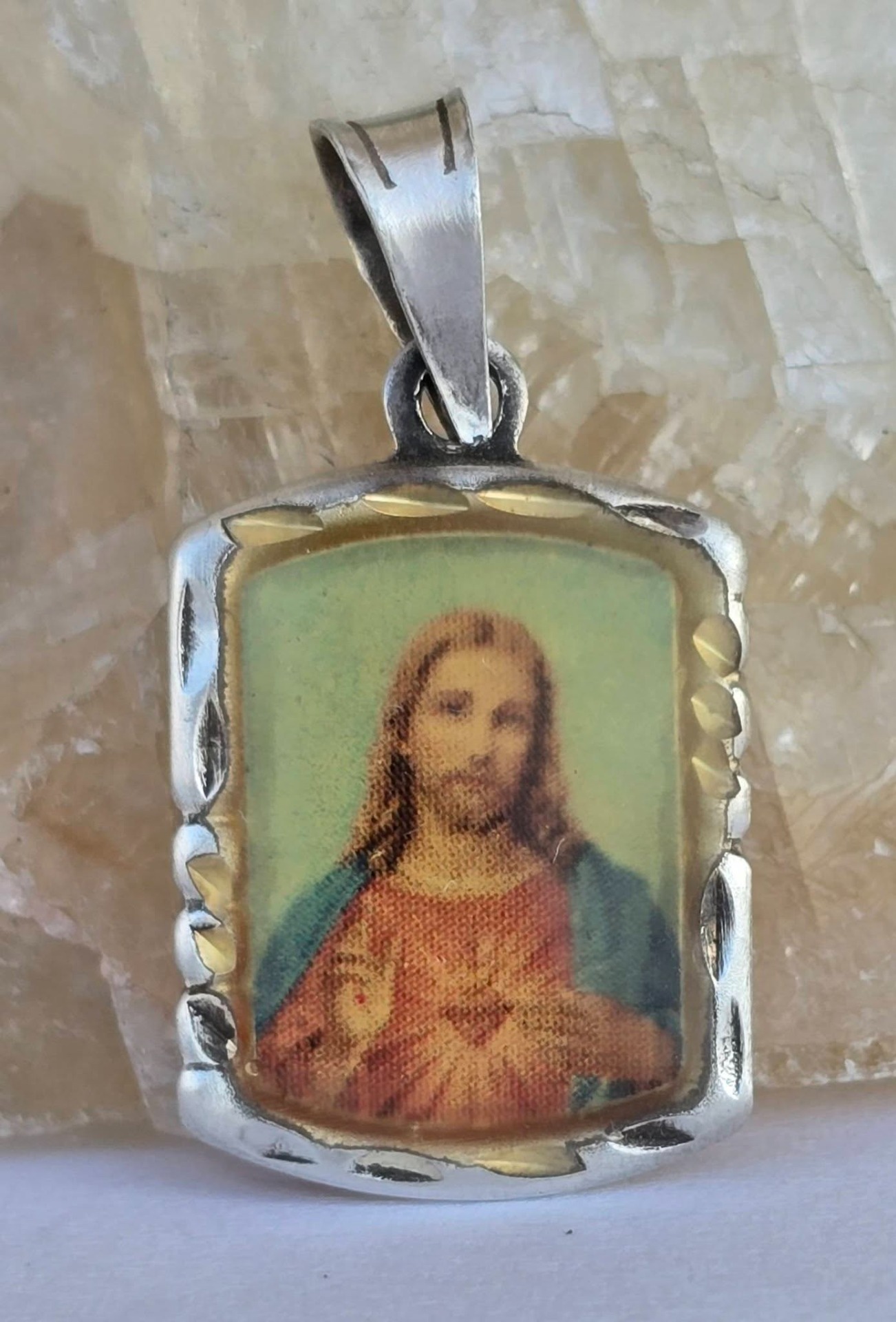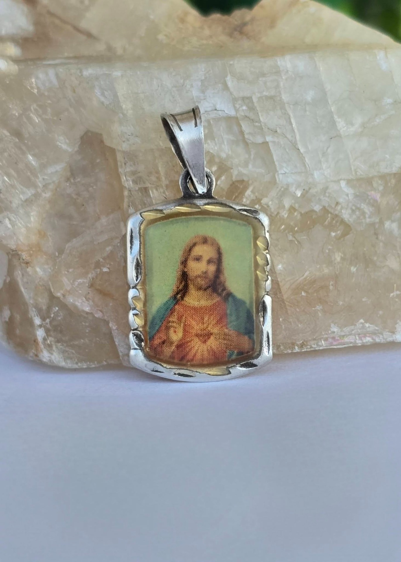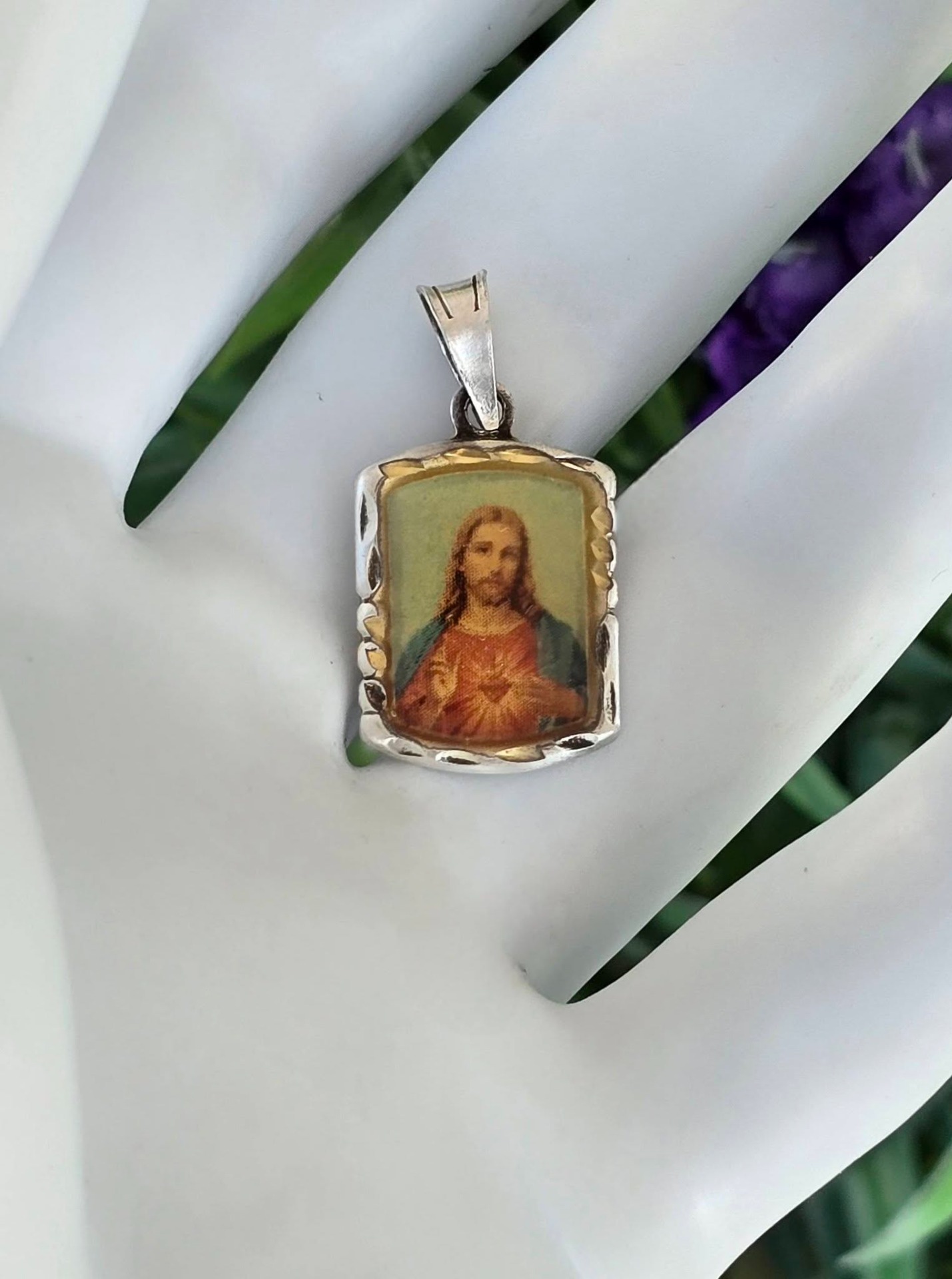 Pandantiv vechi religios, din argint și argint aurit, cu "Iisus și Inima Sacră", print protejat de rășină.