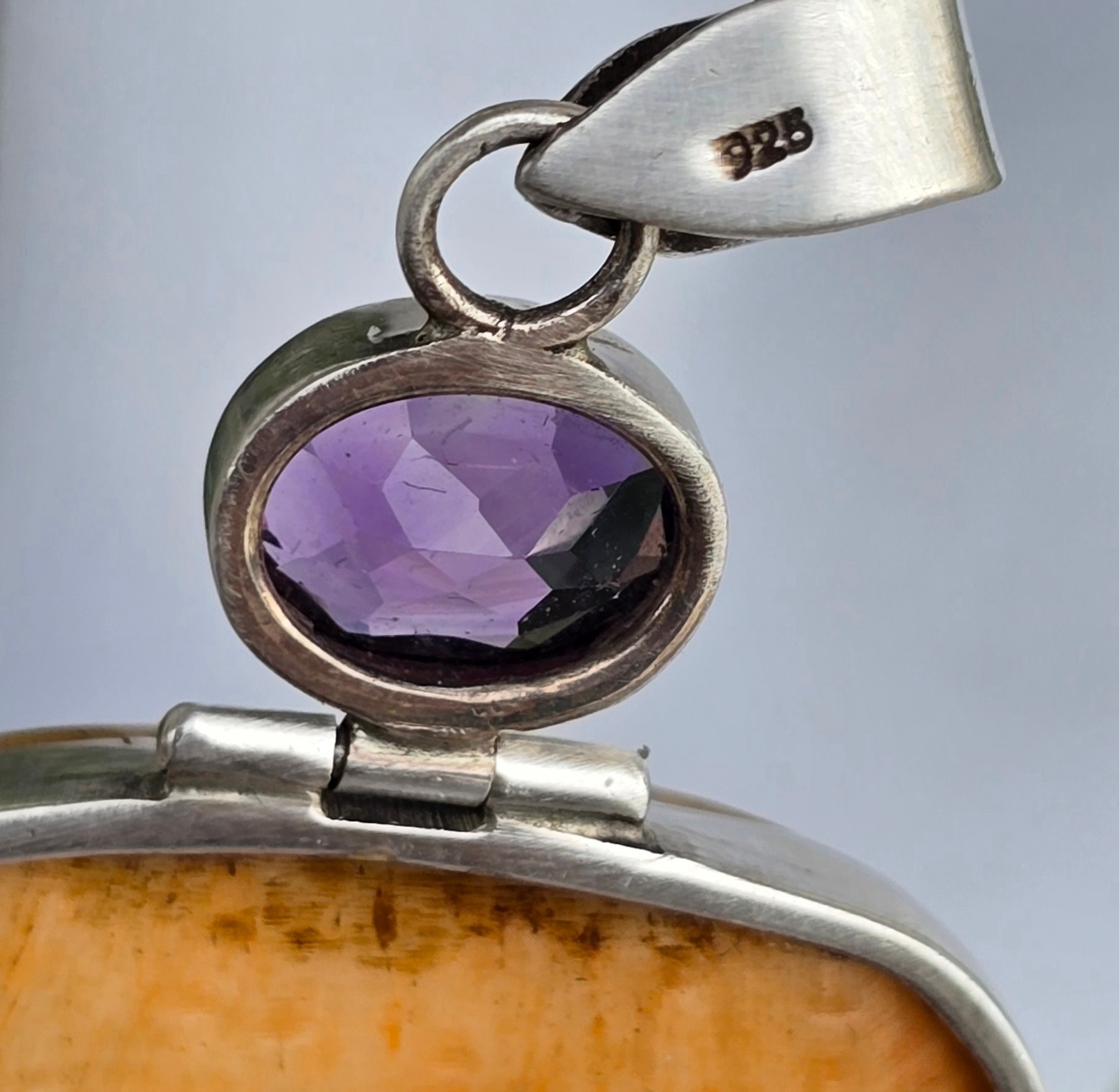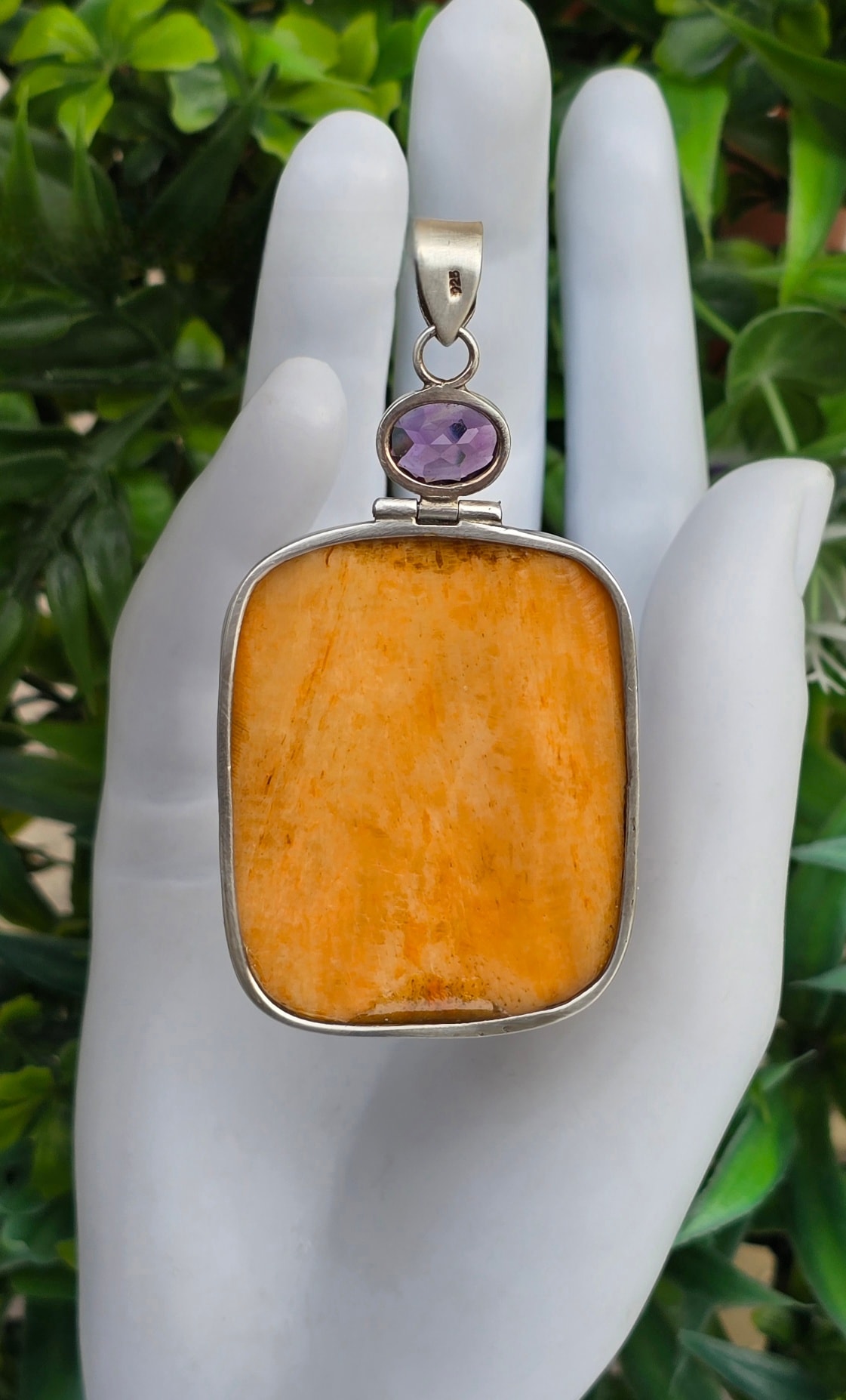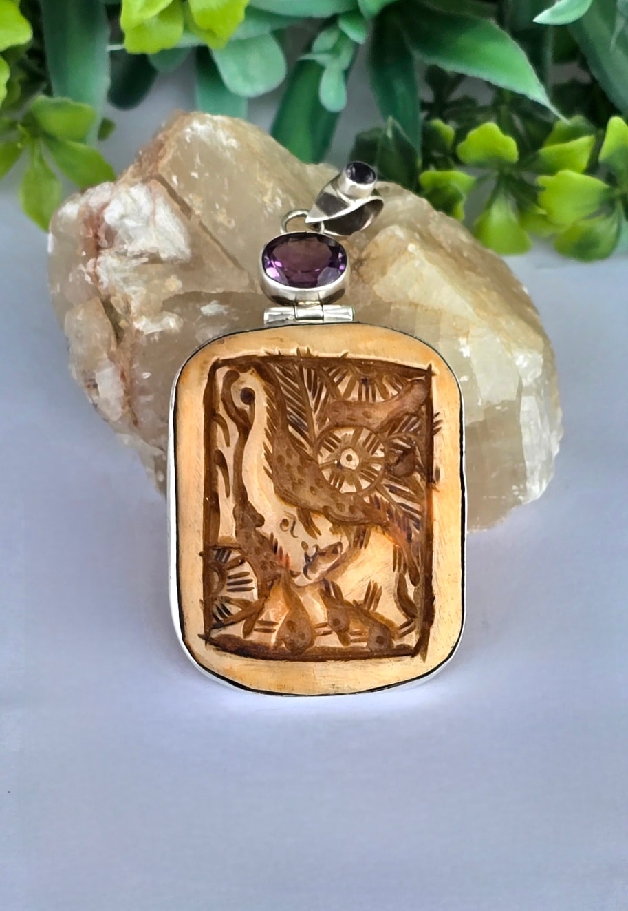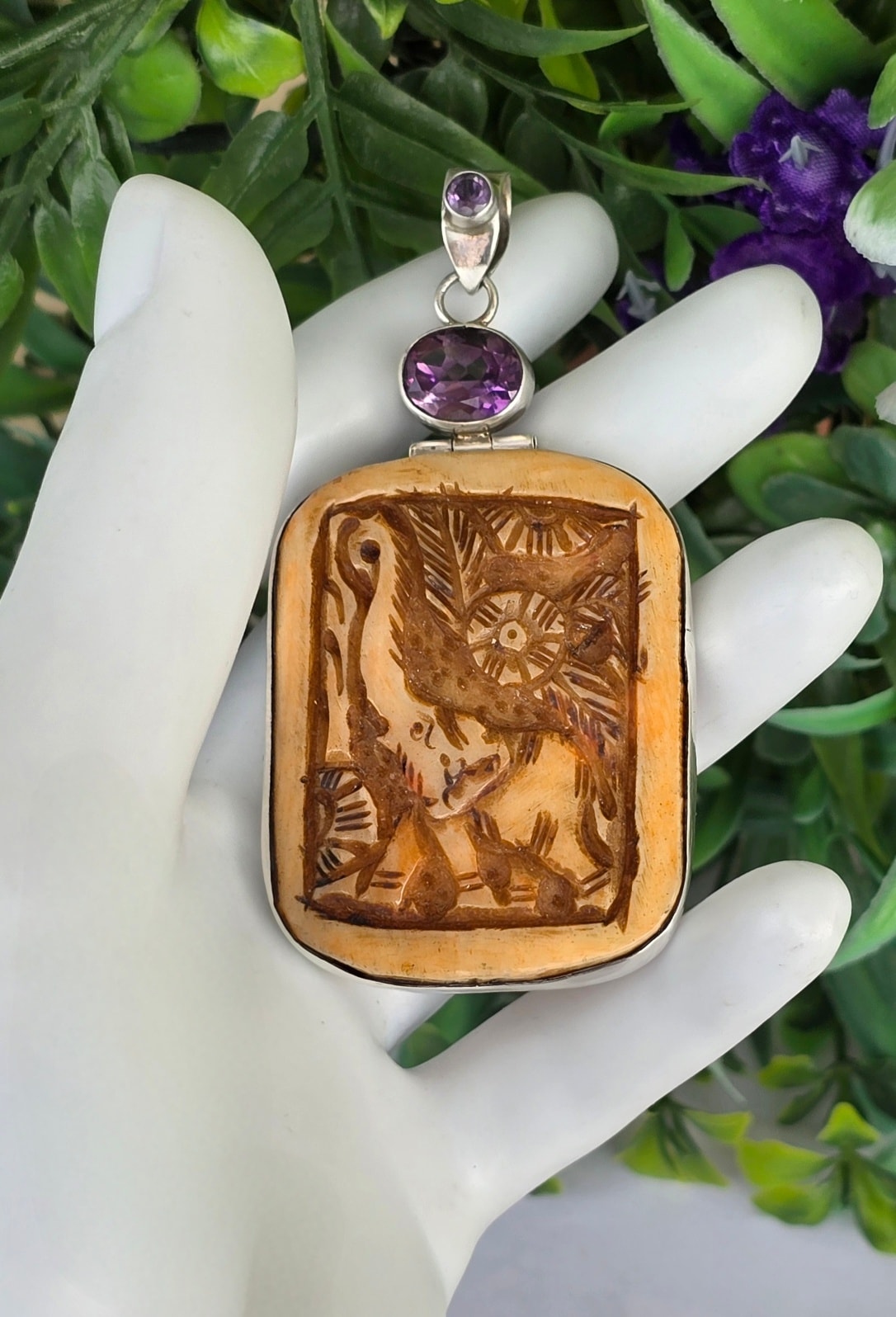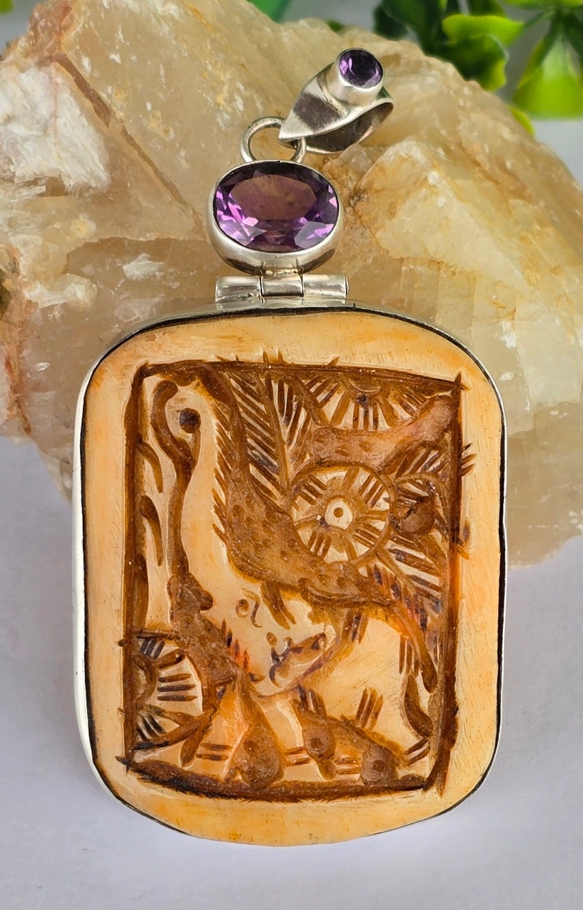 Pandantiv vechi spectaculos, din argint, cu o superbă sculptură în os și ametiste naturale.