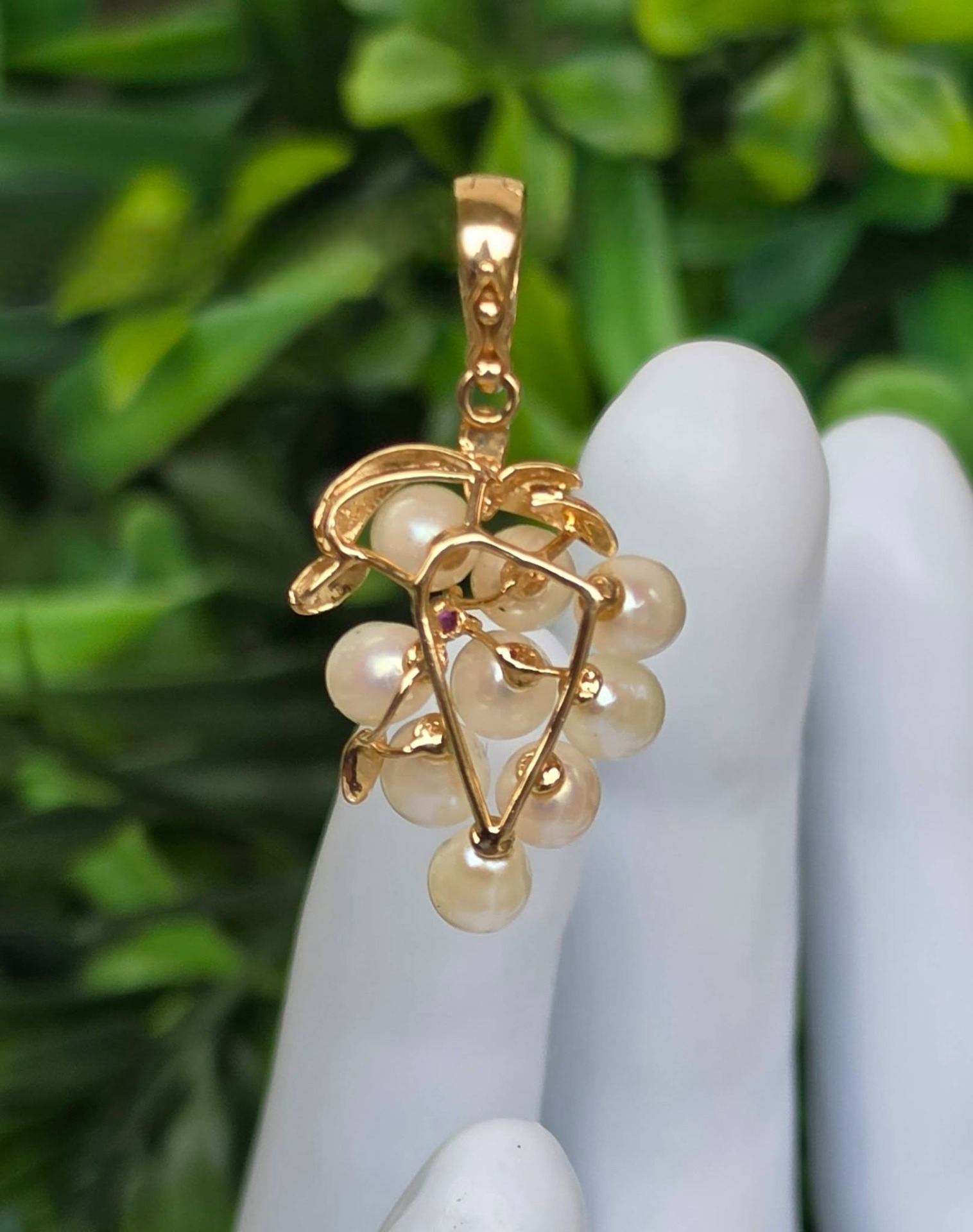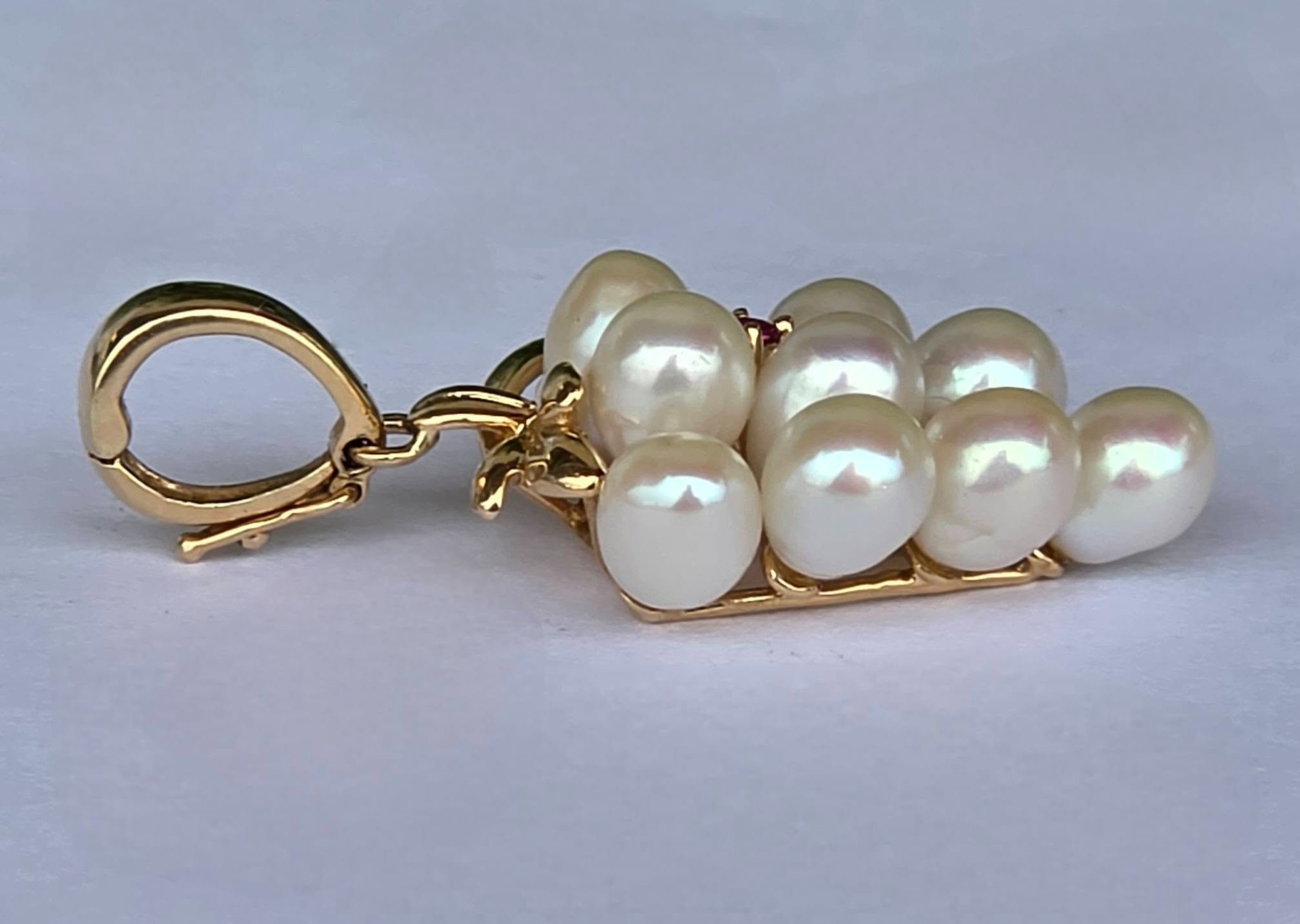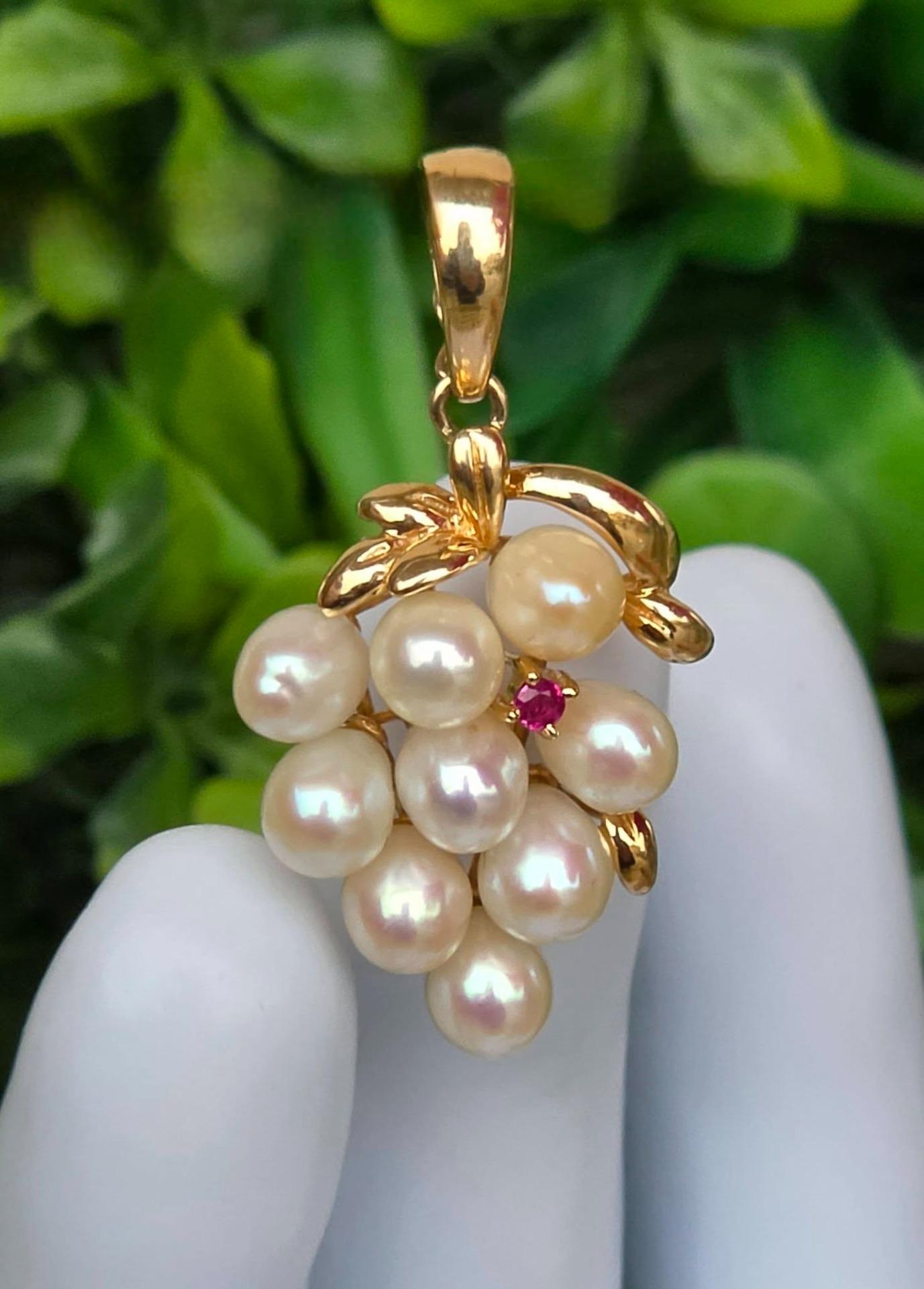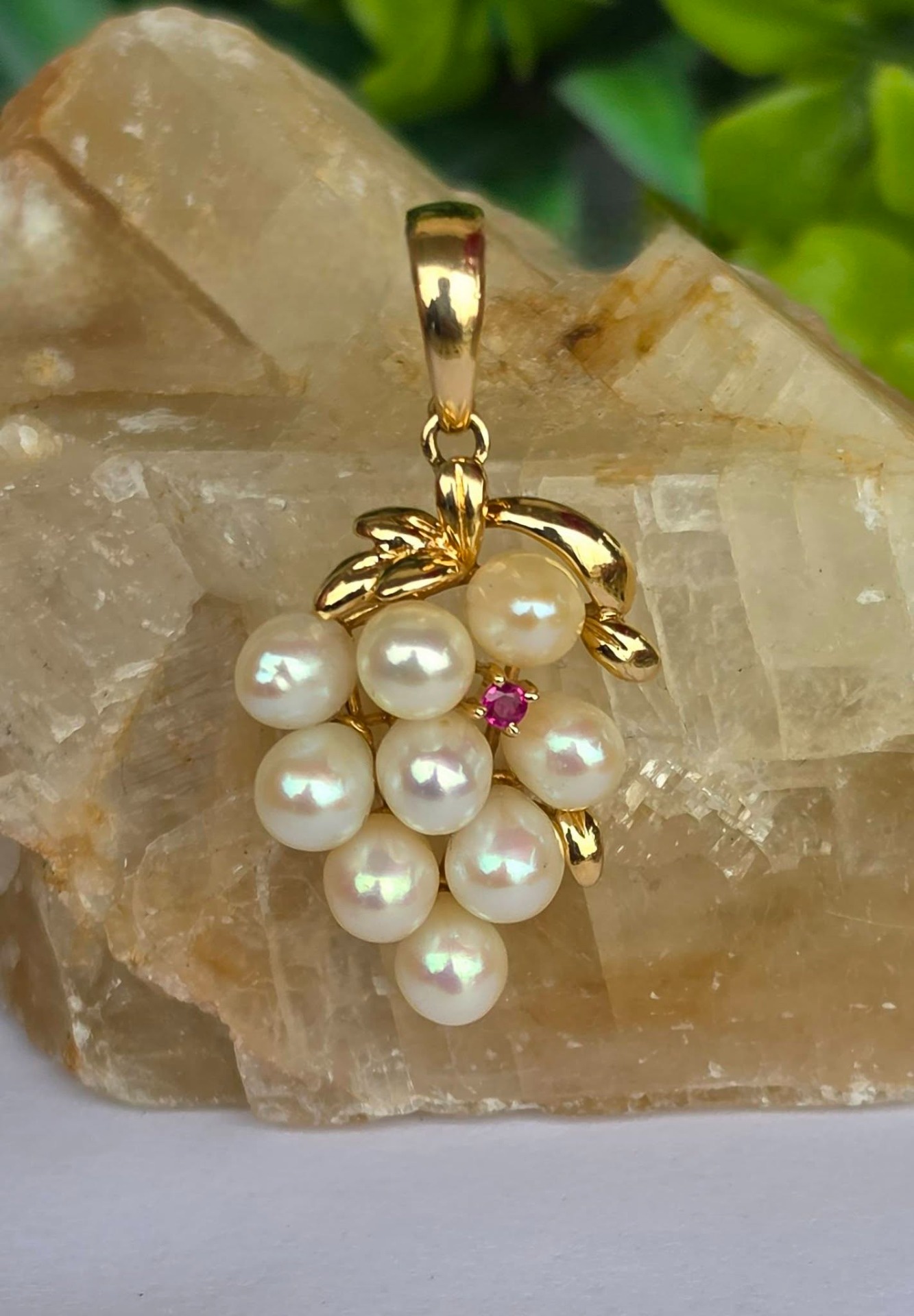 Pandantiv vechi superb, "cluster" (ciorchine), din aur de 14K, cu 9 perle naturale de cultură de calitate excelentă și rubin natural.