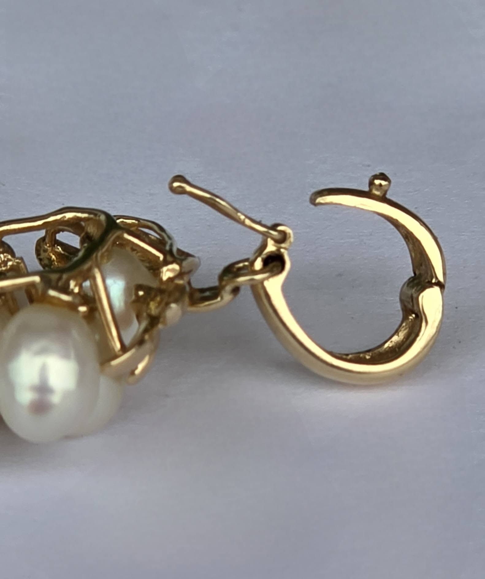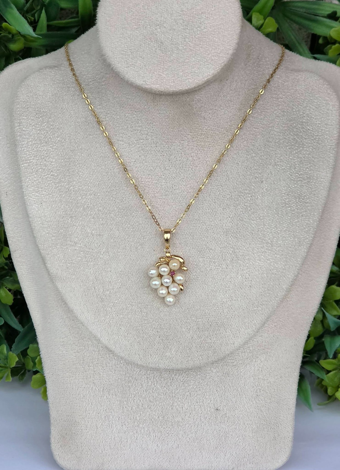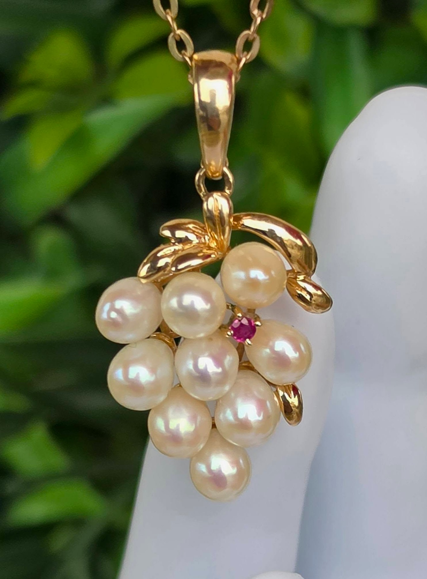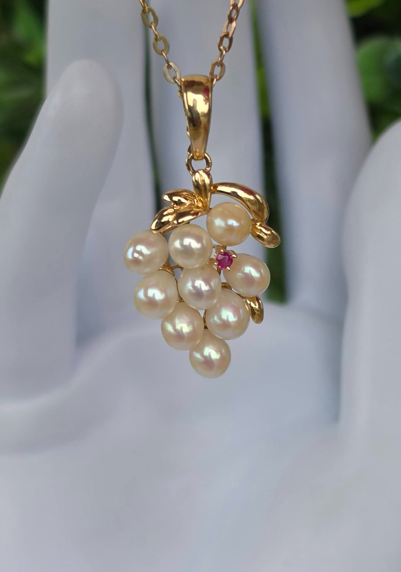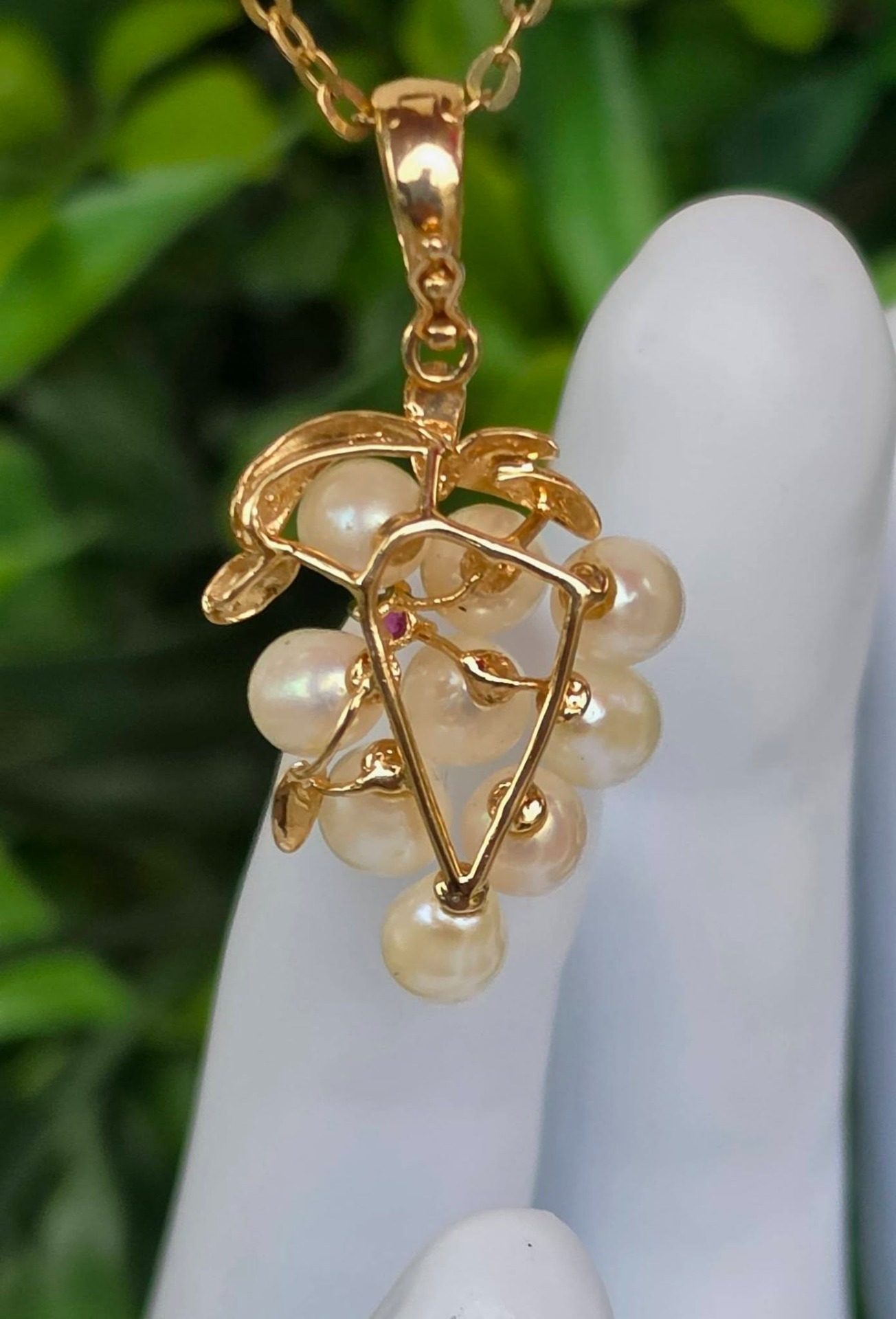 Pandantiv vechi superb, "cluster" (ciorchine), din aur de 14K, cu 9 perle naturale de cultură de calitate excelentă și rubin natural.