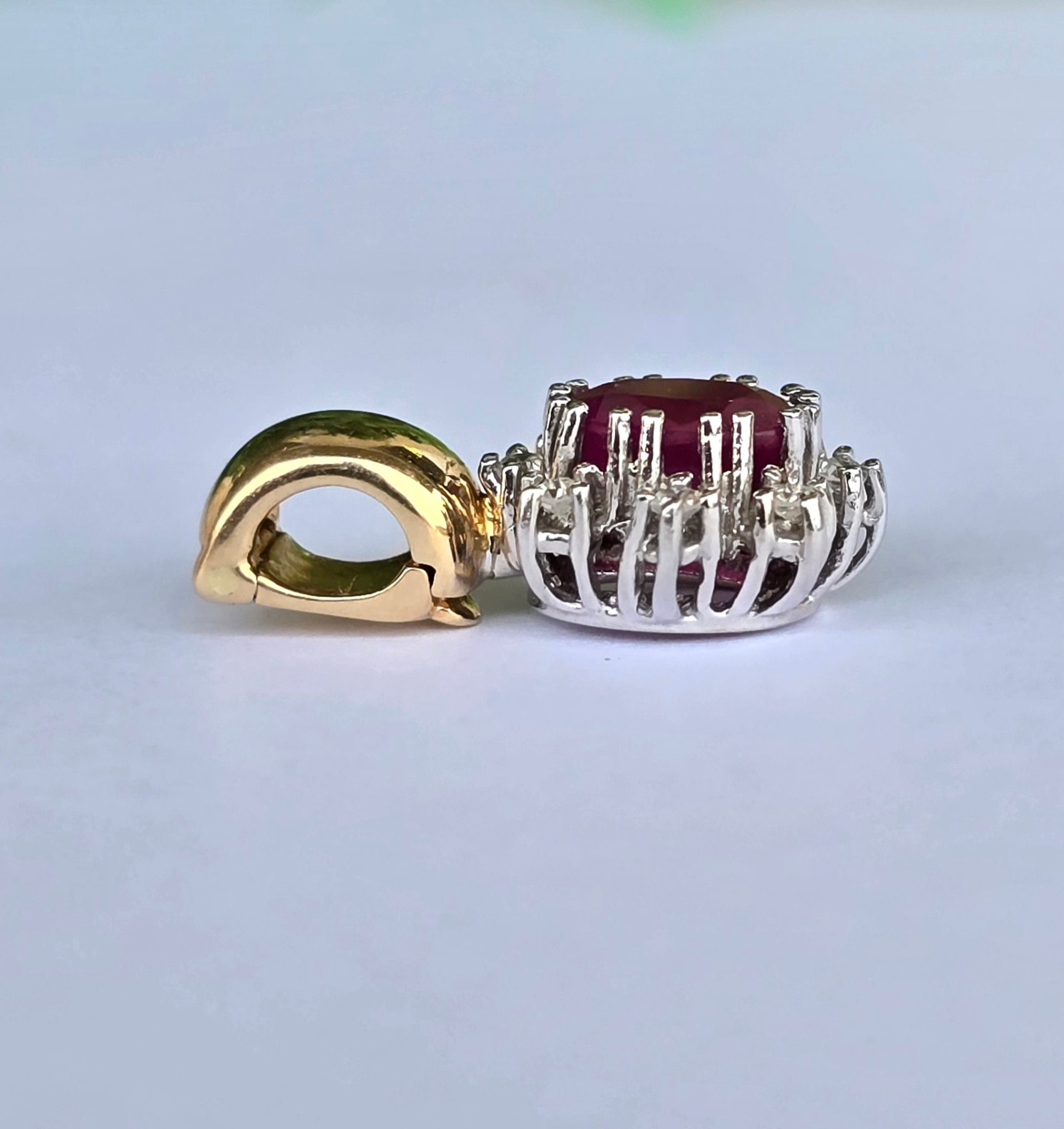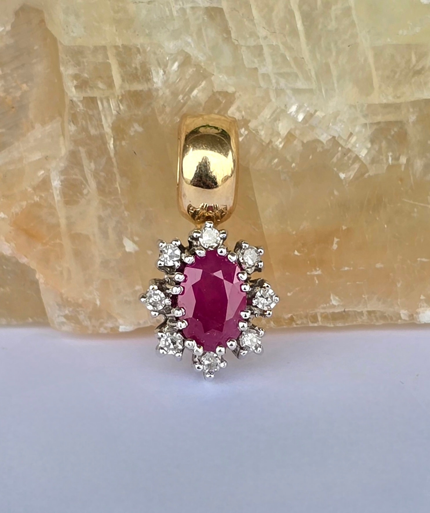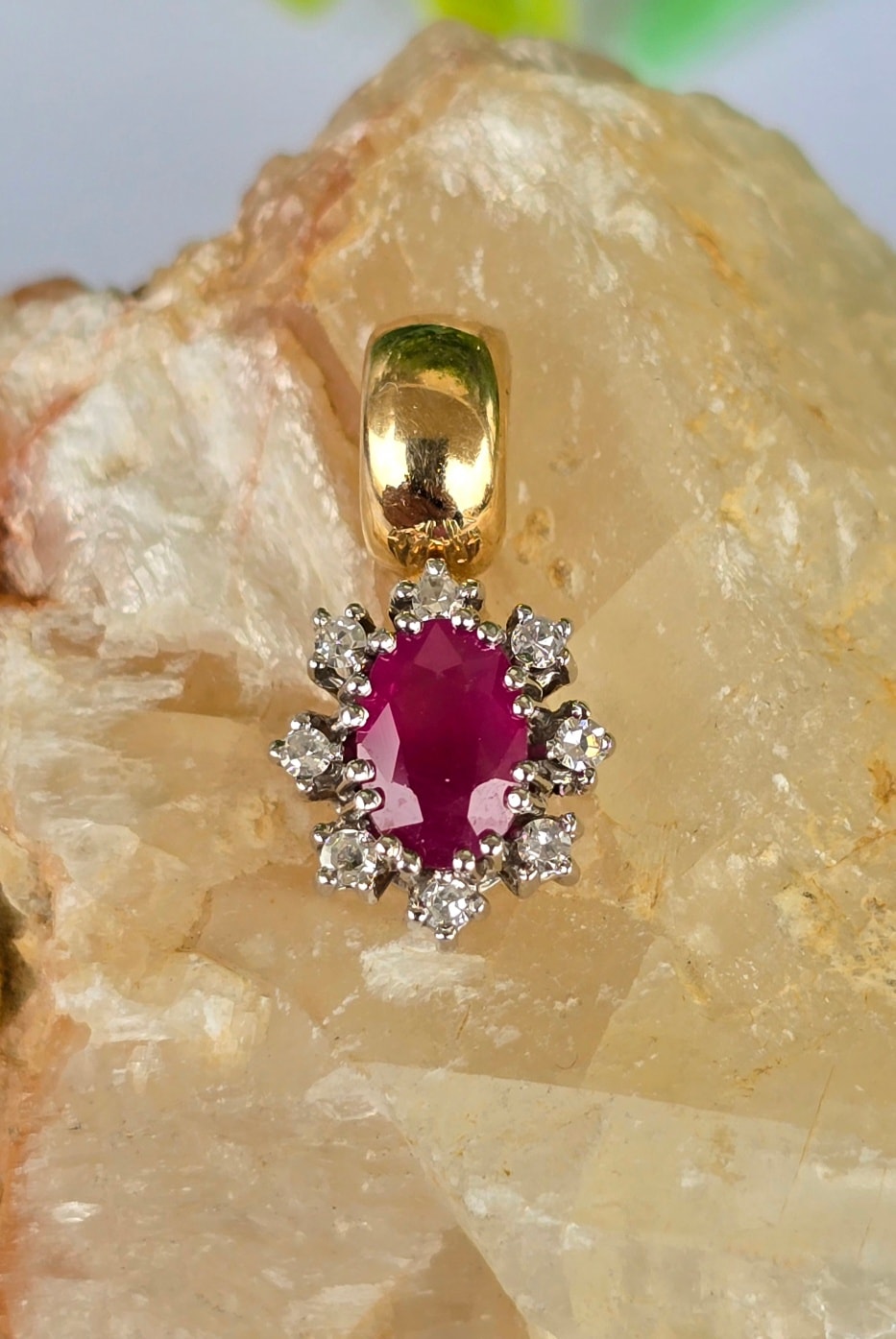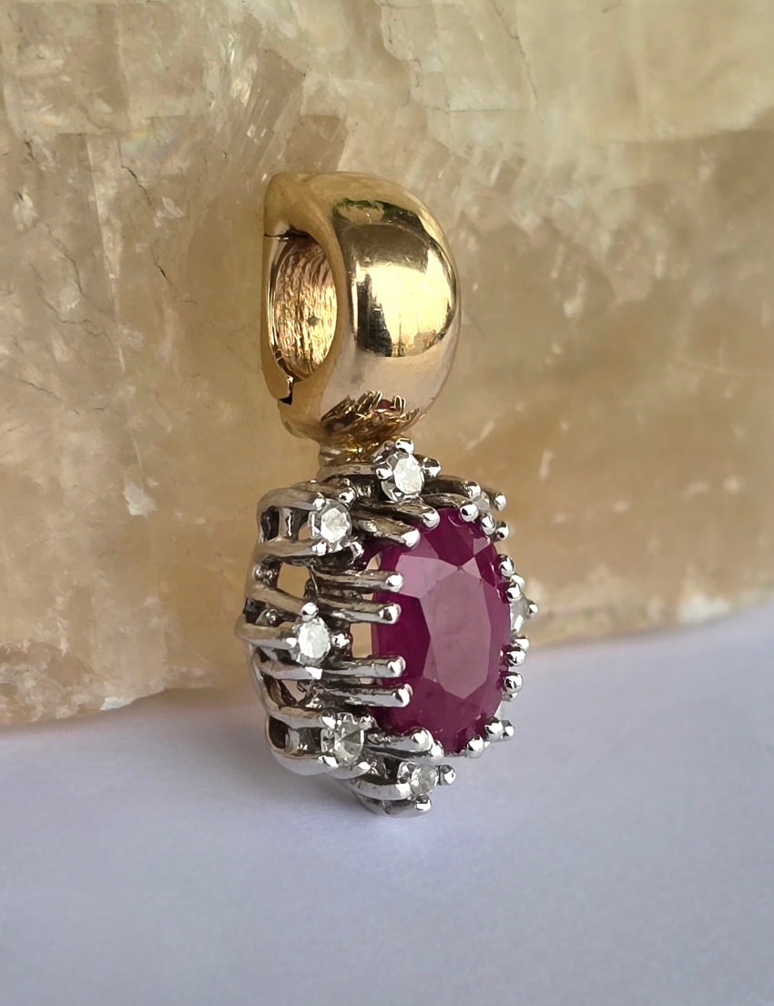 Pandantiv vechi superb, din aur de 14K, cu rubin și 8 diamante naturale.
