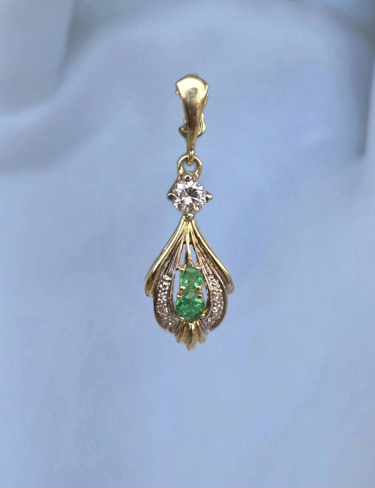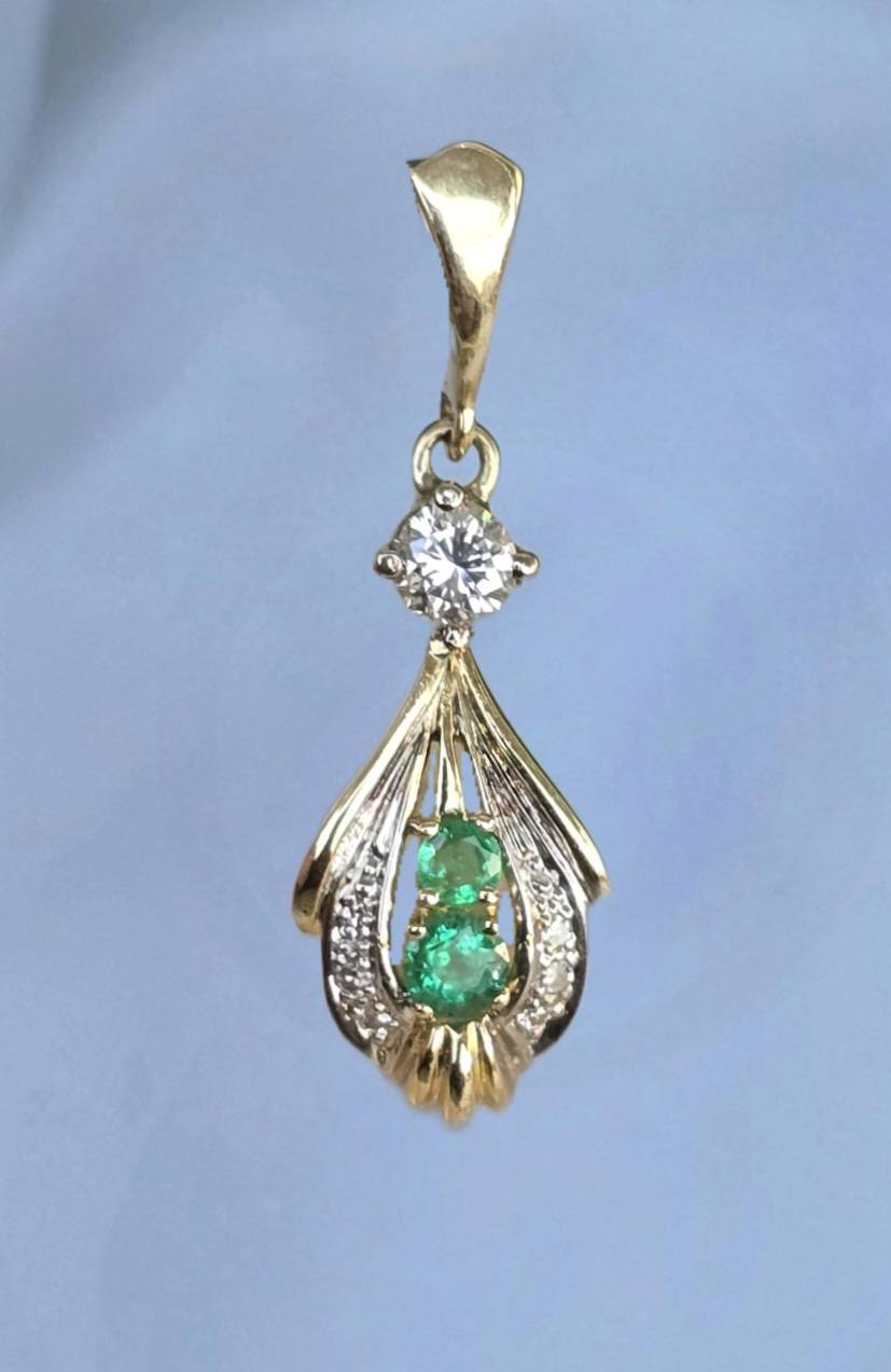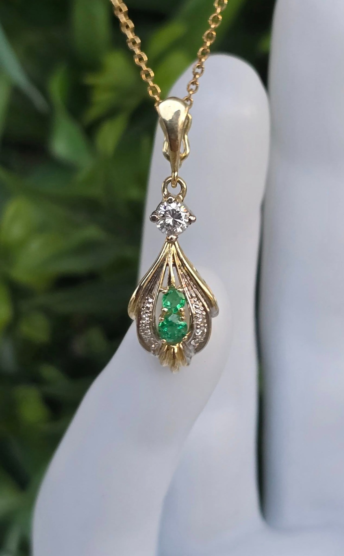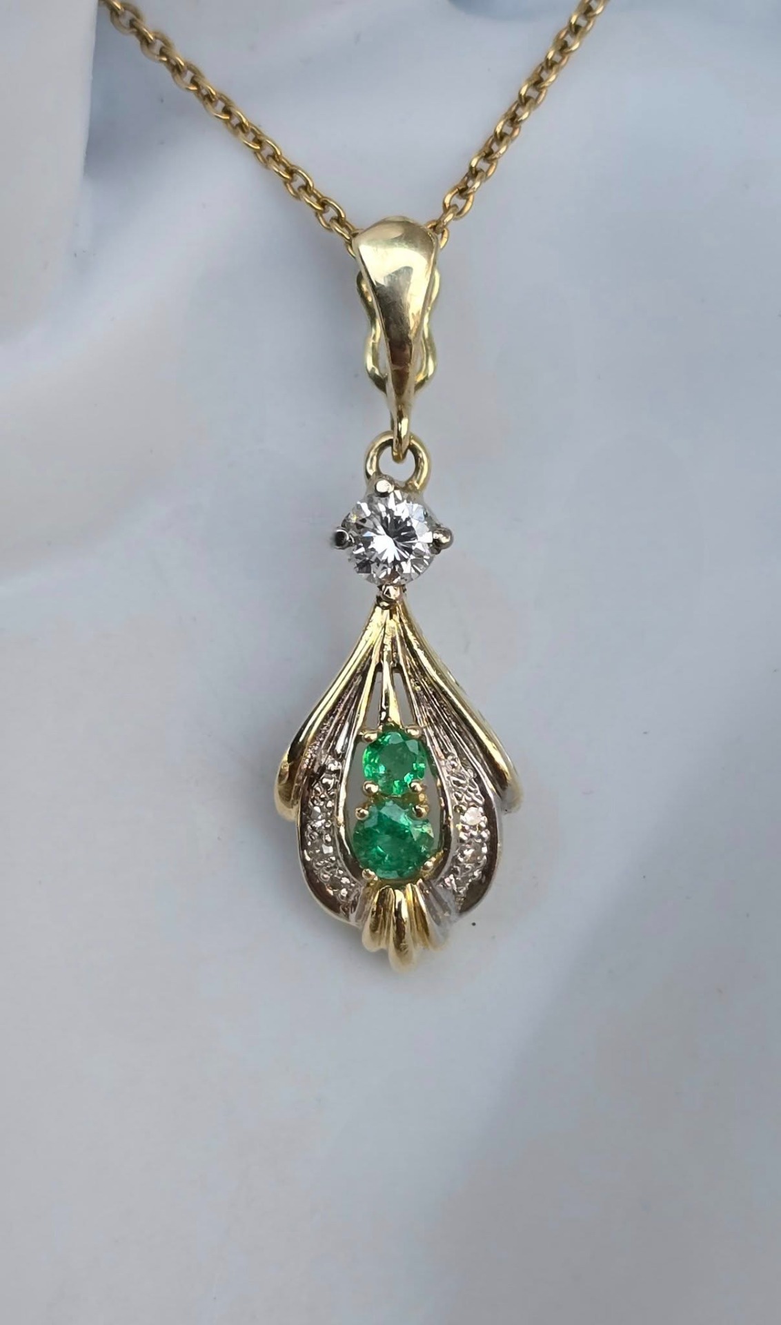Pandantiv vechi superb, din aur de 14K, cu un strălucitor diamant natural (0.2ct) și 2 smaralde naturale deosebite anturate cu alte 7 diamante.