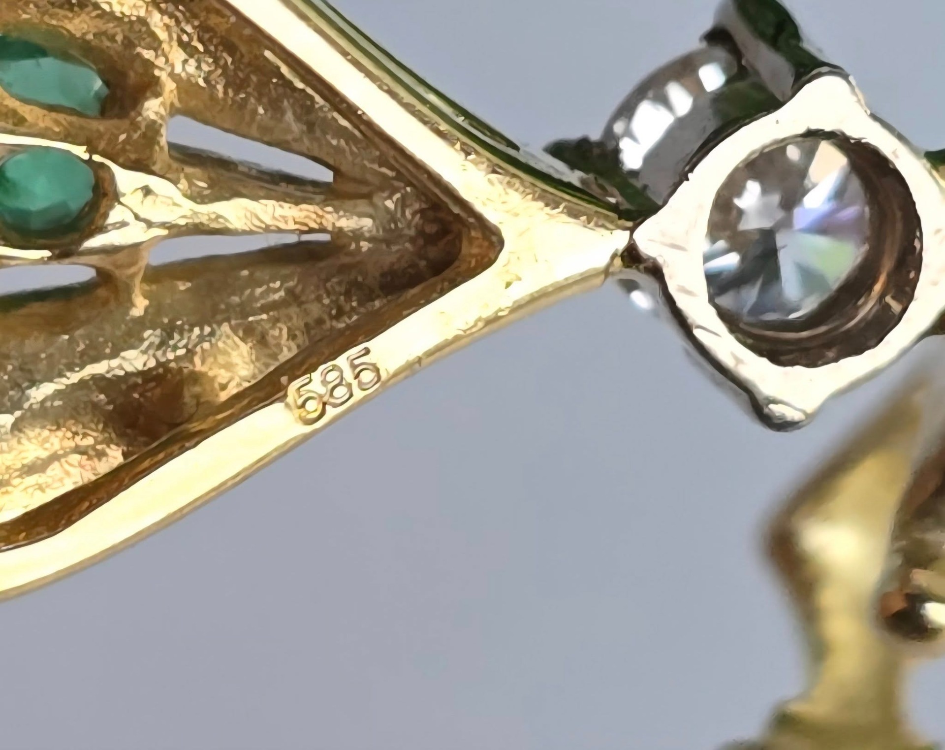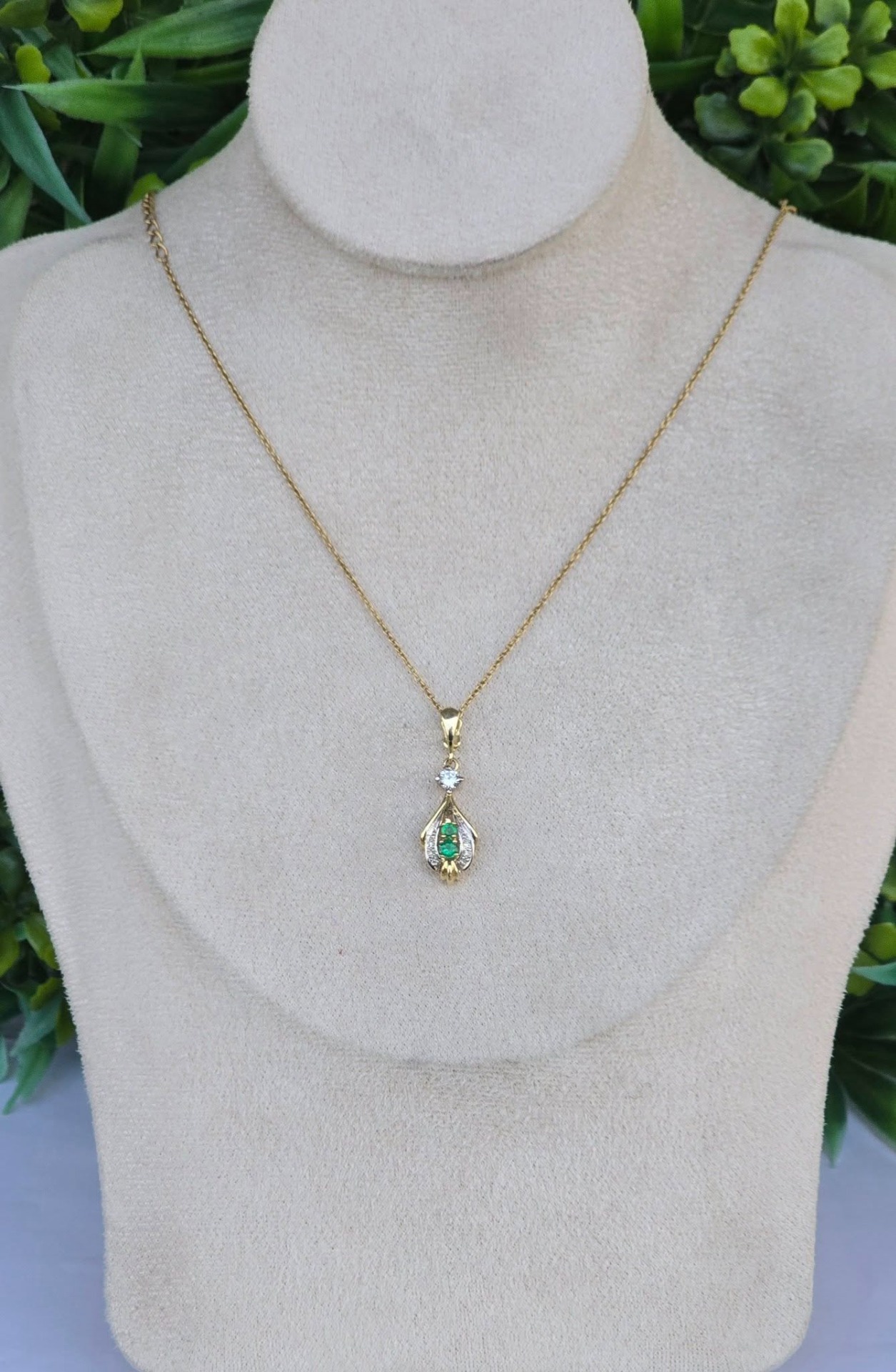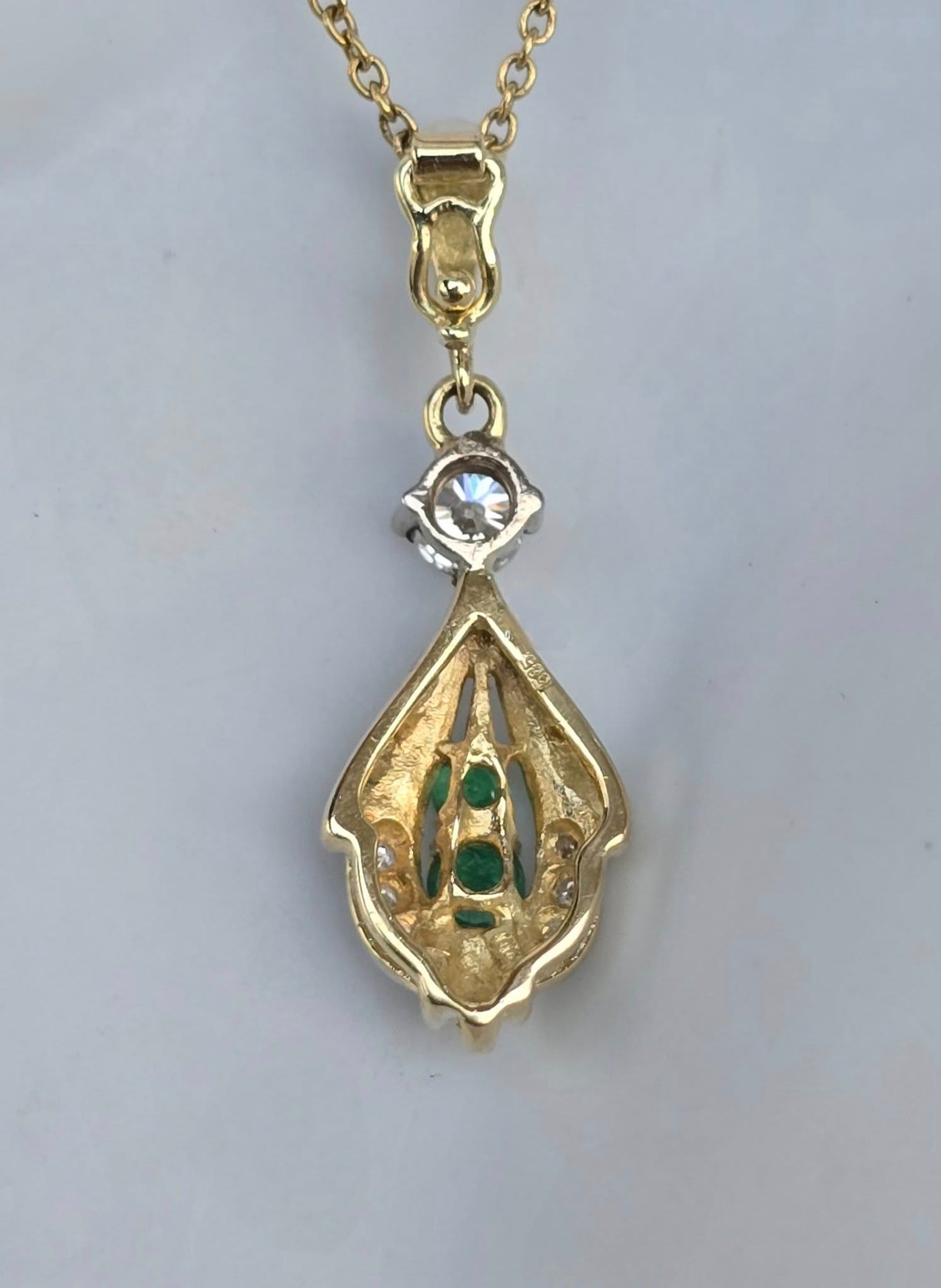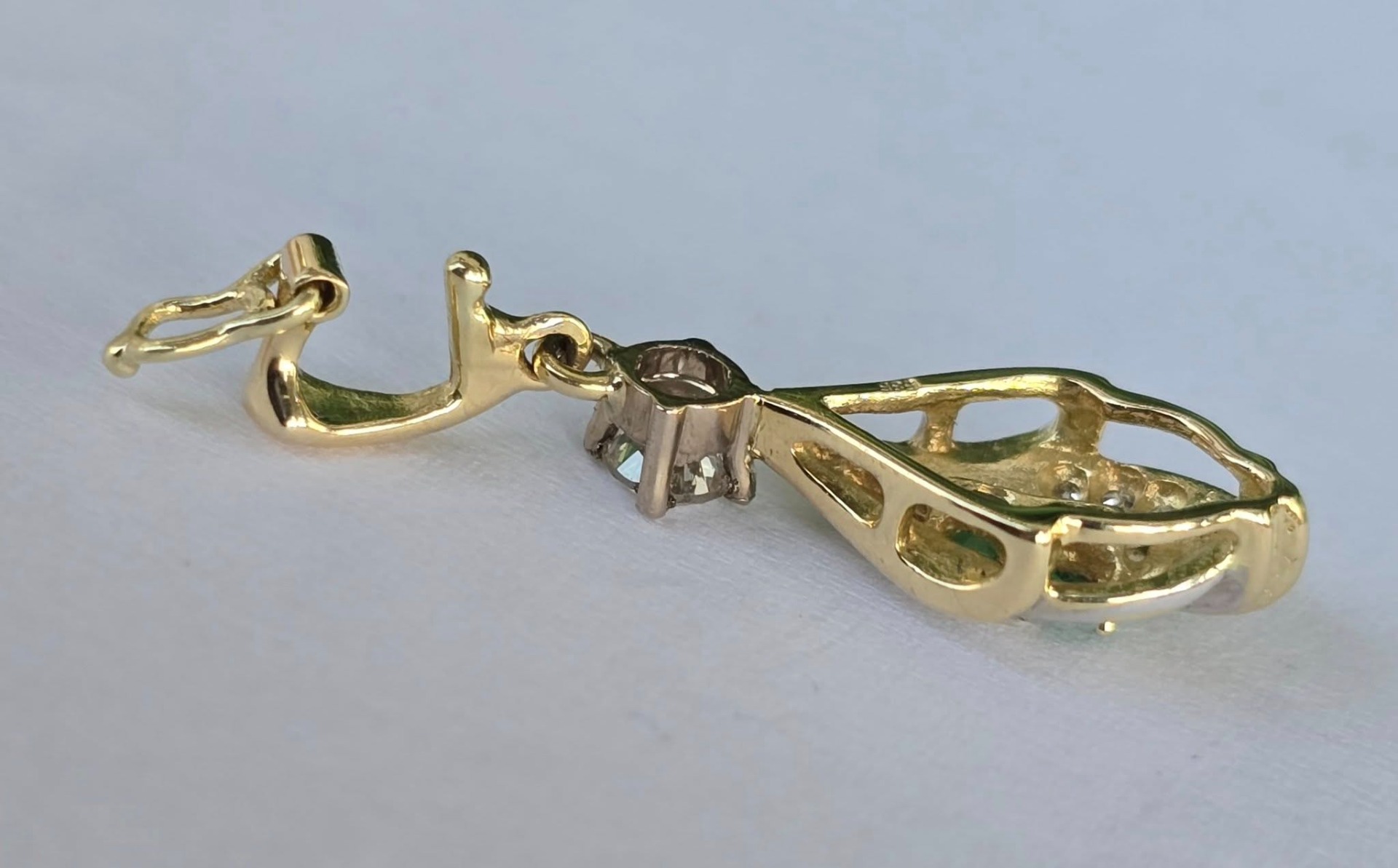 Pandantiv vechi superb, din aur de 14K, cu un strălucitor diamant natural (0.2ct) și 2 smaralde naturale deosebite anturate cu alte 7 diamante.