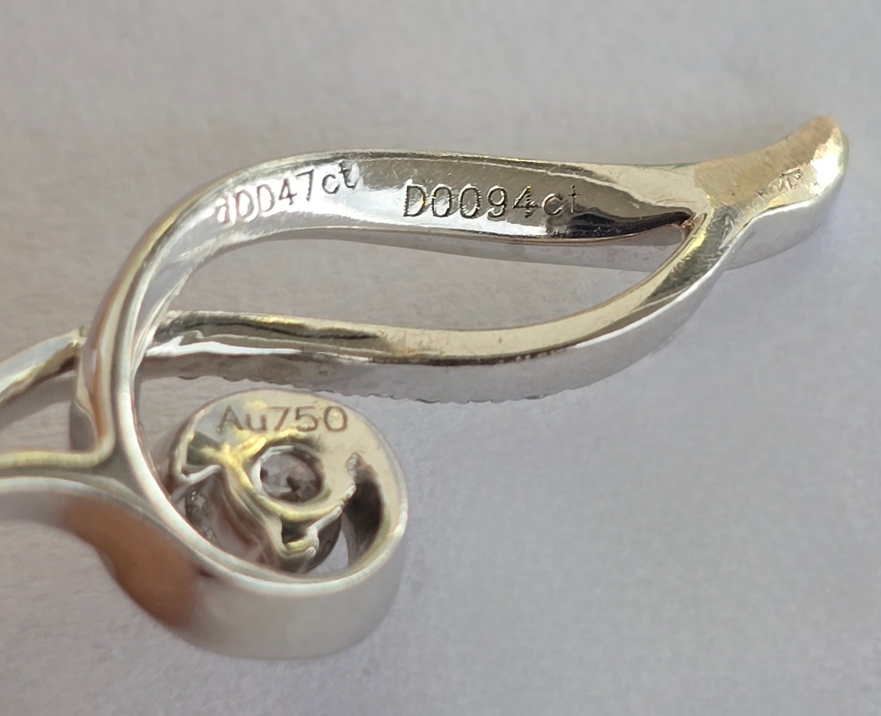 Prezintă marcaj 750 pentru puritate aur de 18K, marcaj "D0.094ct" pentru caratajul diamantului central și marcaj "d0.047ct" pentru caratajul diamantelor mici.