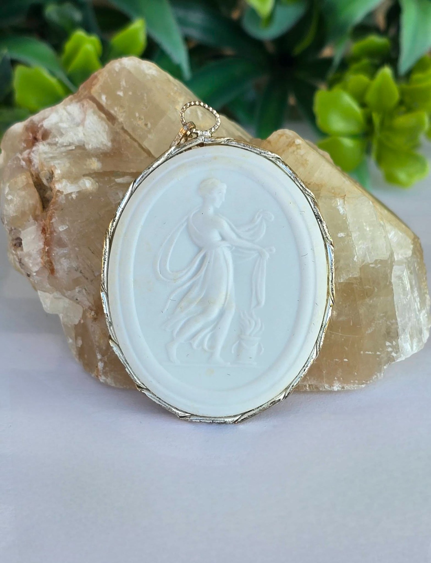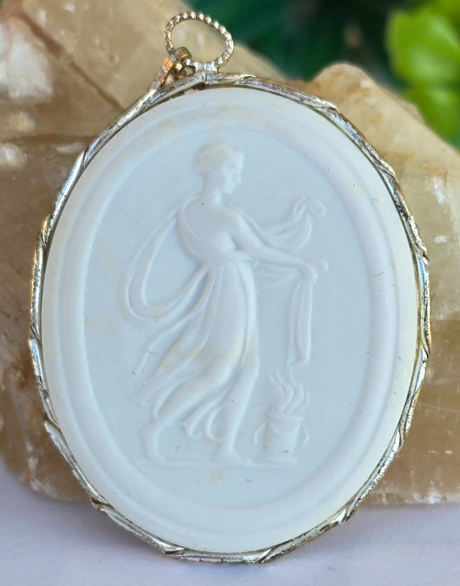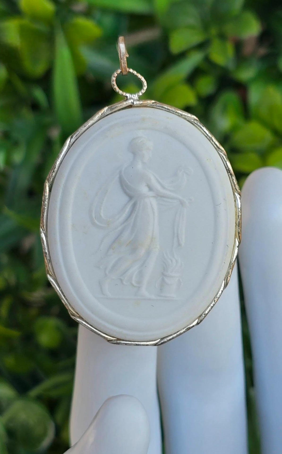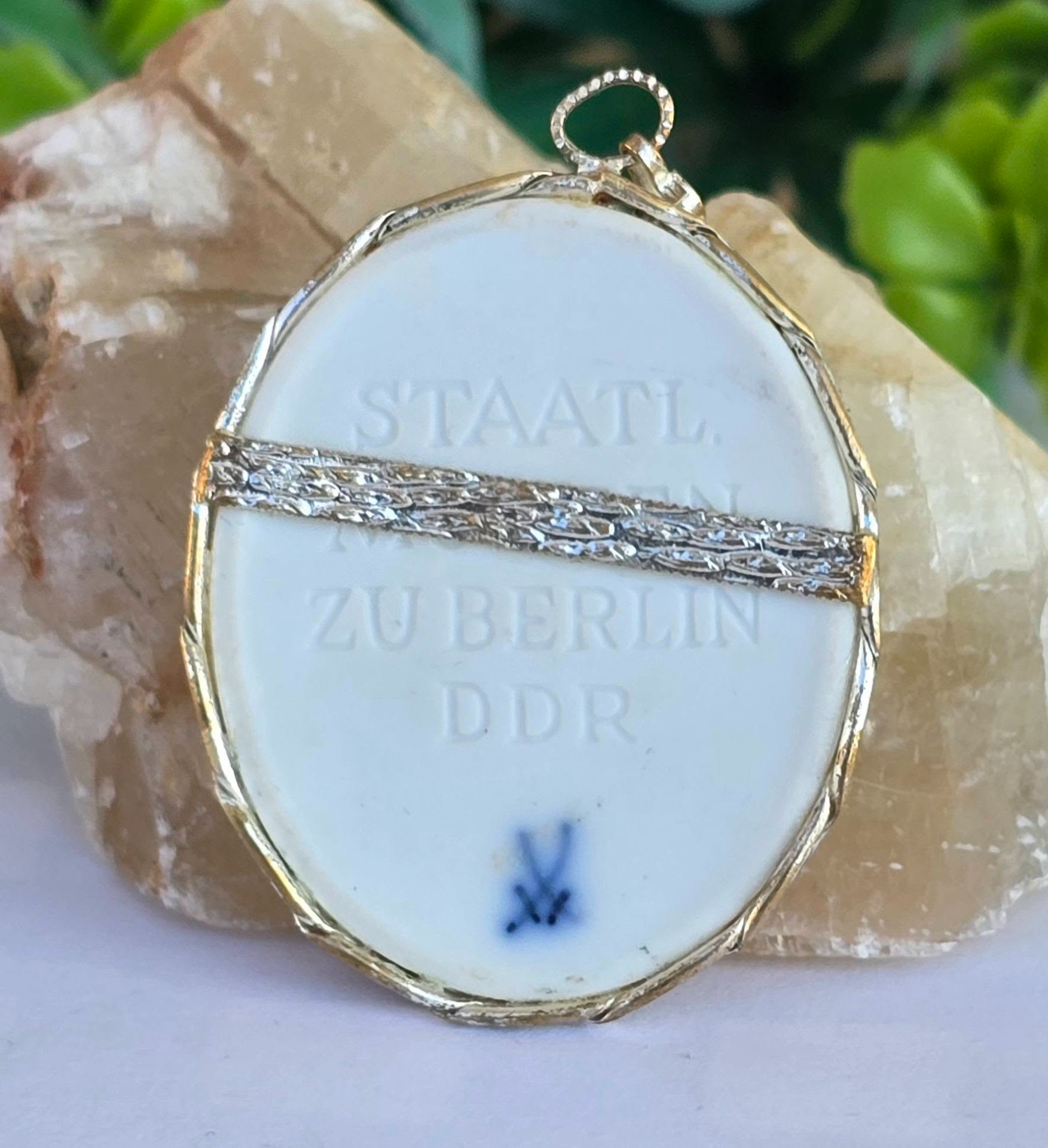 Pandantiv vintage de colecție, din porțelan Meissen în montură din metal argintat, realizat pentru "STAATL MUSEEN ZU BERLIN DDR" (Muzeele de Stat din Berlin, Republica Democrată Germania), lucrat manual în basorelief pe porțelan neglazurat ("biscuit porcelain"), ceea ce îi oferă un aspect mat de tipul marmurei.