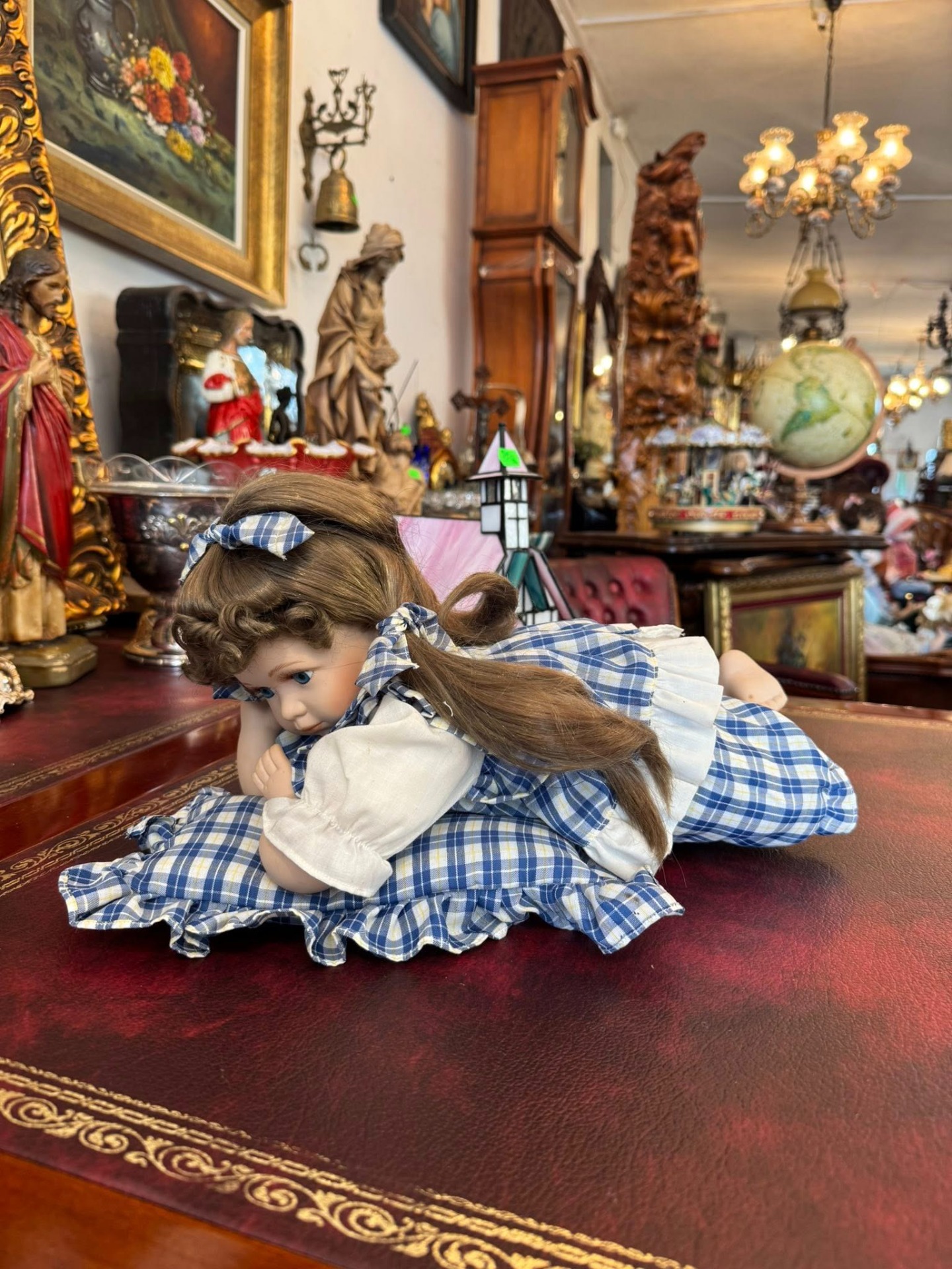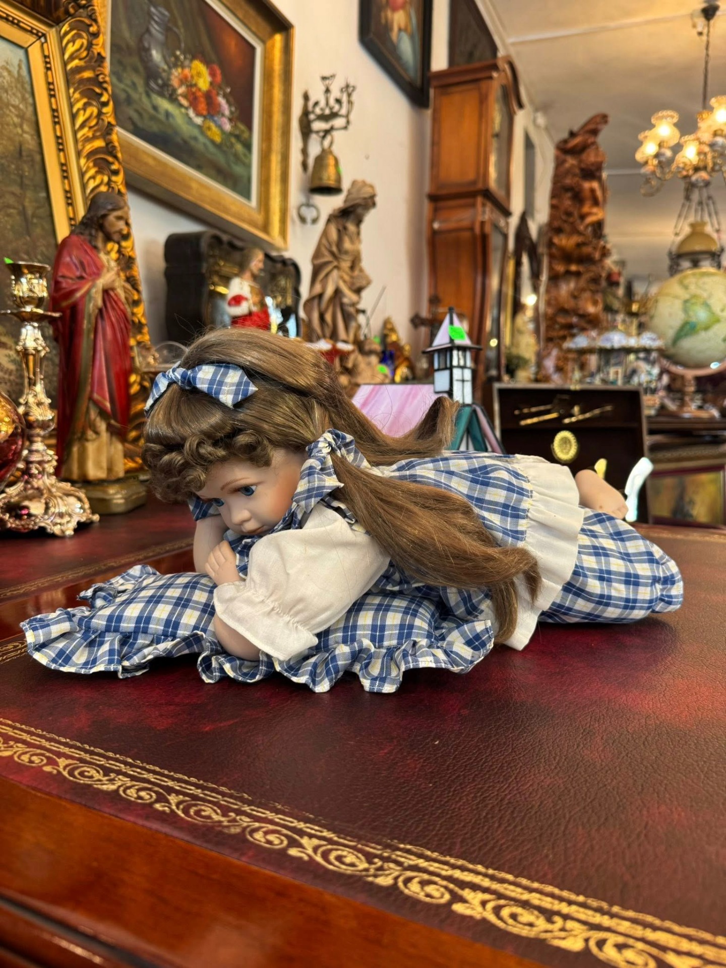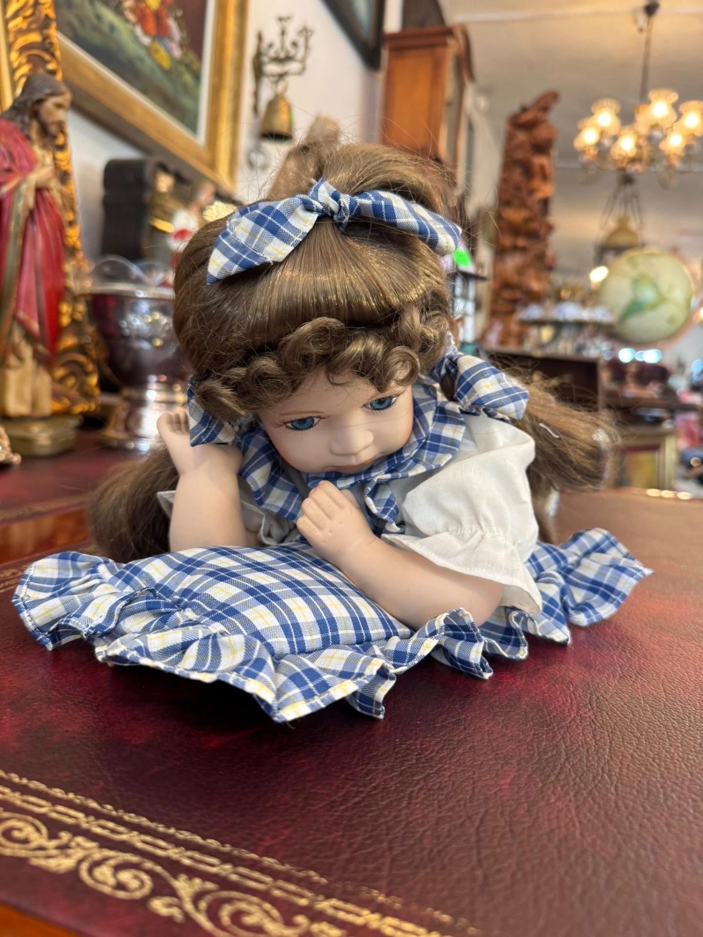 Păpușă de colecție din porțelan cu perinuță, surprinsă intr-o poziție visătoare. Stilul este unul rustic-șic, amintind de personajul Dorothy din „Vrăjitorul din Oz” sau de moda pastorală.