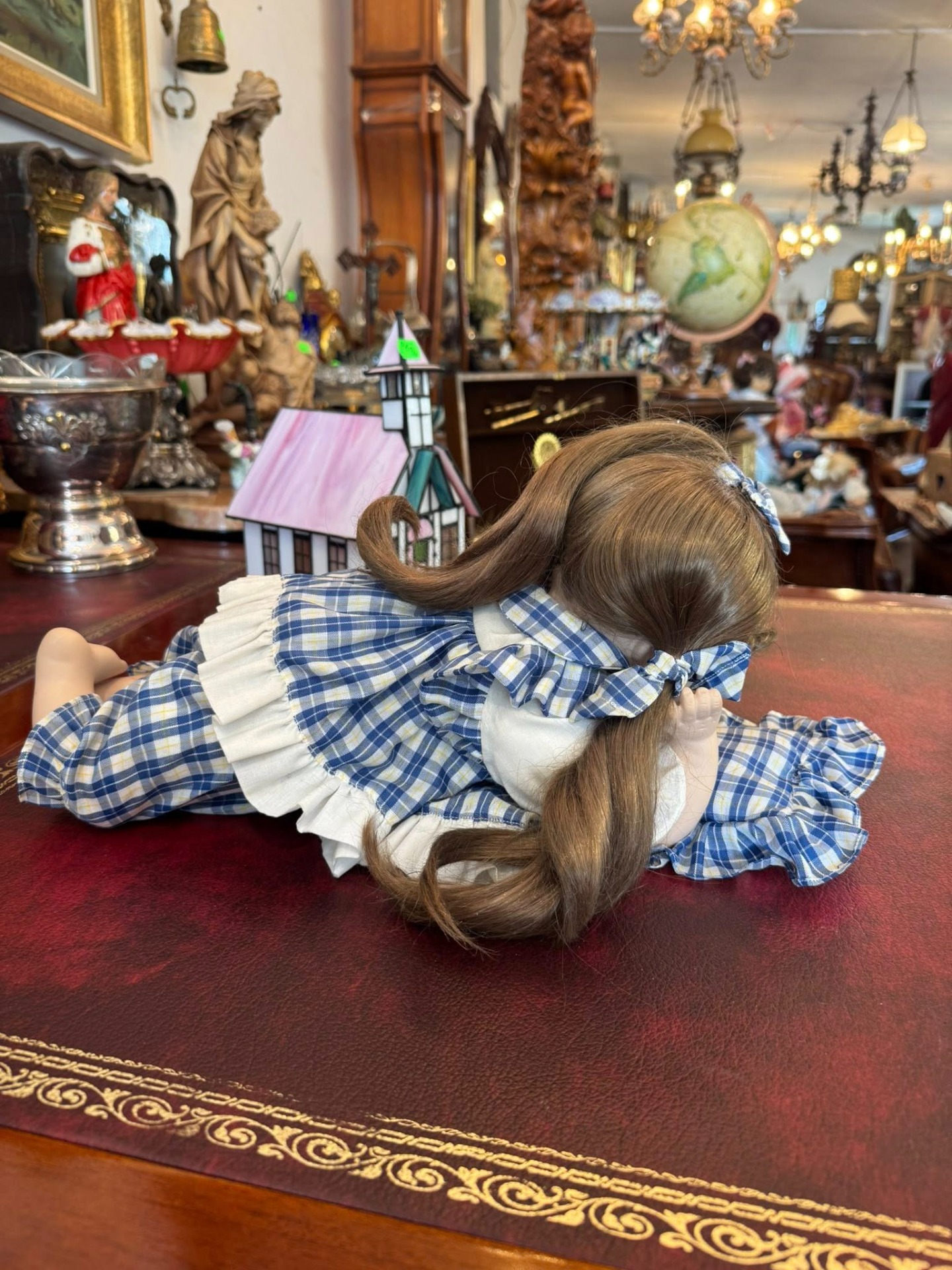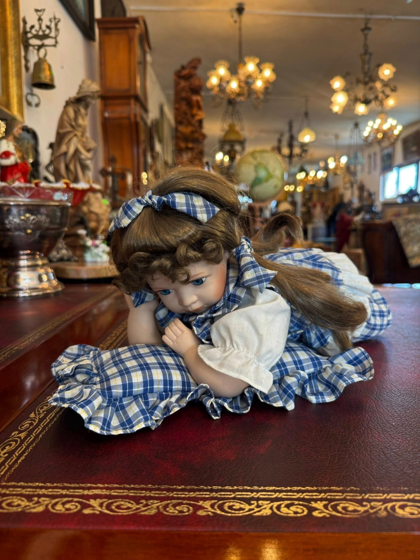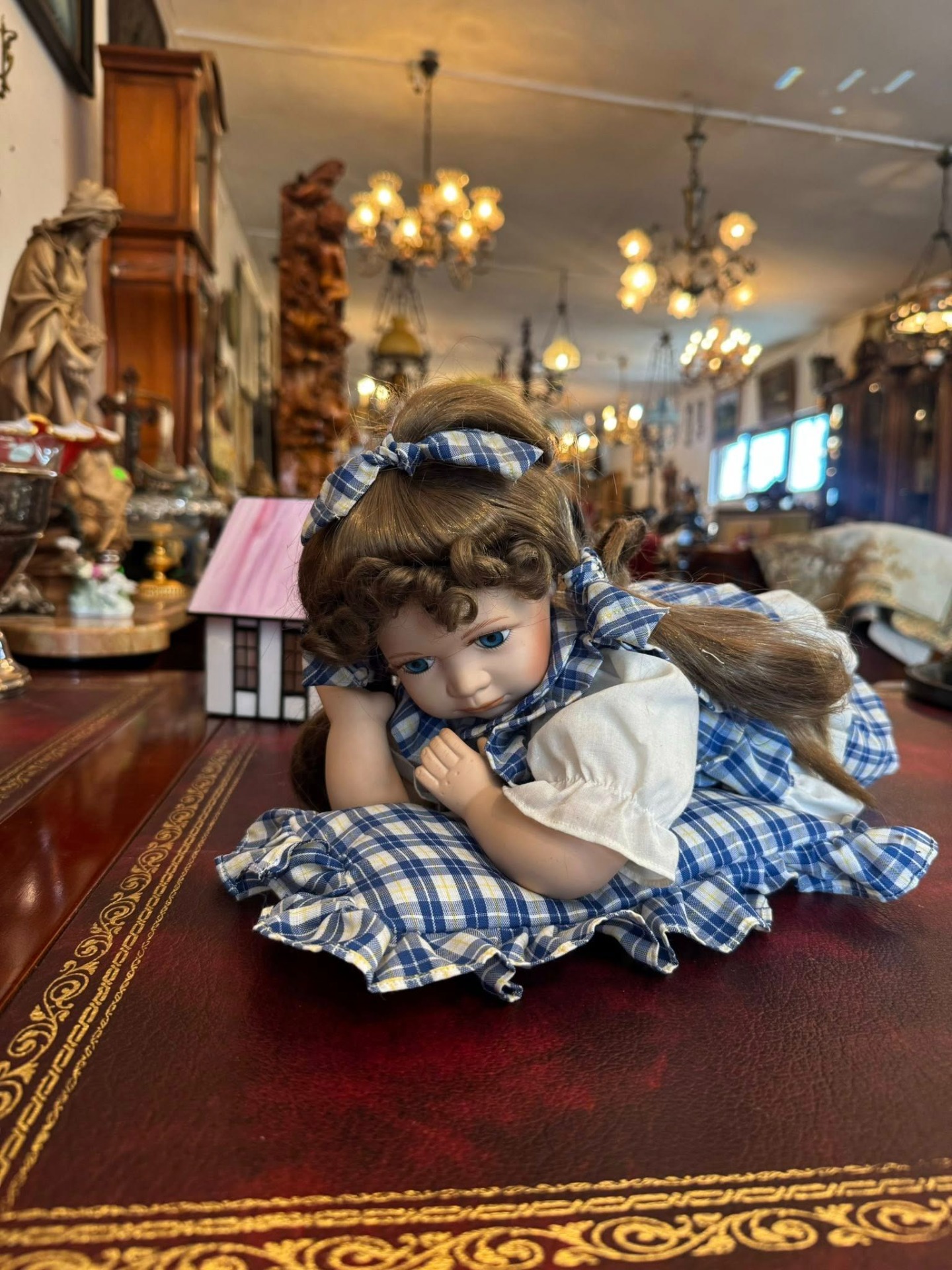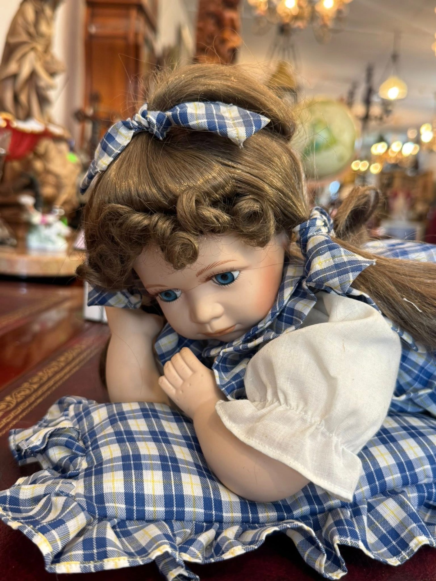 Păpușă de colecție din porțelan cu perinuță, surprinsă intr-o poziție visătoare. Stilul este unul rustic-șic, amintind de personajul Dorothy din „Vrăjitorul din Oz” sau de moda pastorală.