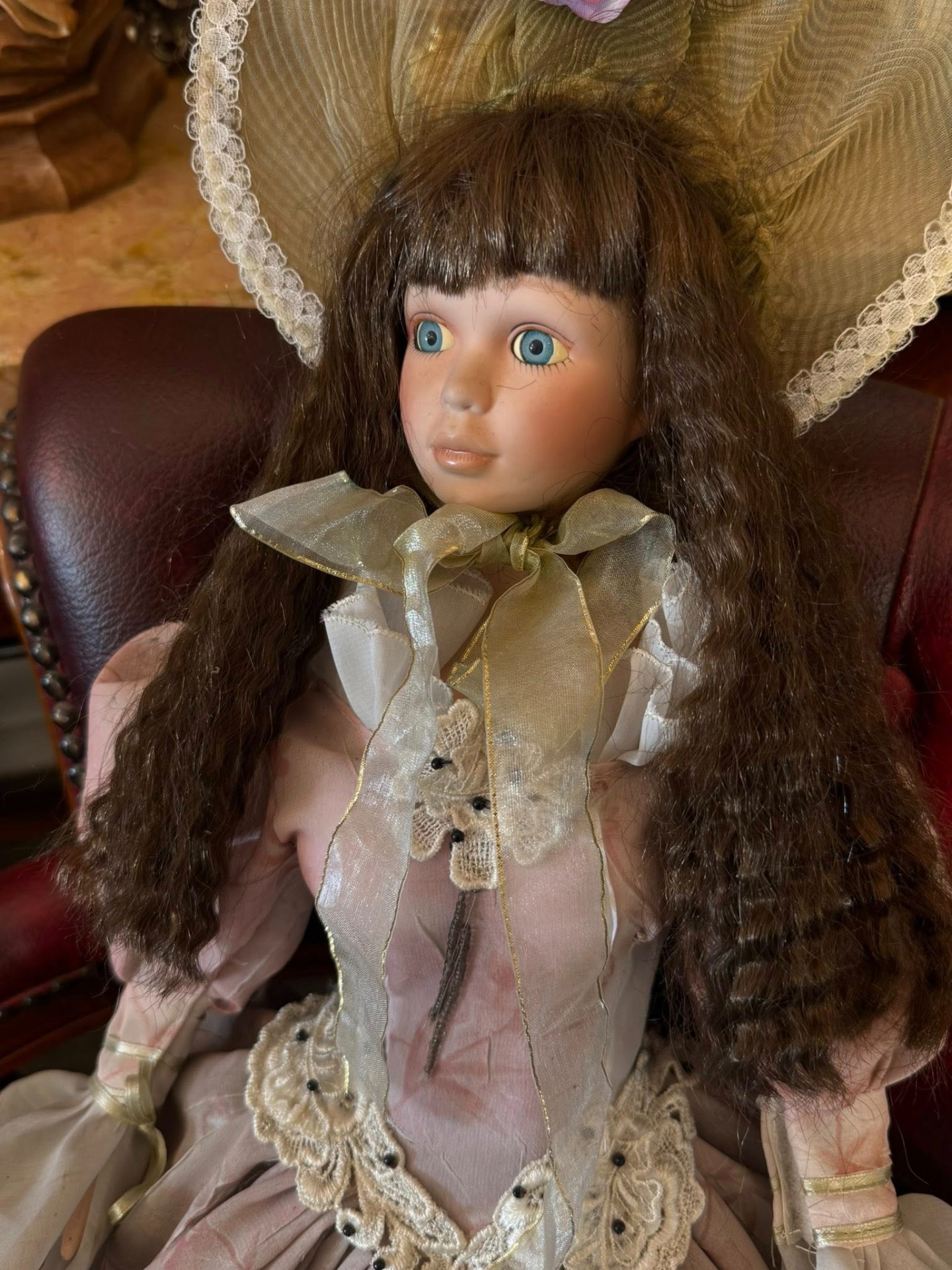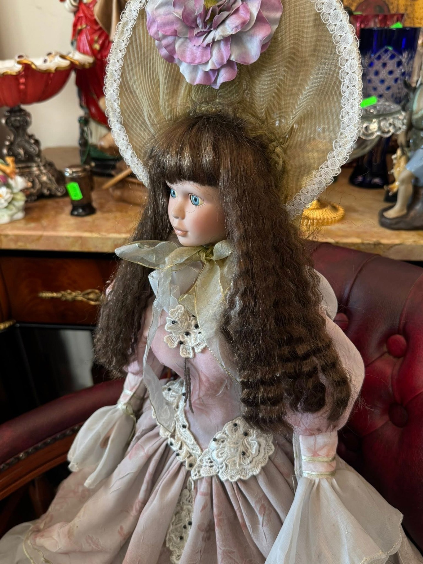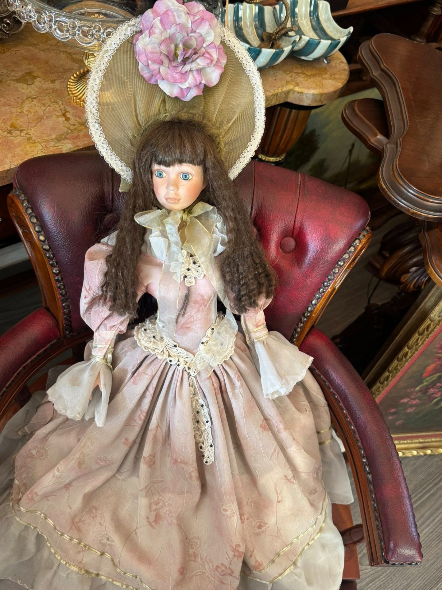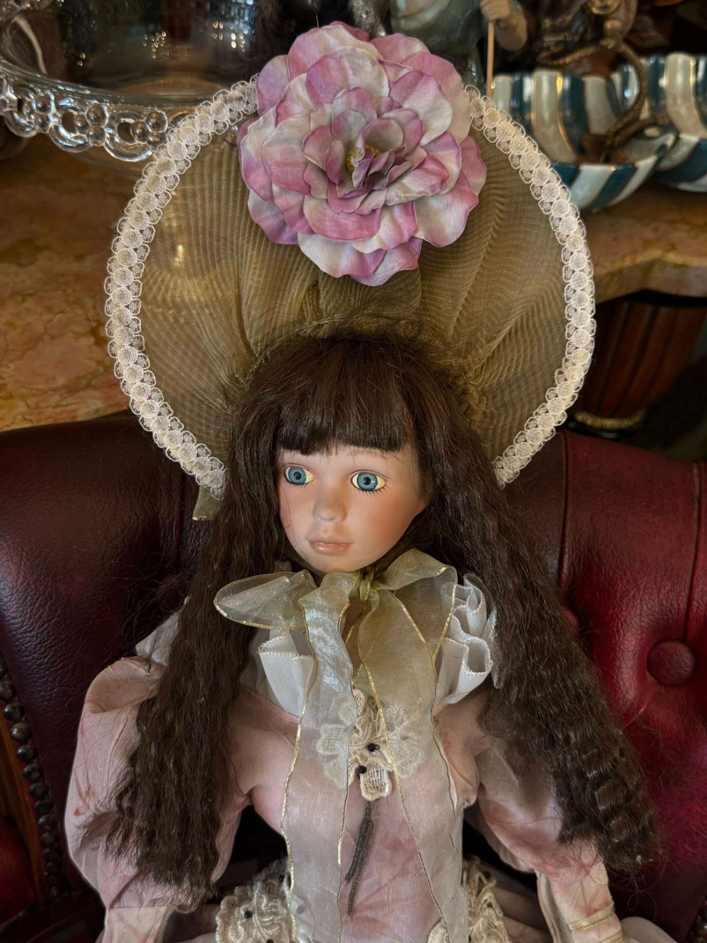 Păpușă de colecție din porțelan, realizată într-un stil victorian, de epocă, ce emană o eleganță nostalgică. Este o piesă elaborată, cu multiple straturi, realizată din materiale precum satin, organza și dantelă. Culoarea este un roz prăfuit (dusty rose) cu motive florale discrete.