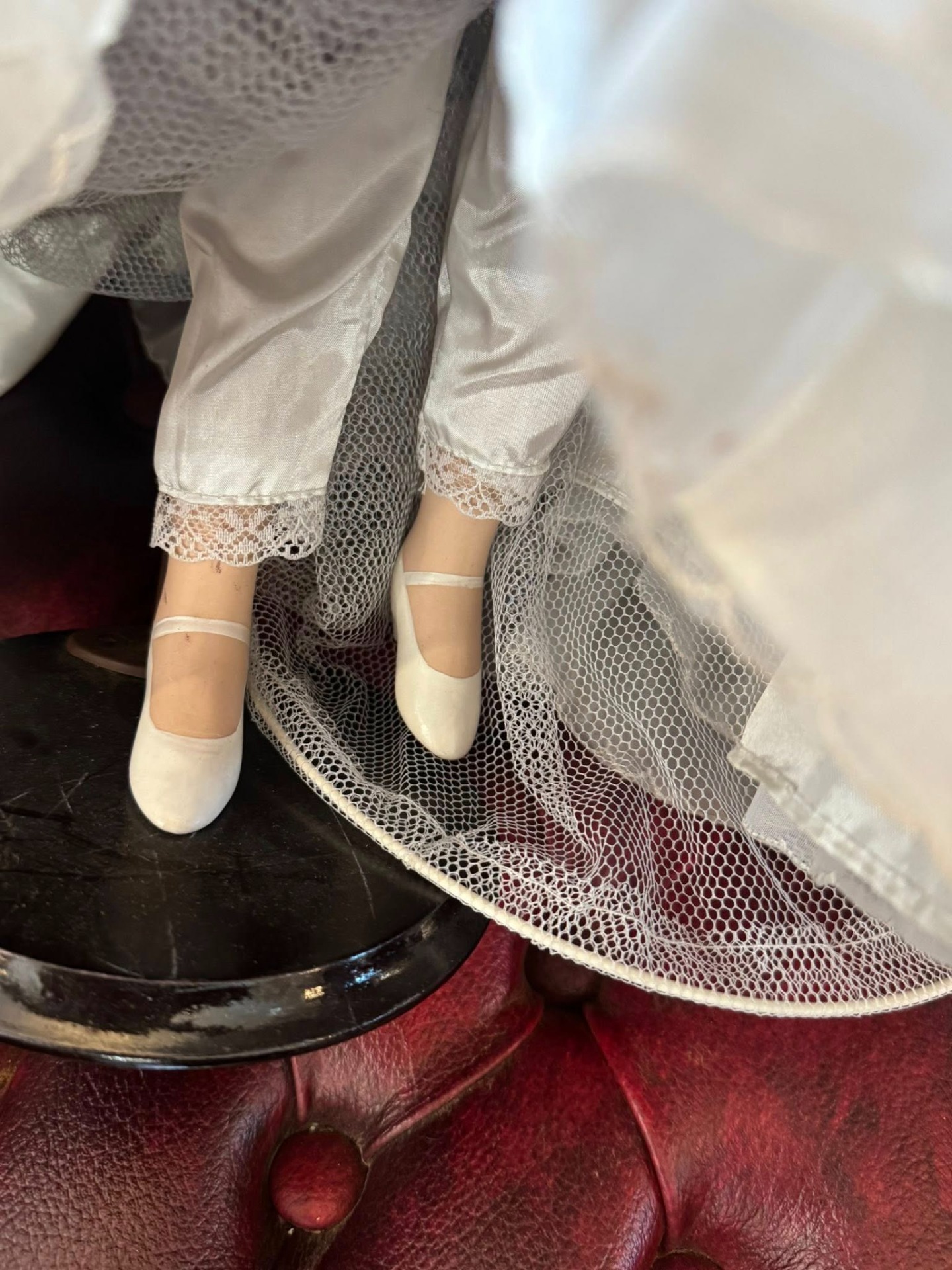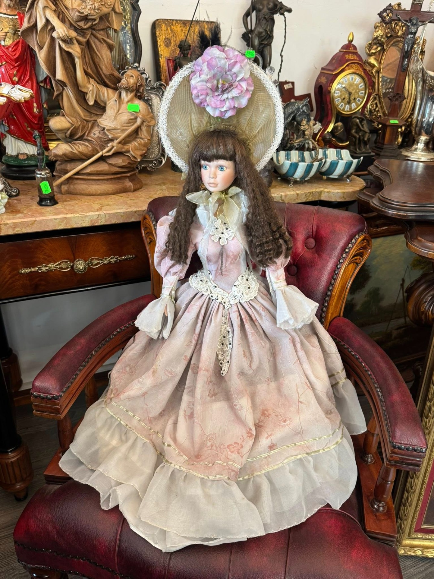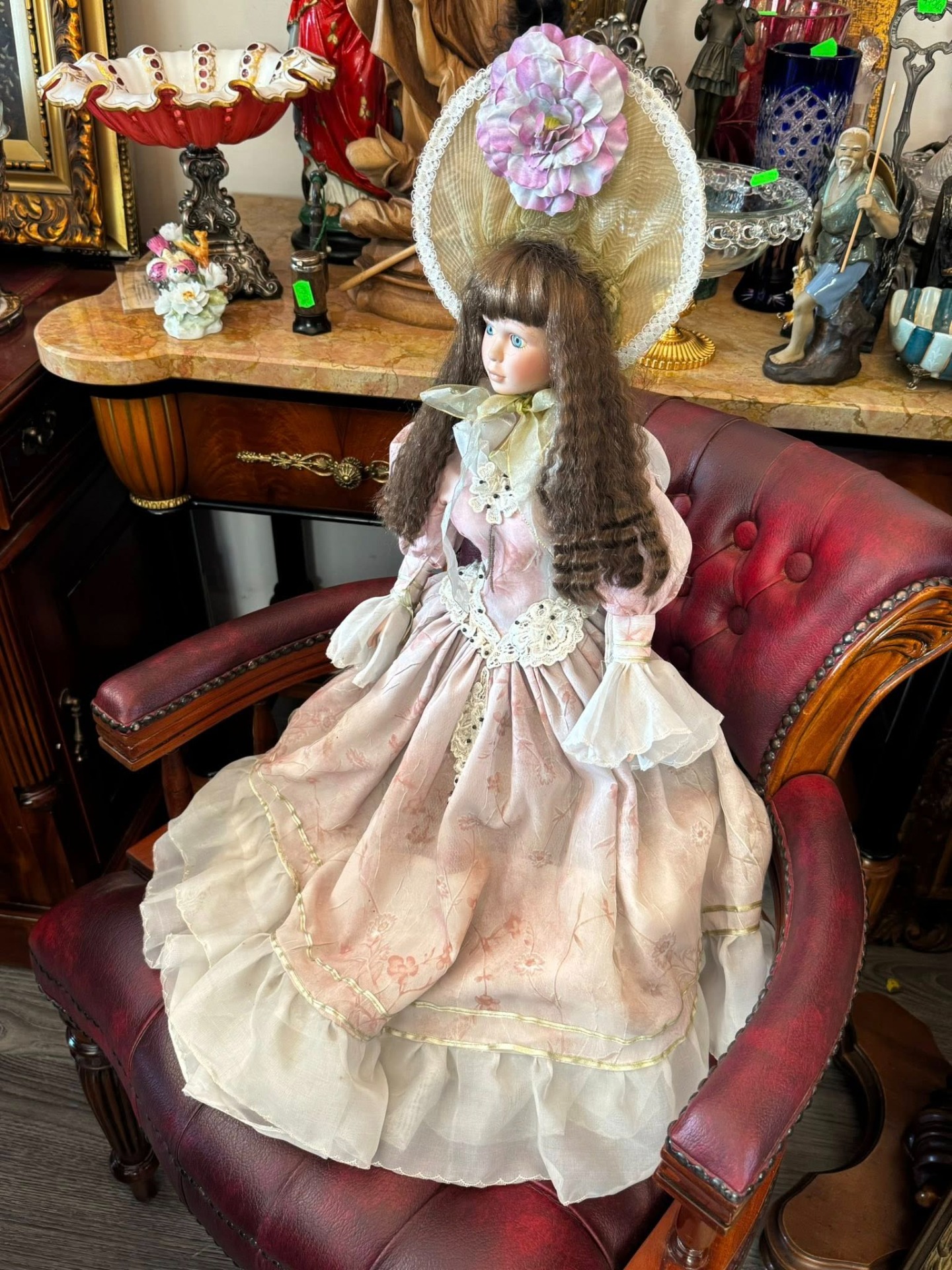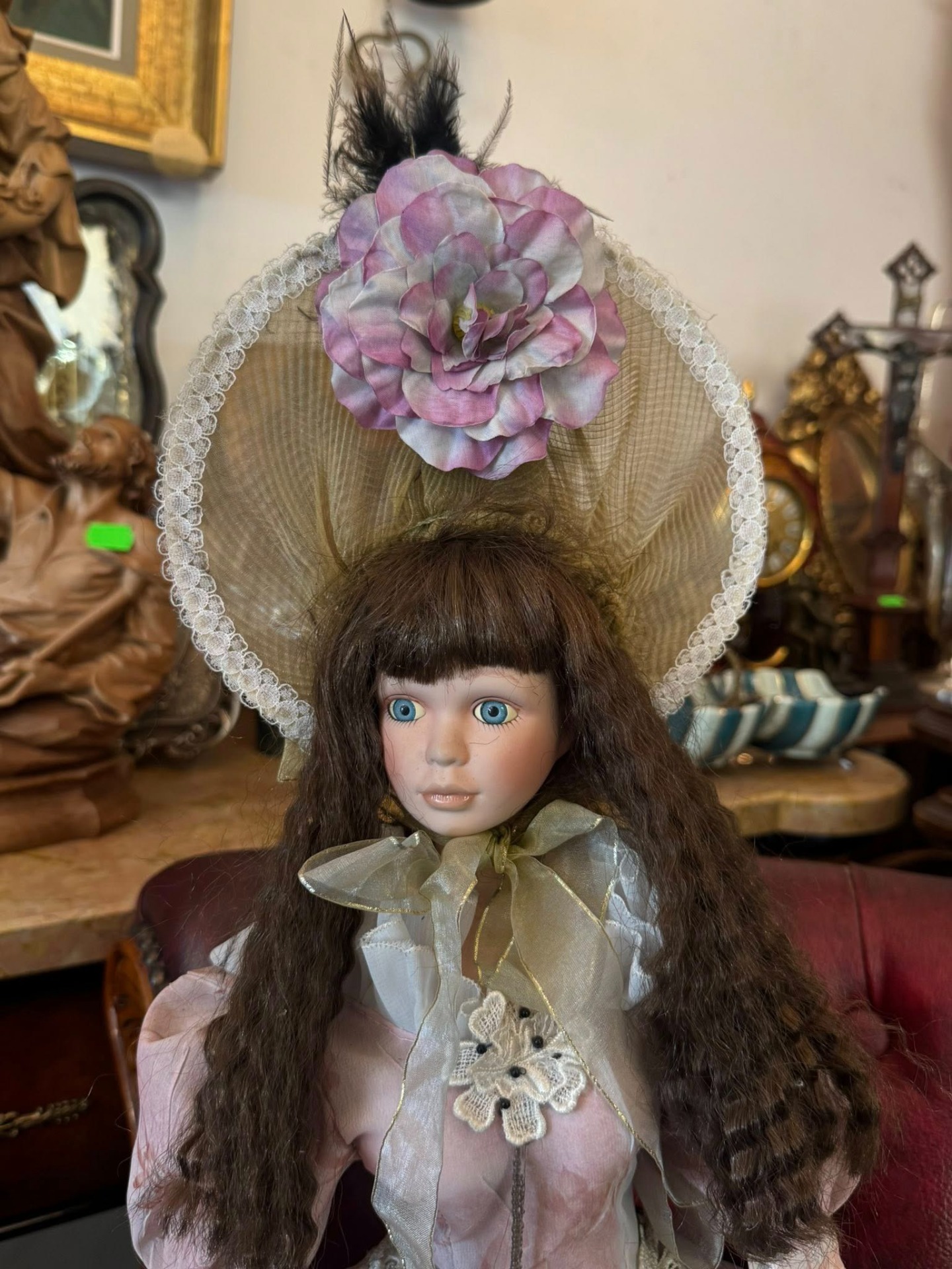 Păpușă de colecție din porțelan, realizată într-un stil victorian, de epocă, ce emană o eleganță nostalgică. Este o piesă elaborată, cu multiple straturi, realizată din materiale precum satin, organza și dantelă. Culoarea este un roz prăfuit (dusty rose) cu motive florale discrete.