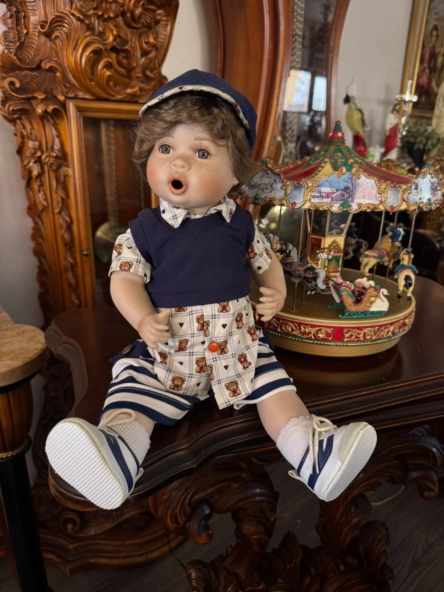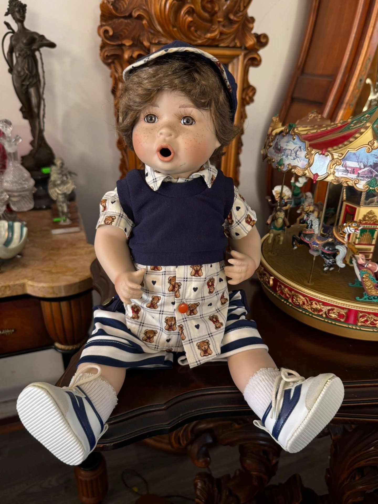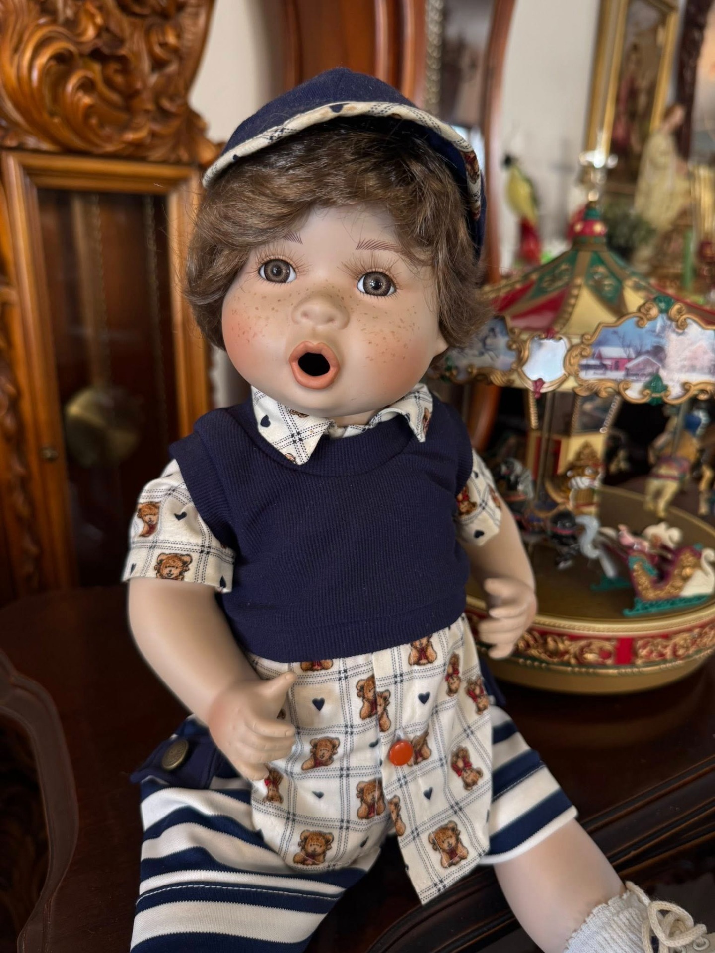 Păpușă de colecție din porțelan, reprezentând un băiețel cu trăsături foarte expresive.