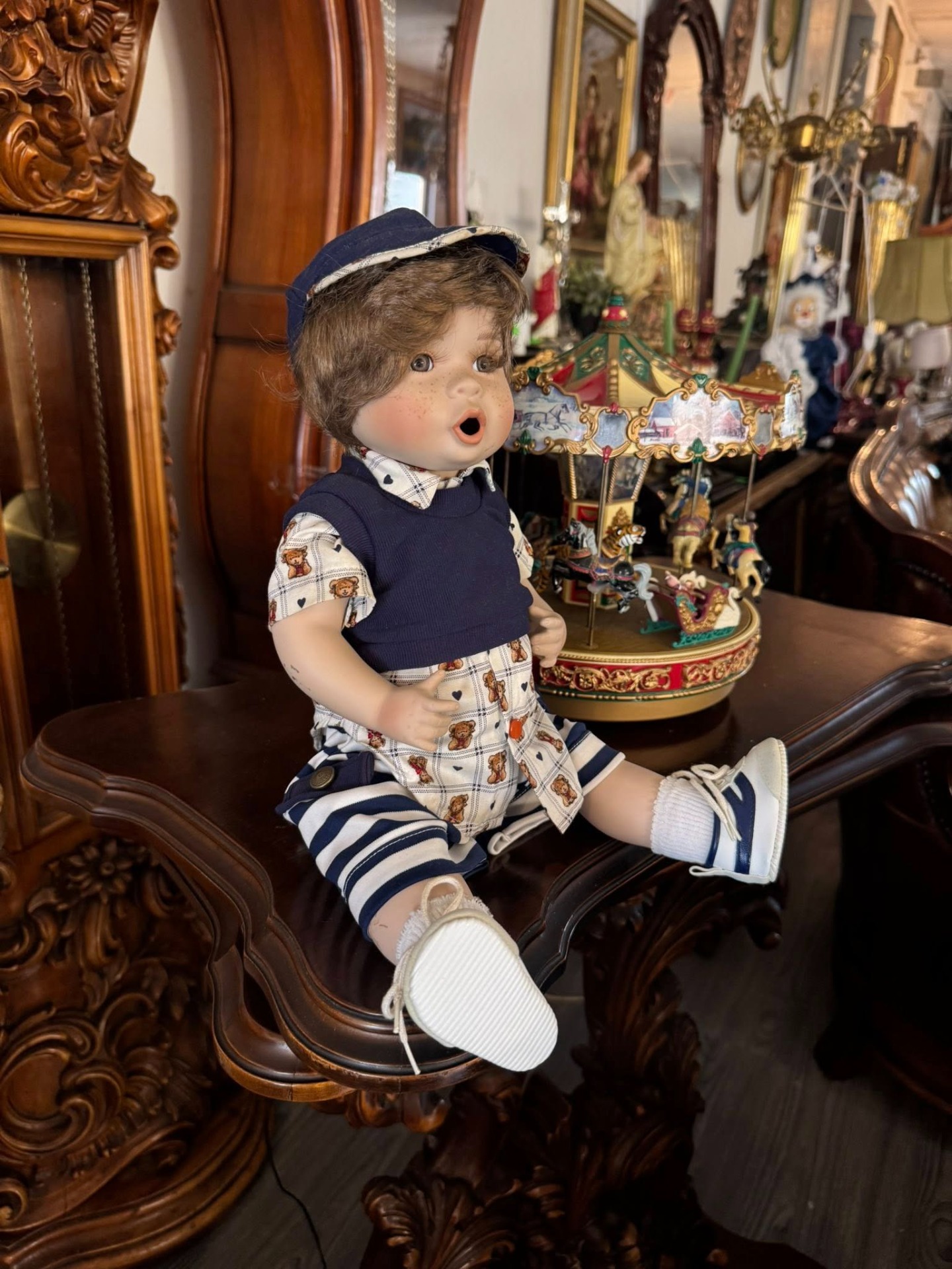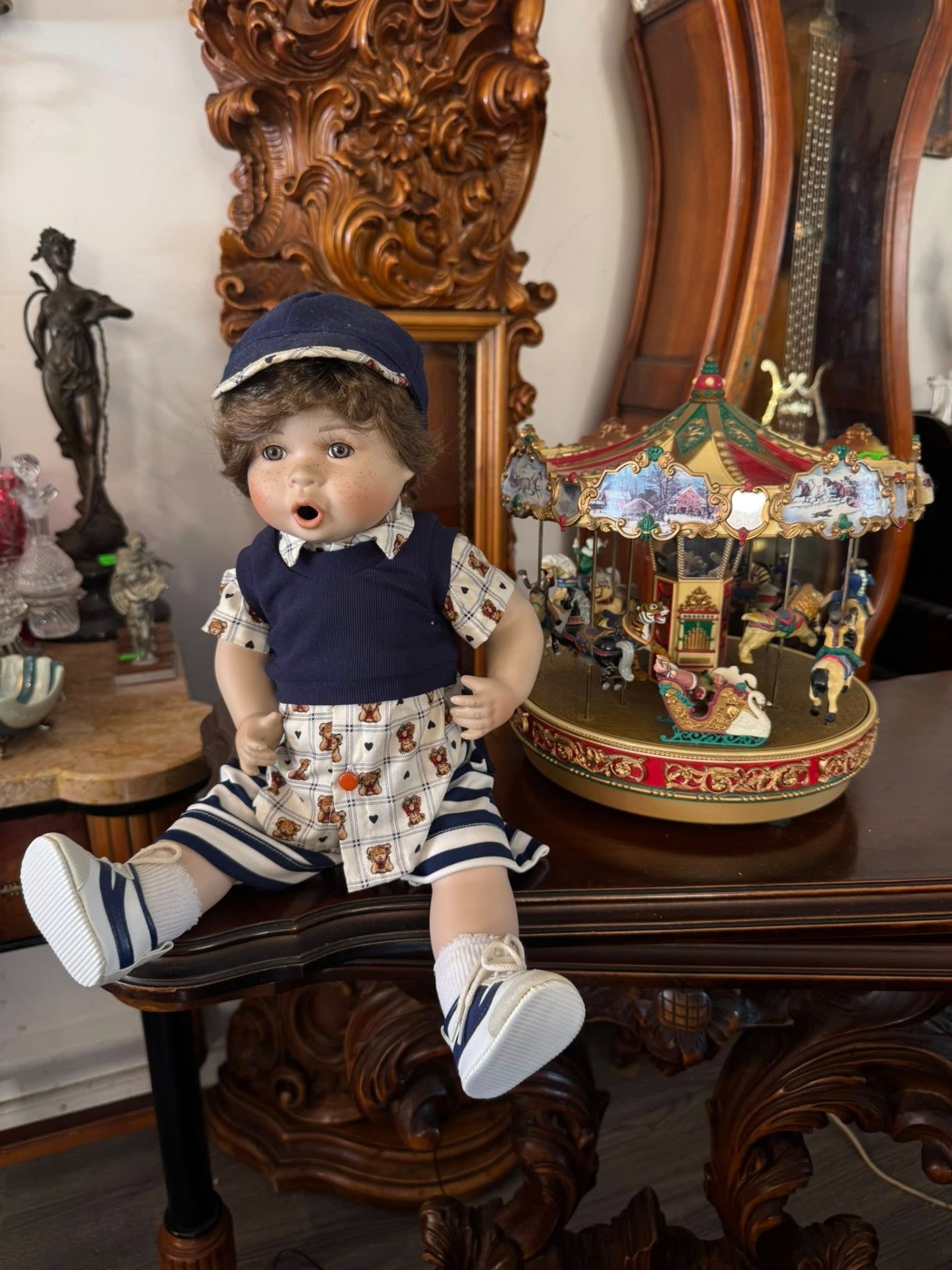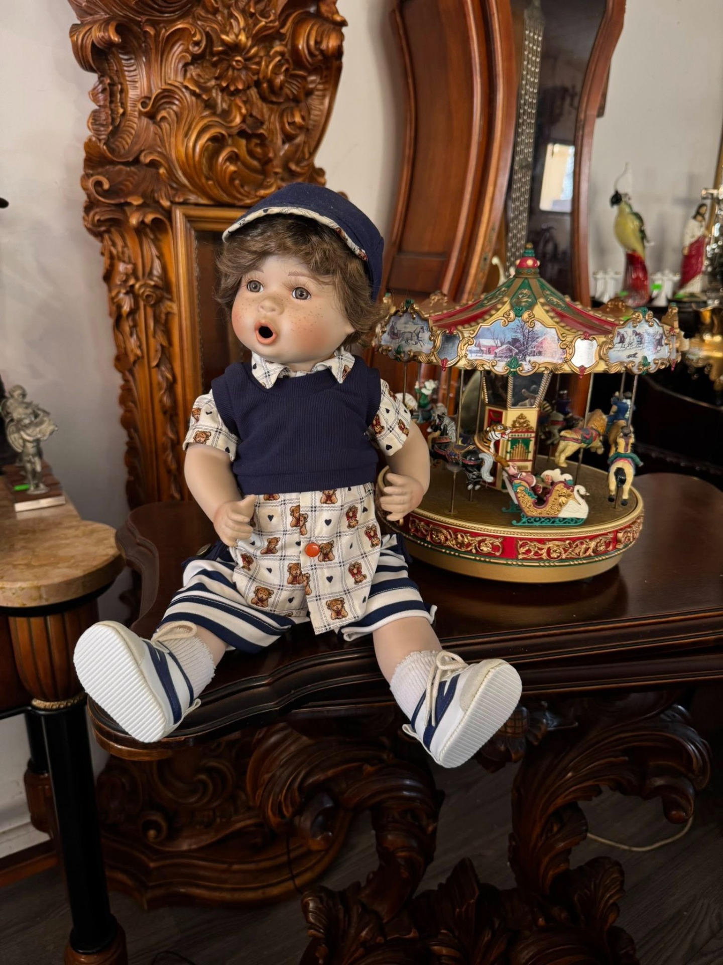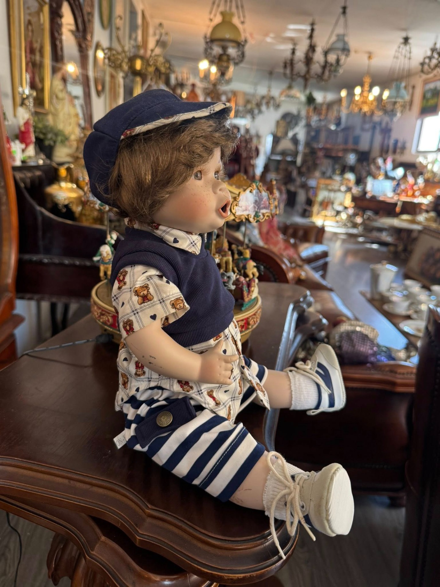 Păpușă de colecție din porțelan, reprezentând un băiețel cu trăsături foarte expresive.