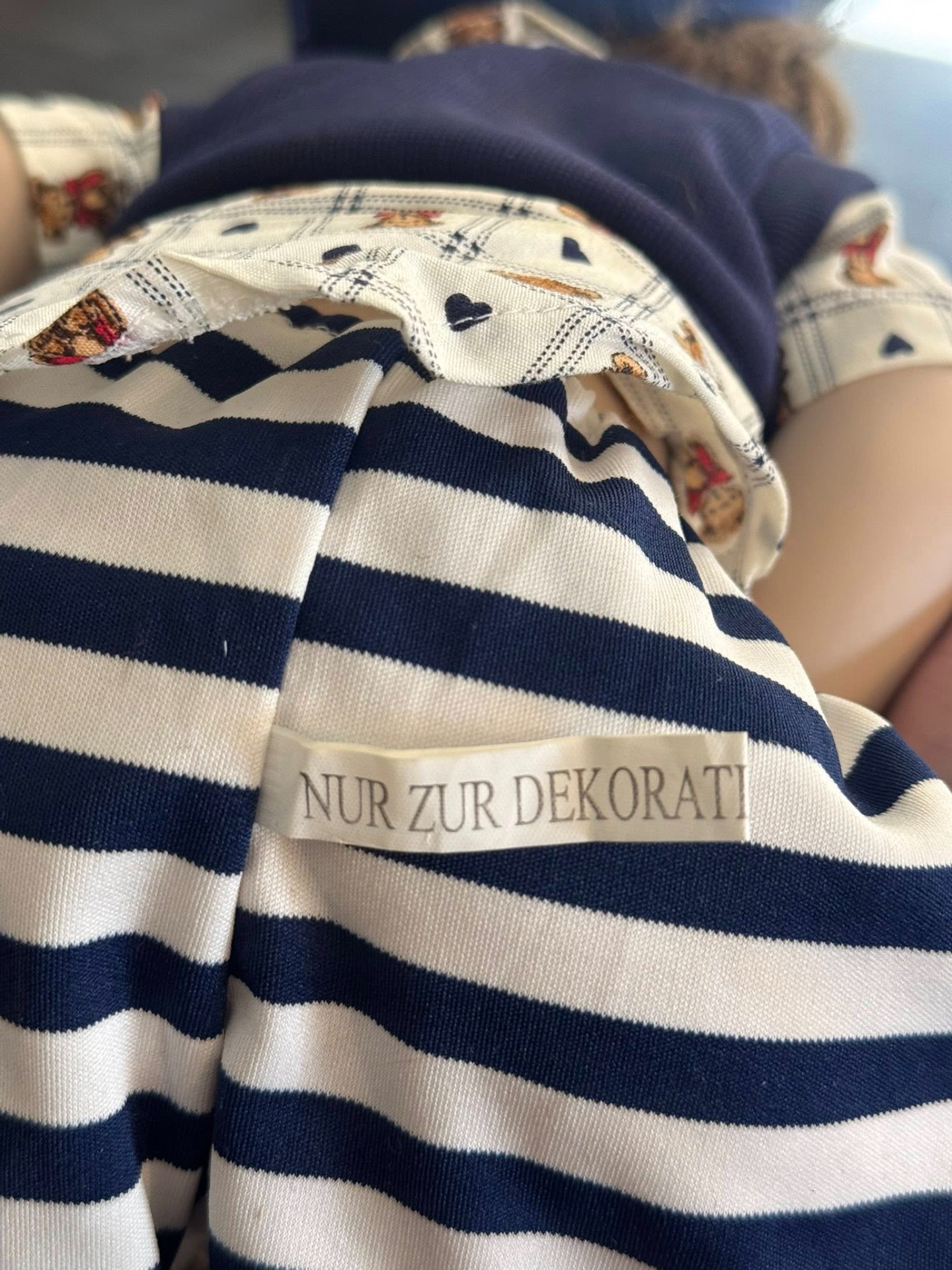 Capul, brațele și picioarele sunt realizate din porțelan mat (bisque), oferind pielii un aspect catifelat. Corpul este moale, din material textil, pentru a permite așezarea păpușii în poziție șezând.