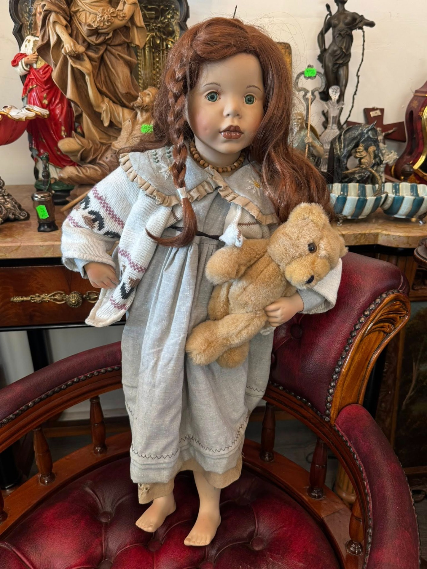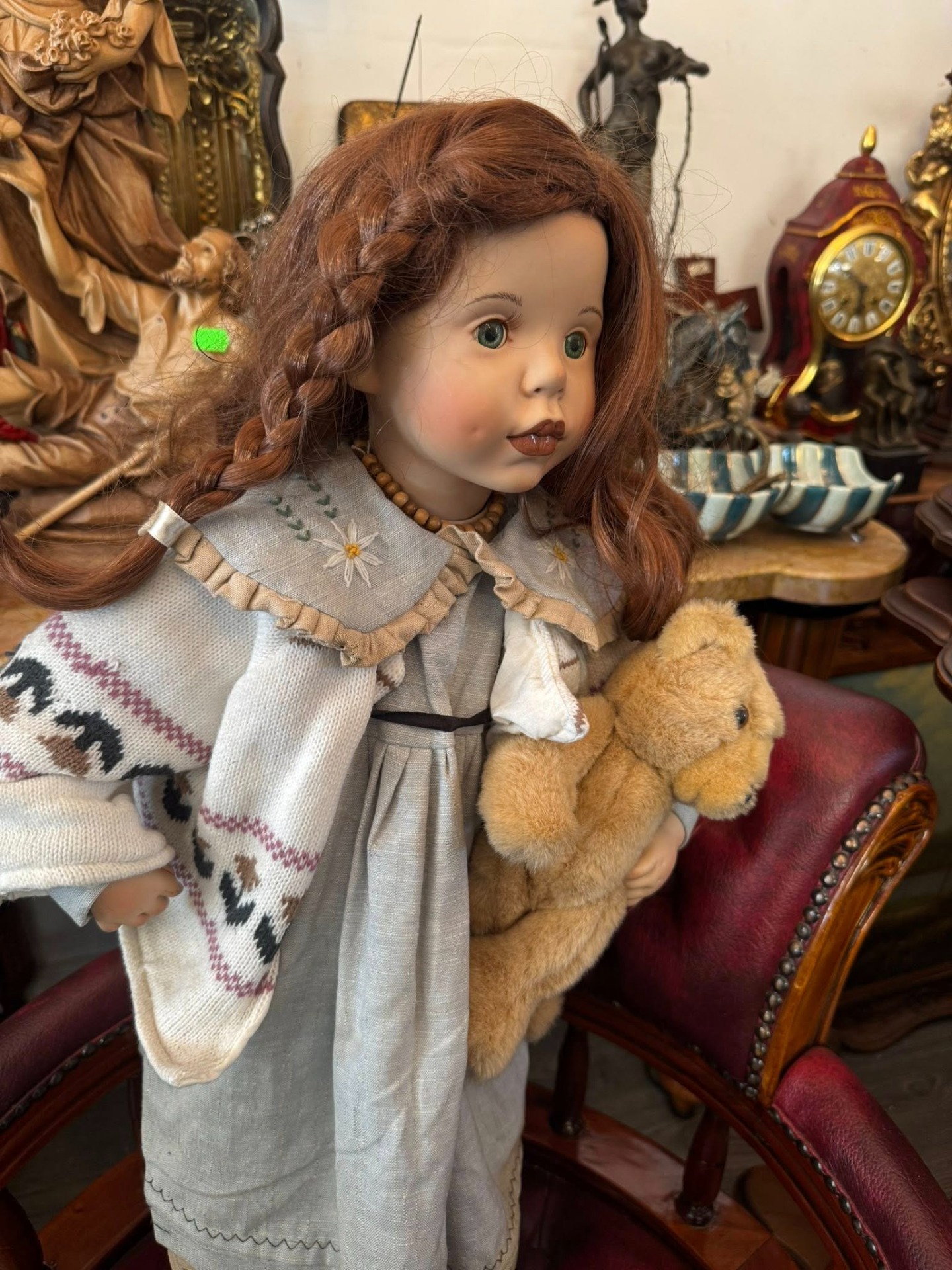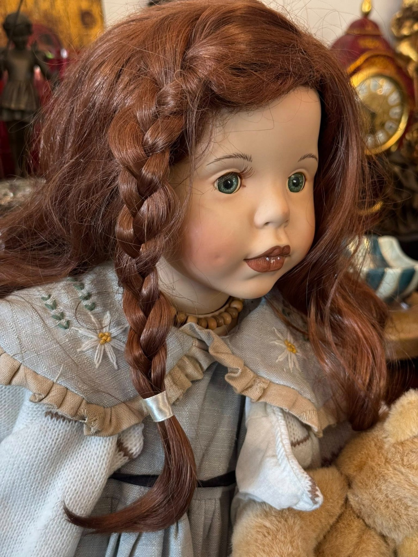Păpușă de colecție realizată artistic din porțelan, remarcabilă prin detaliile sale realiste și stilul melancolic.