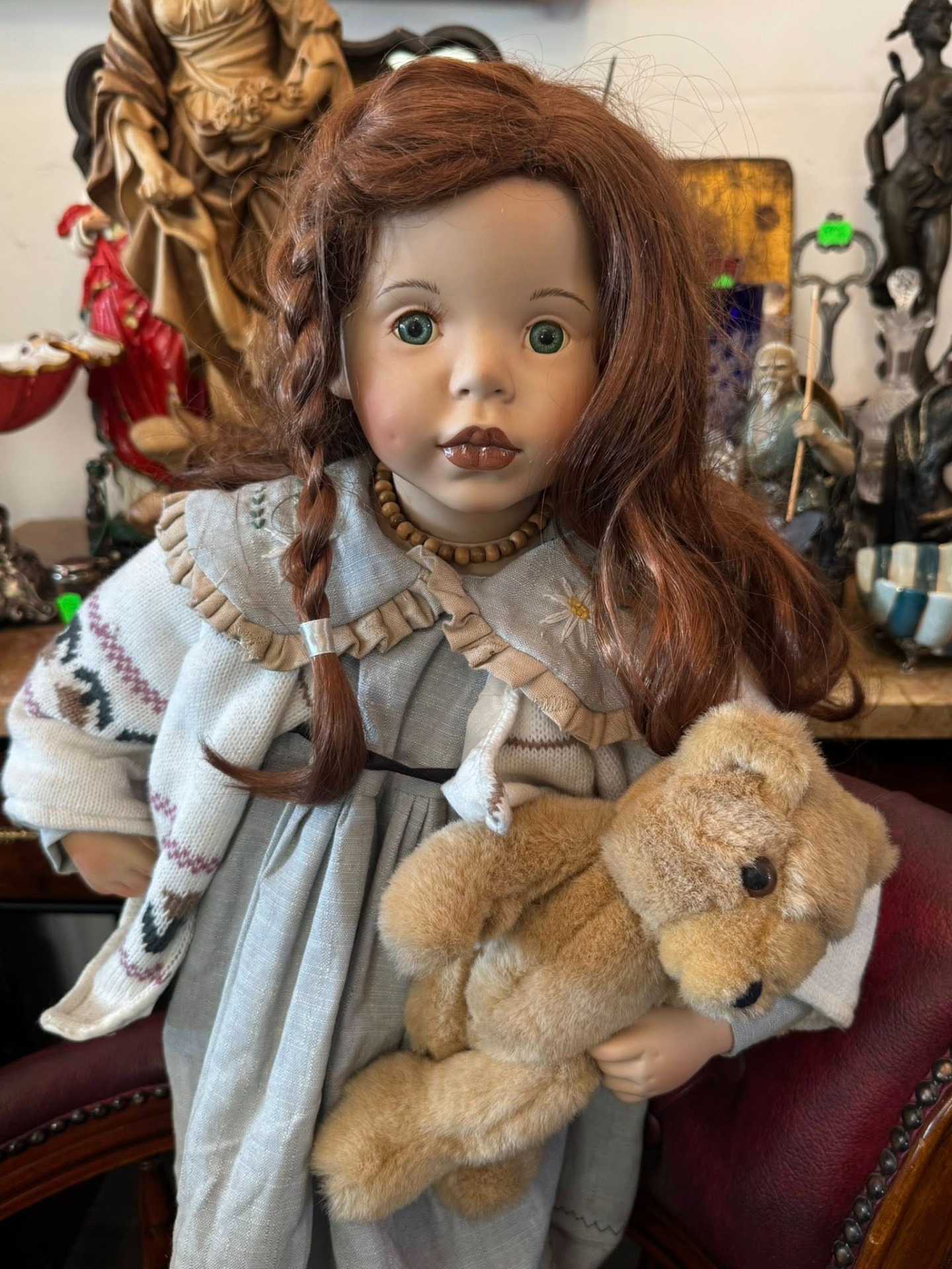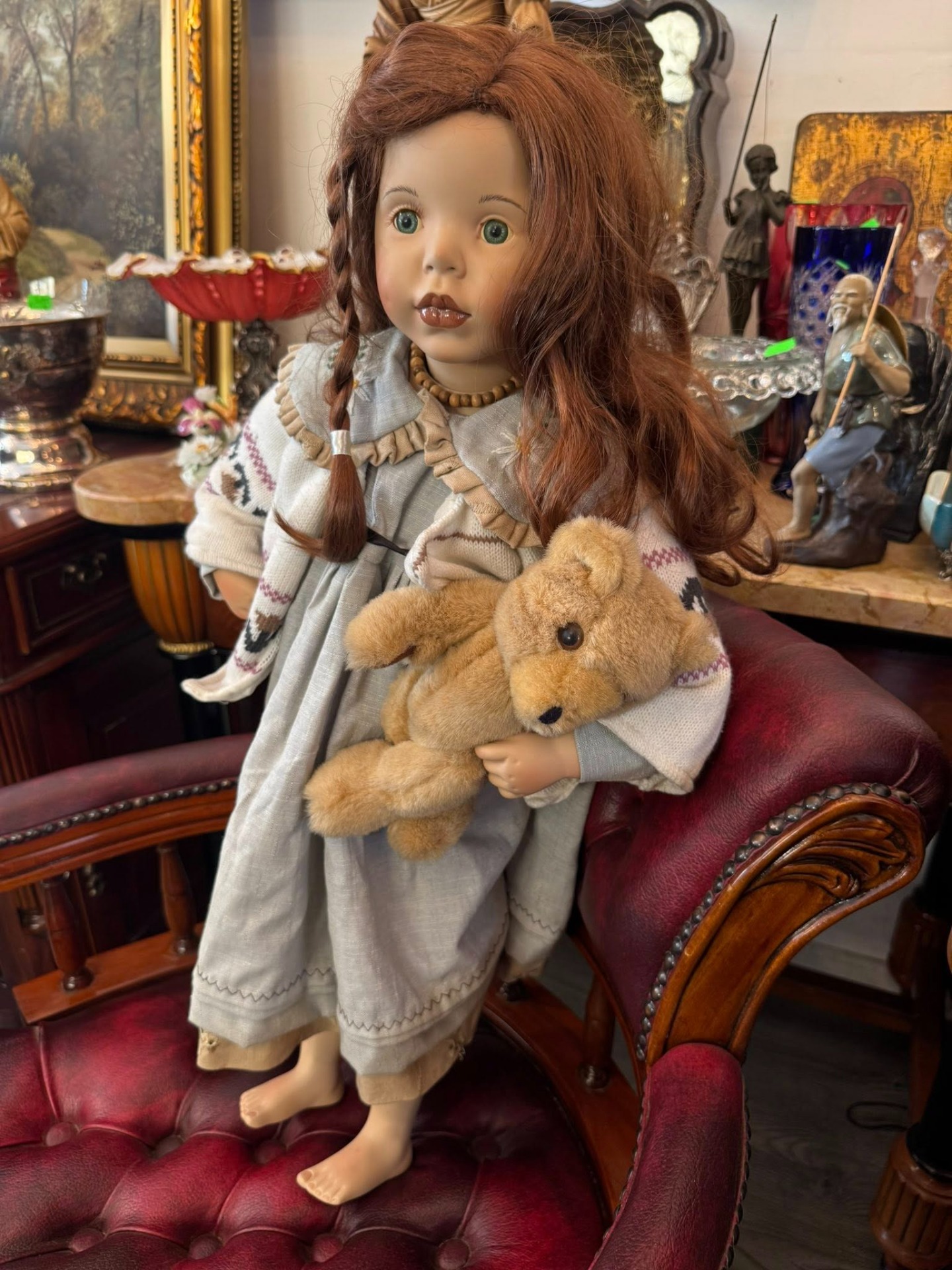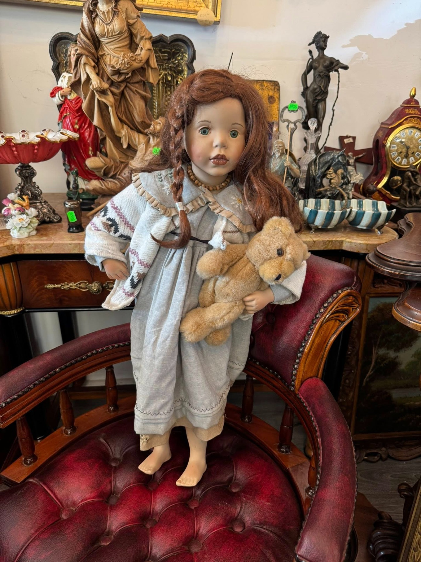 Păpușă de colecție realizată artistic din porțelan, remarcabilă prin detaliile sale realiste și stilul melancolic.