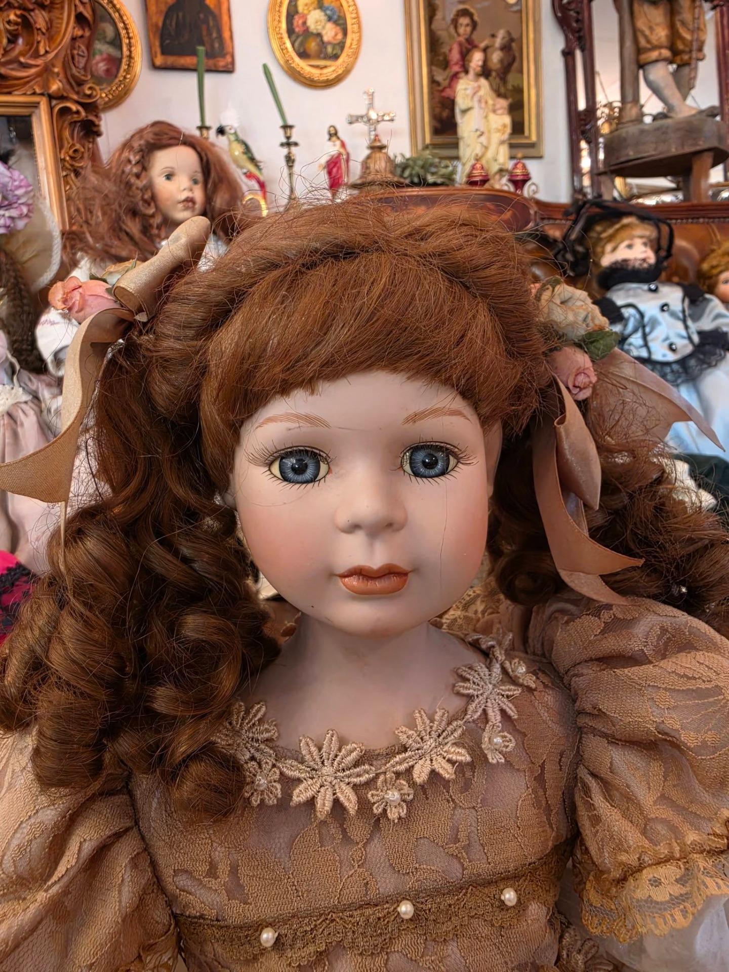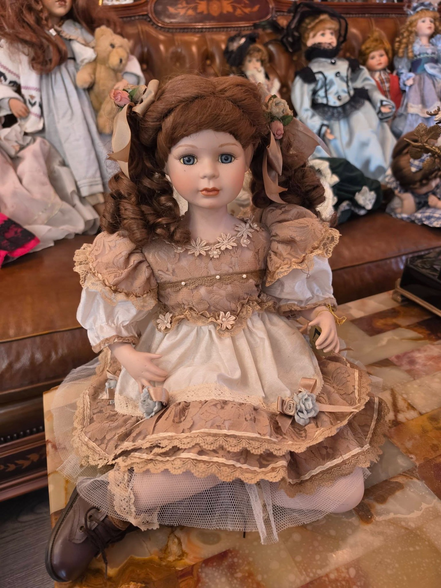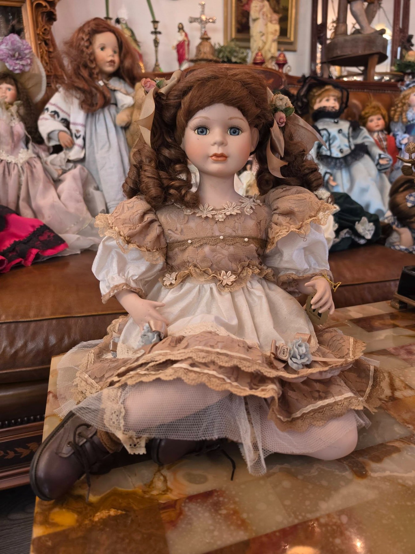 Păpușă decorativă deosebită, din colecția Reinart Faelens, realizată în stil clasic vintage, cu detalii fine și expresie realistă.