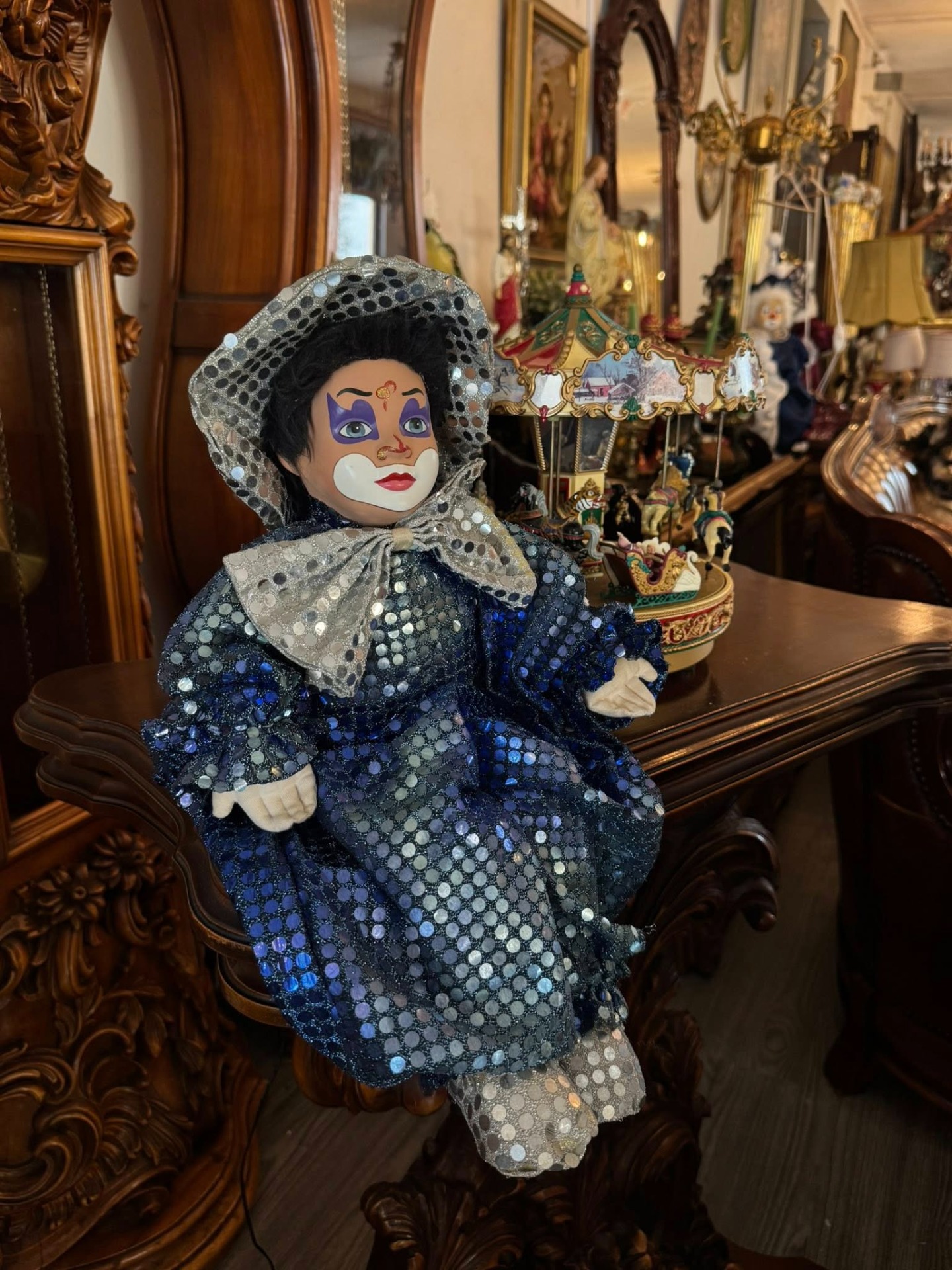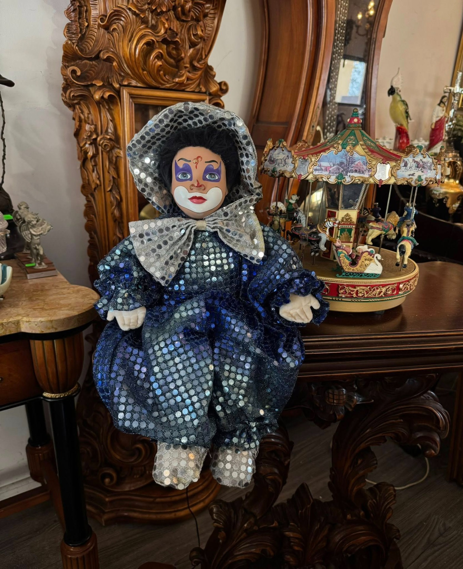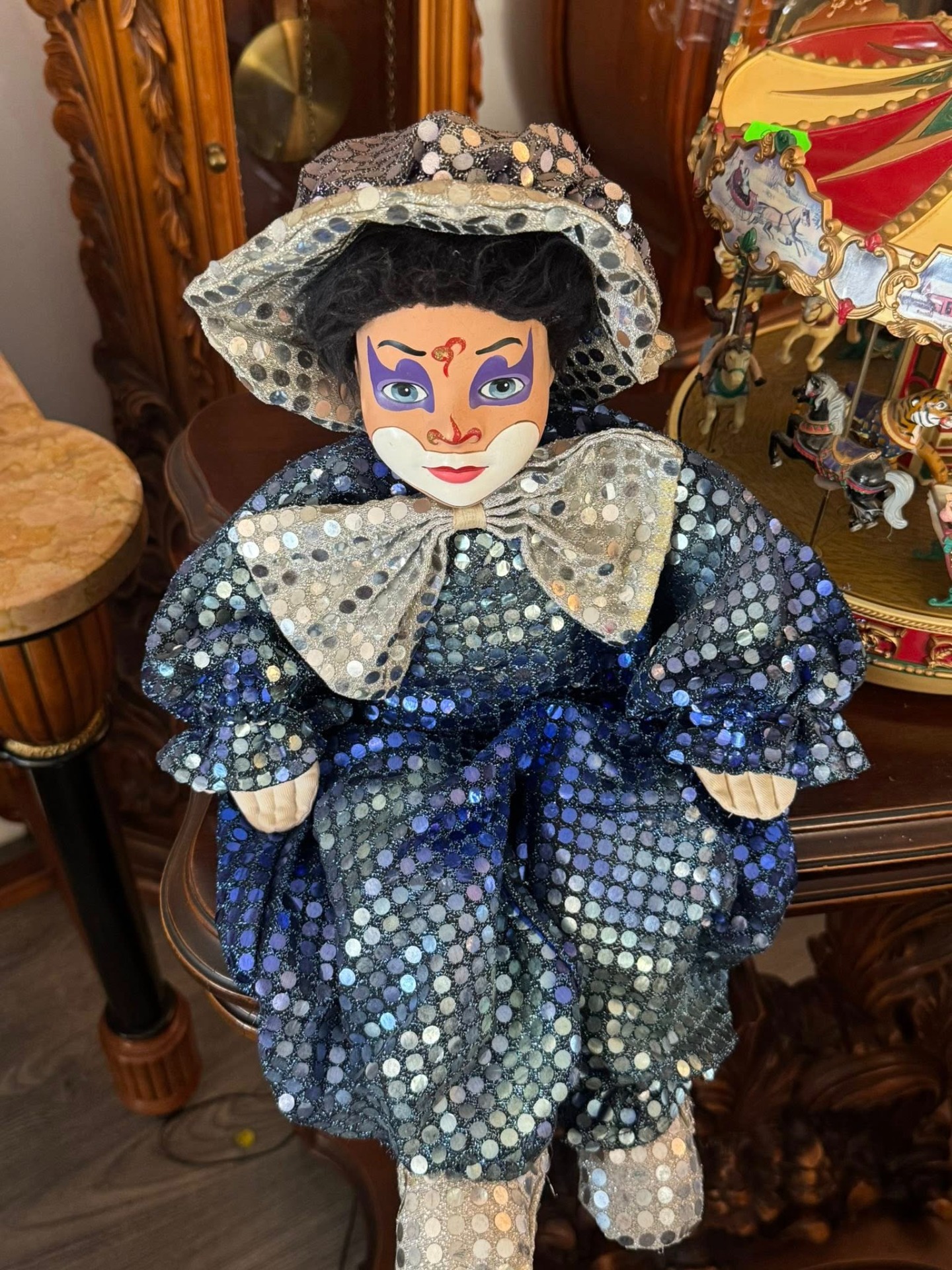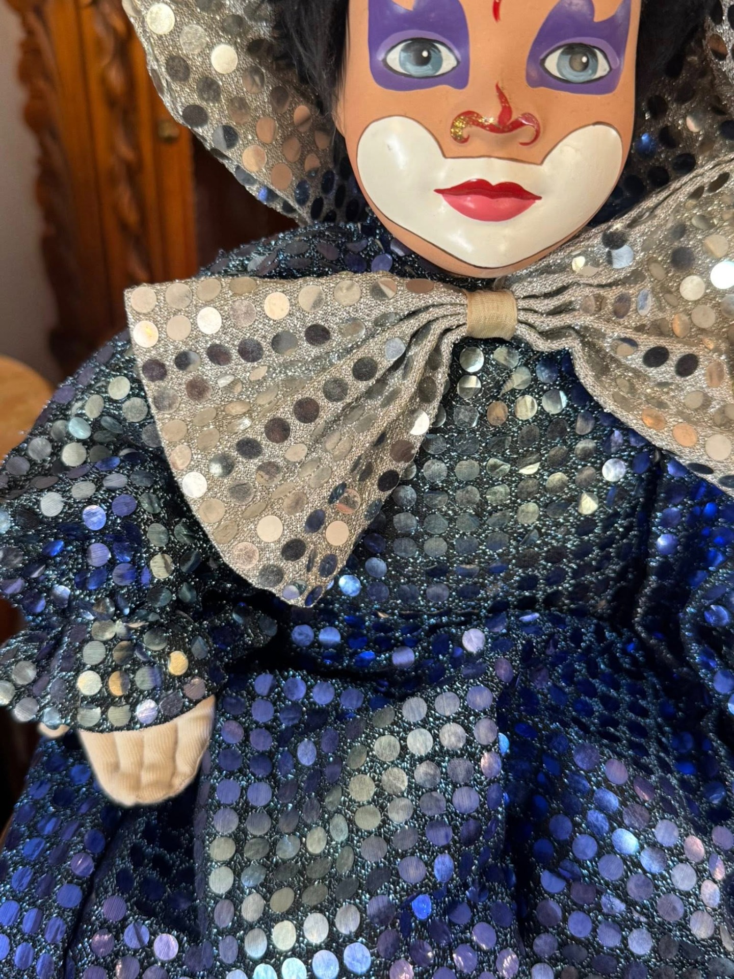 Păpușă de colecție tip Clovn. Capul este realizat din porțelan pictat,