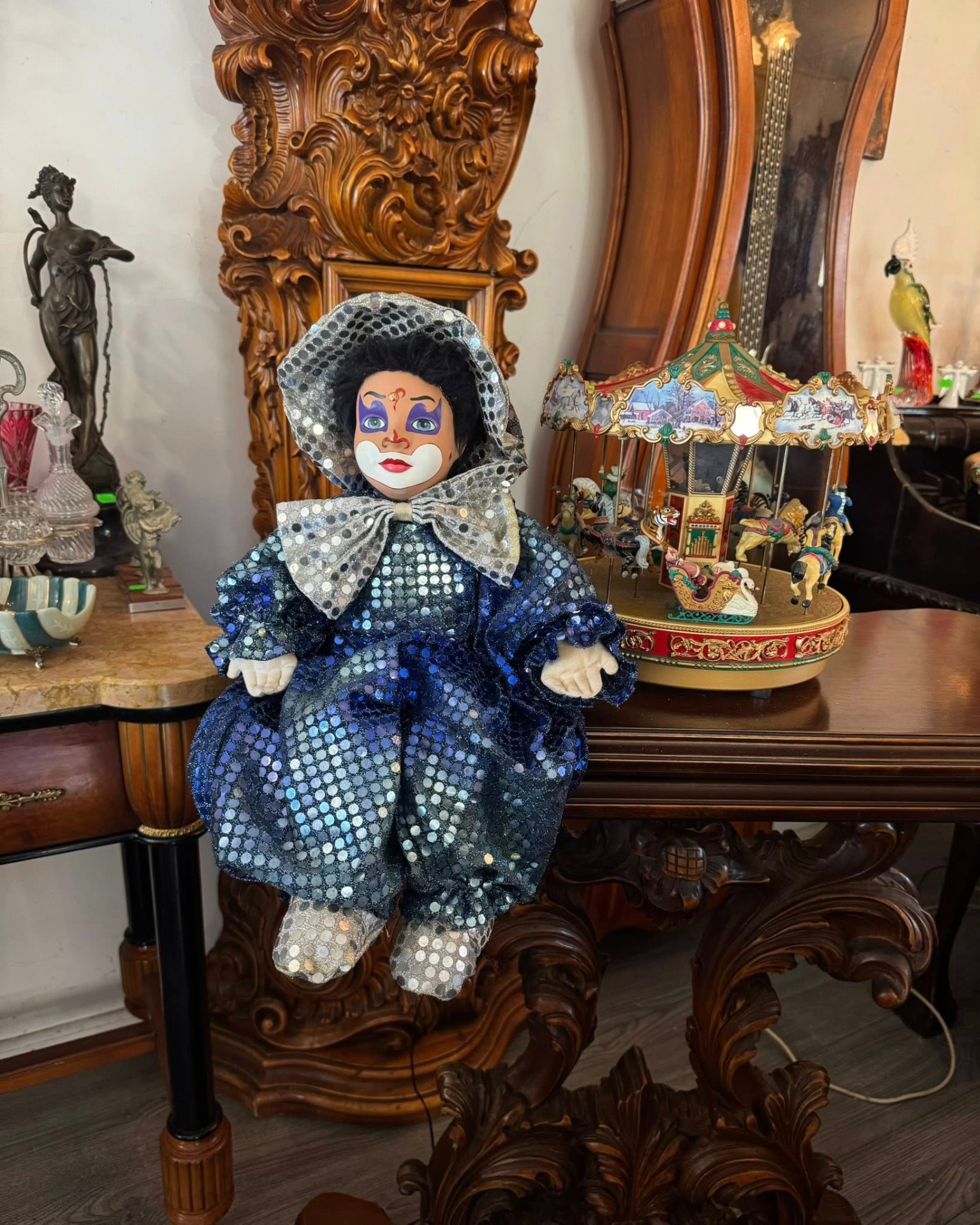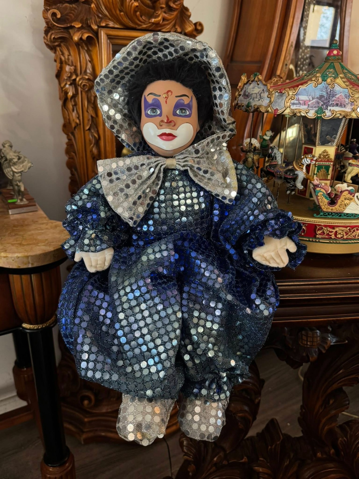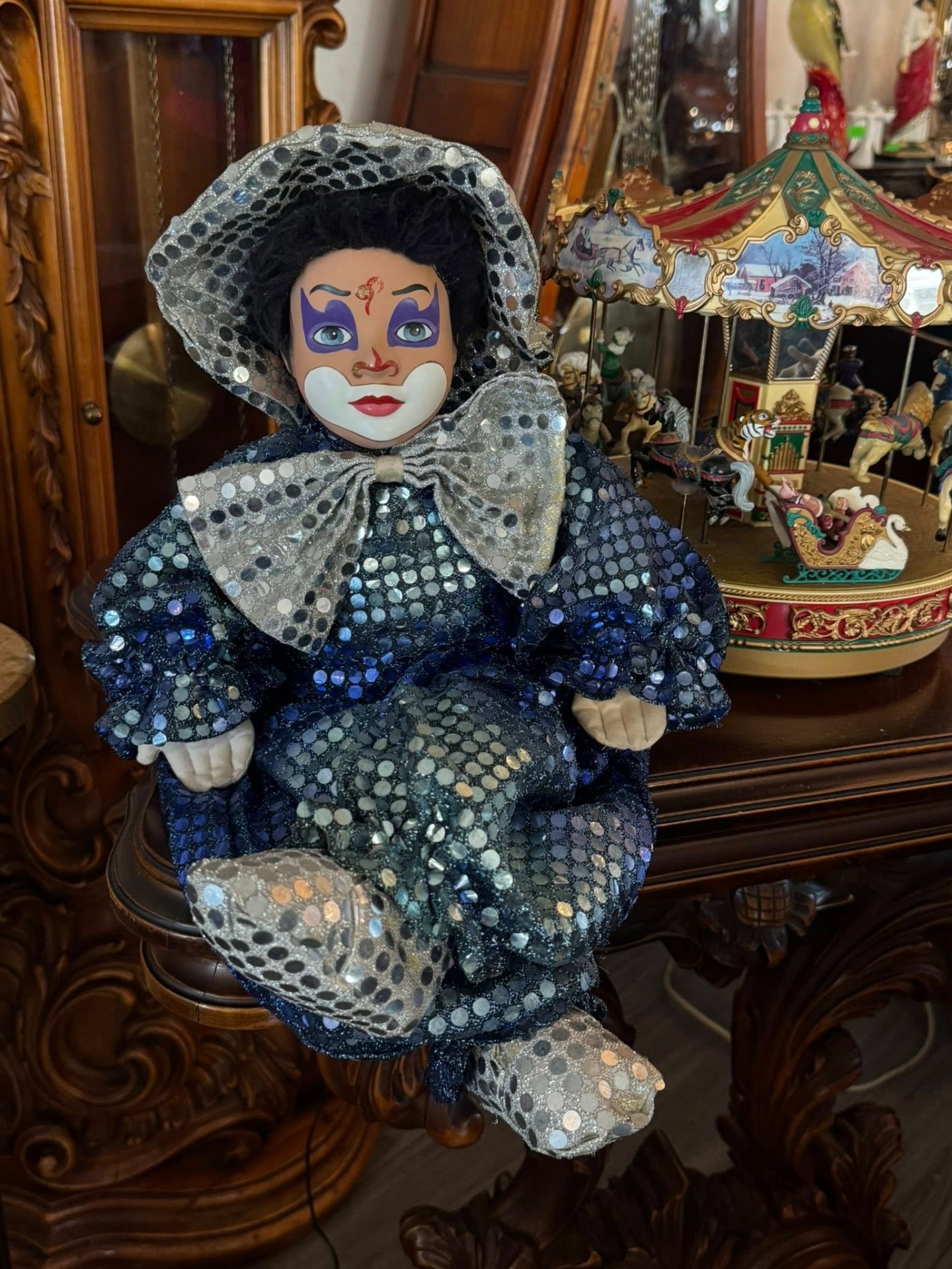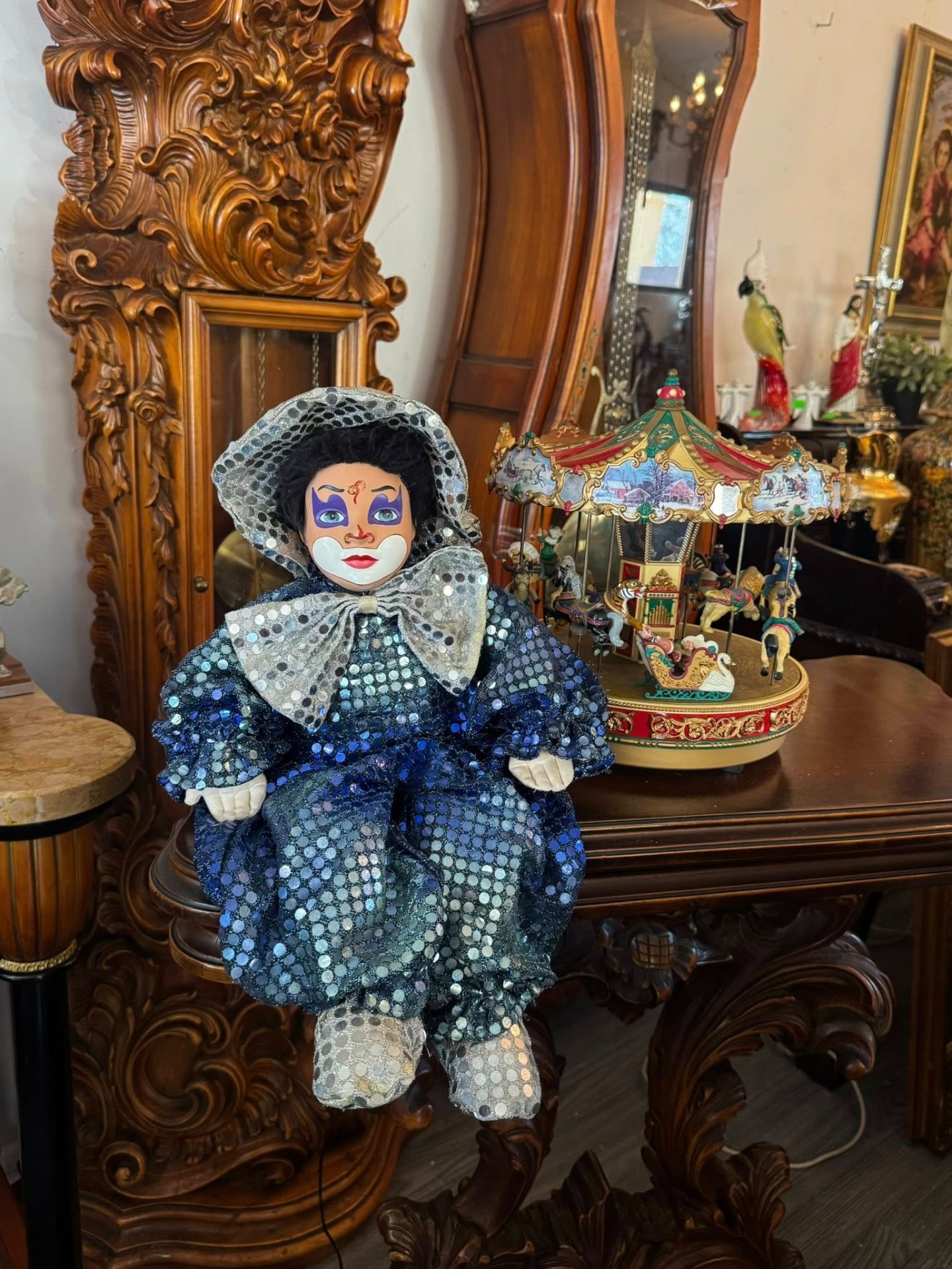 Păpușă de colecție tip Clovn. Capul este realizat din porțelan pictat,
